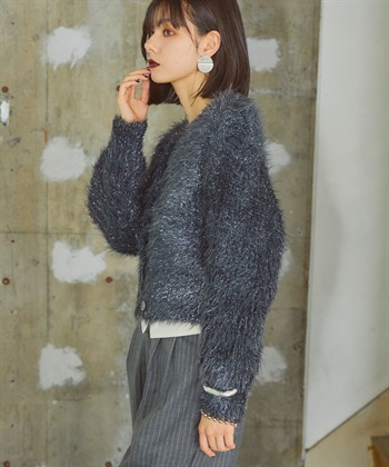 毛足の長いフェザーヤーンとラメ糸をMIXした存在感たっぷりのアイテム。