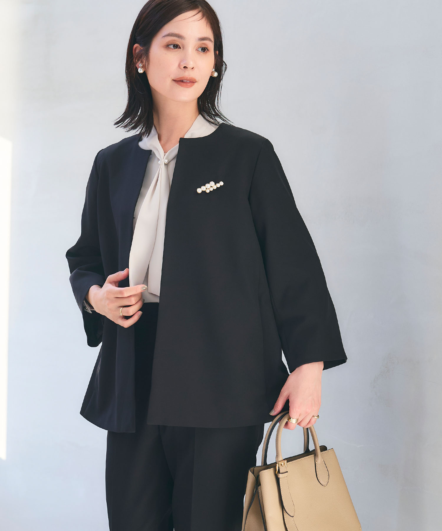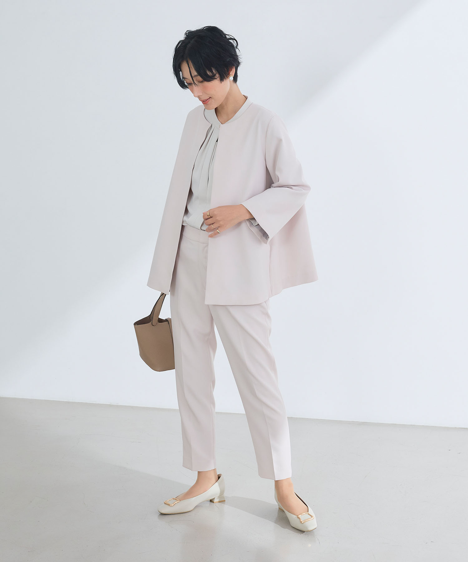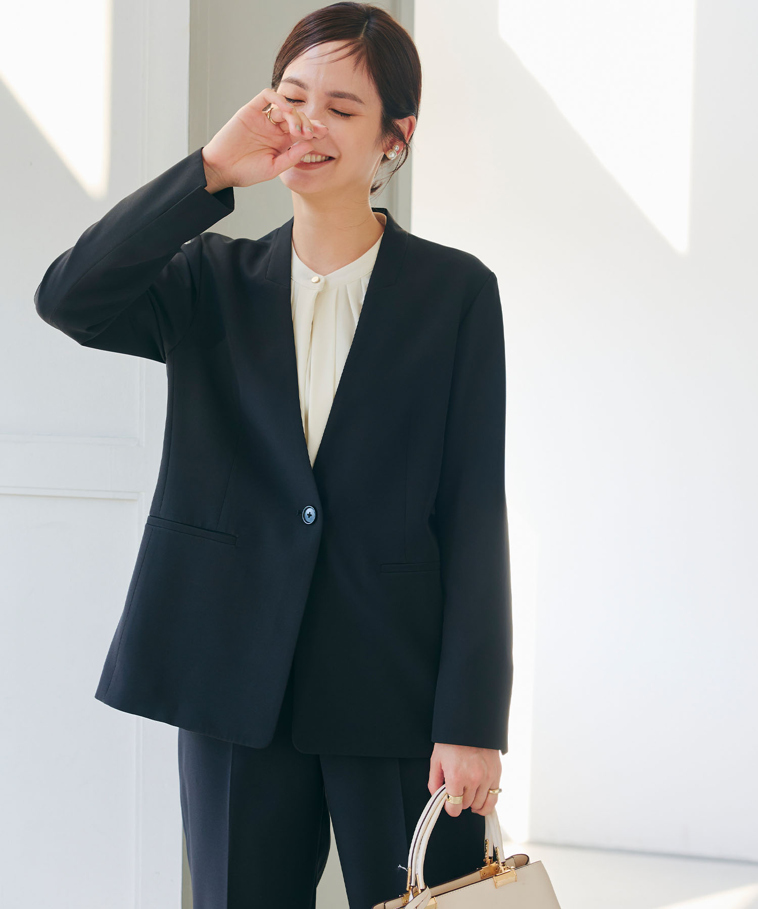《洗える・シワになりにくい》2点セット 正解 ノーカラージャケット&テーパードパンツ ¥15,400(tax in)