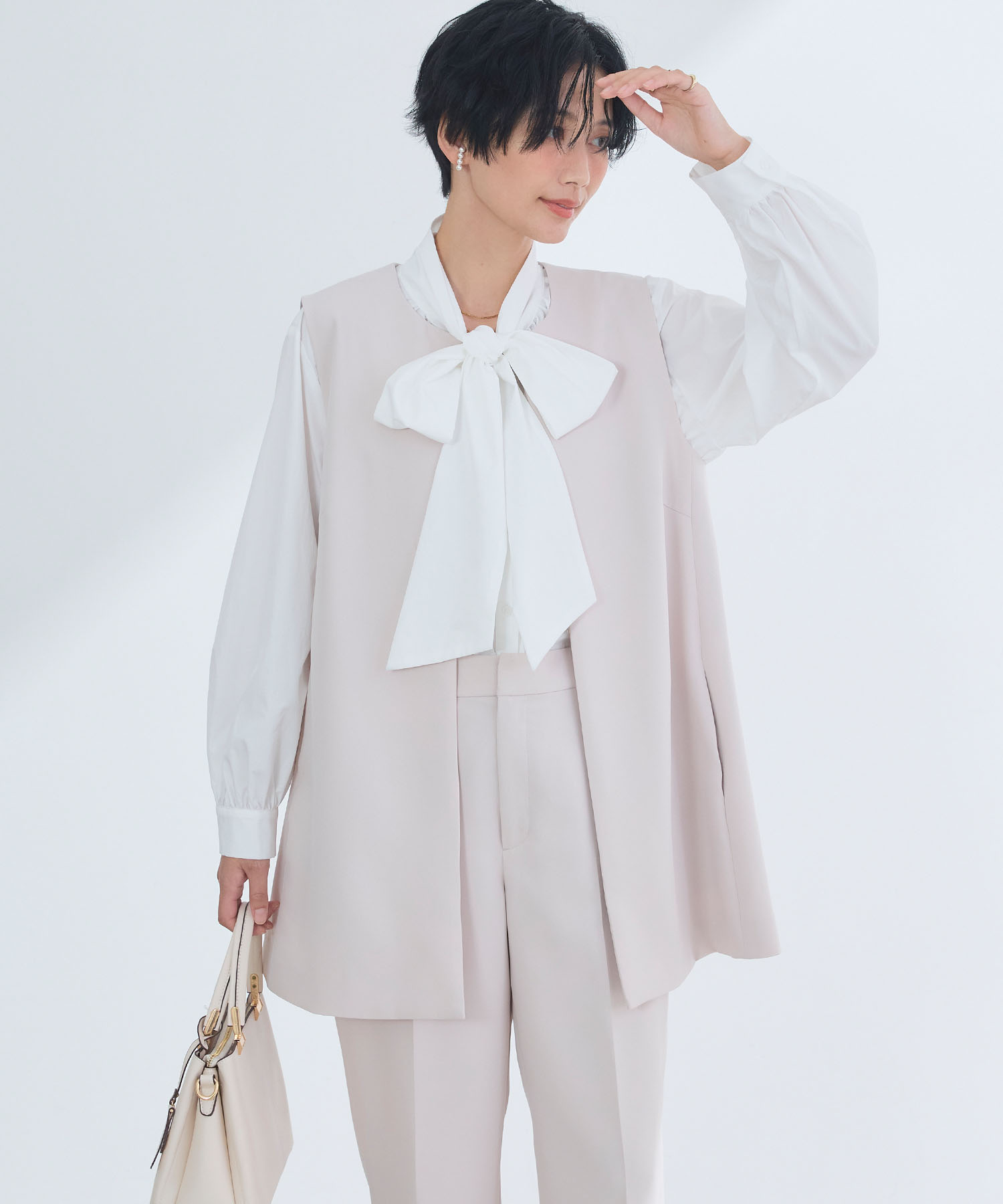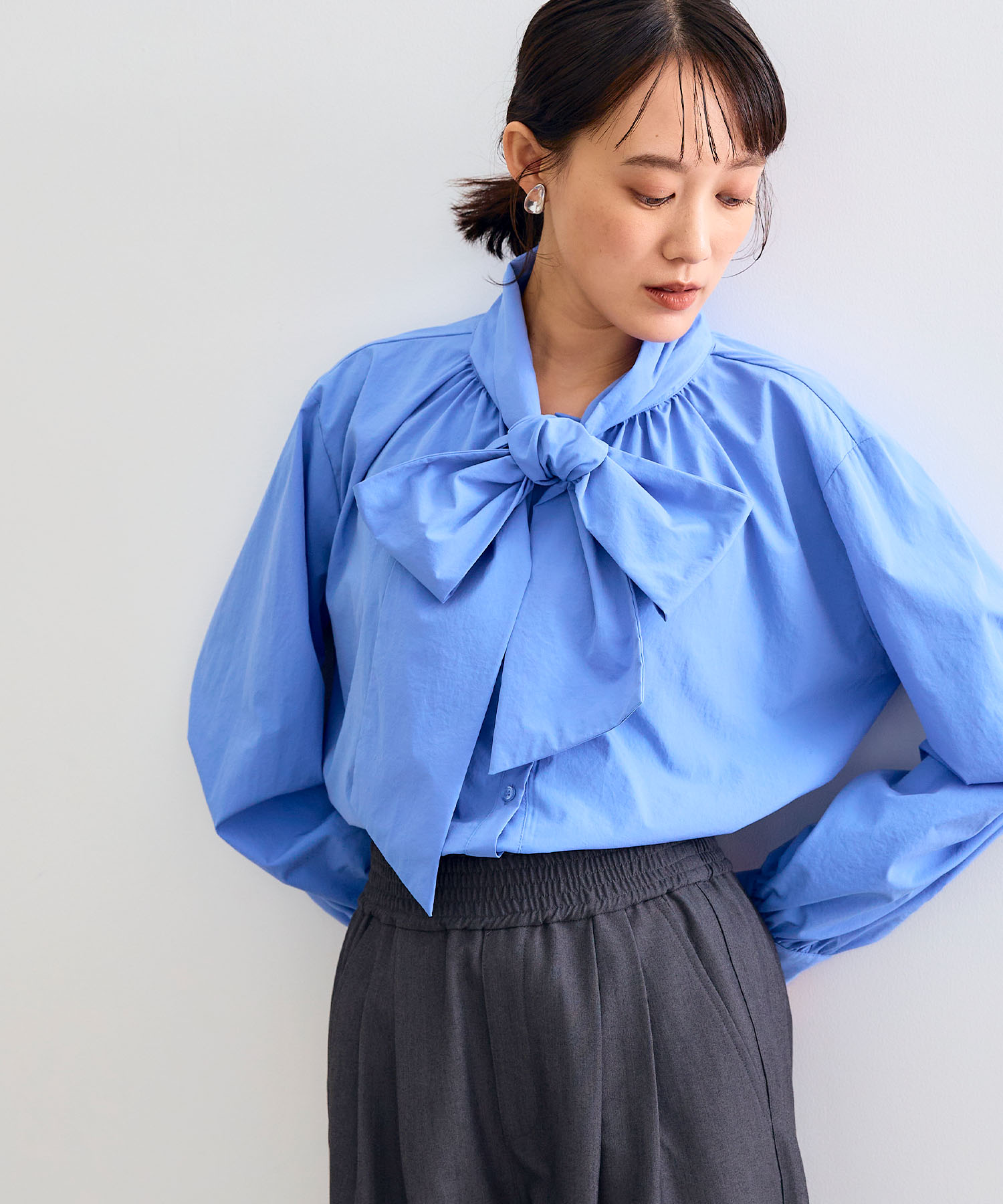 《シワになりにくい》シルキーサテンパールボウタイブラウス ¥3,960(tax in)