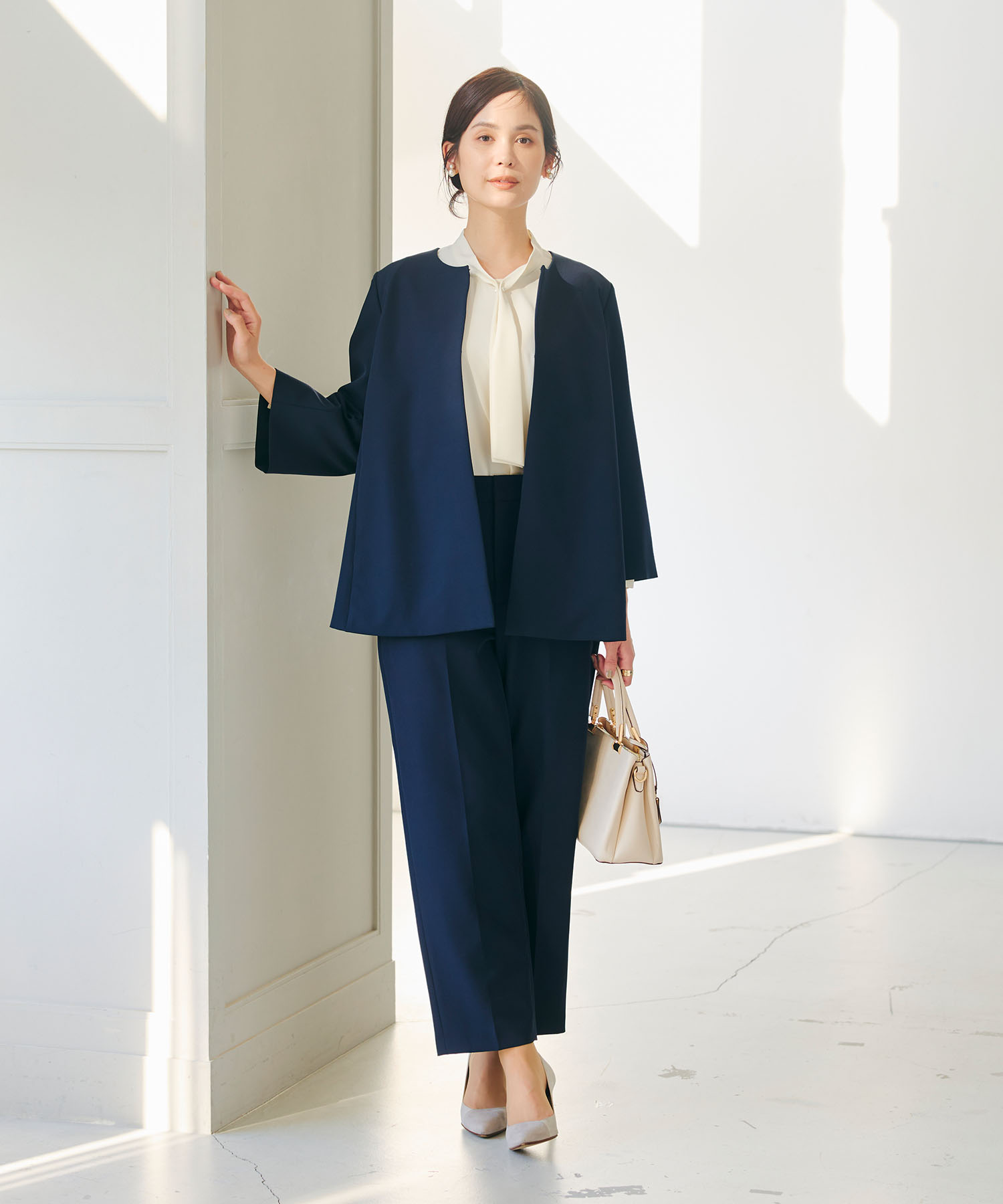 《洗える・シワになりにくい》2点セット 正解 ノーカラージャケット&ワイドパンツ ¥15,400(tax in)