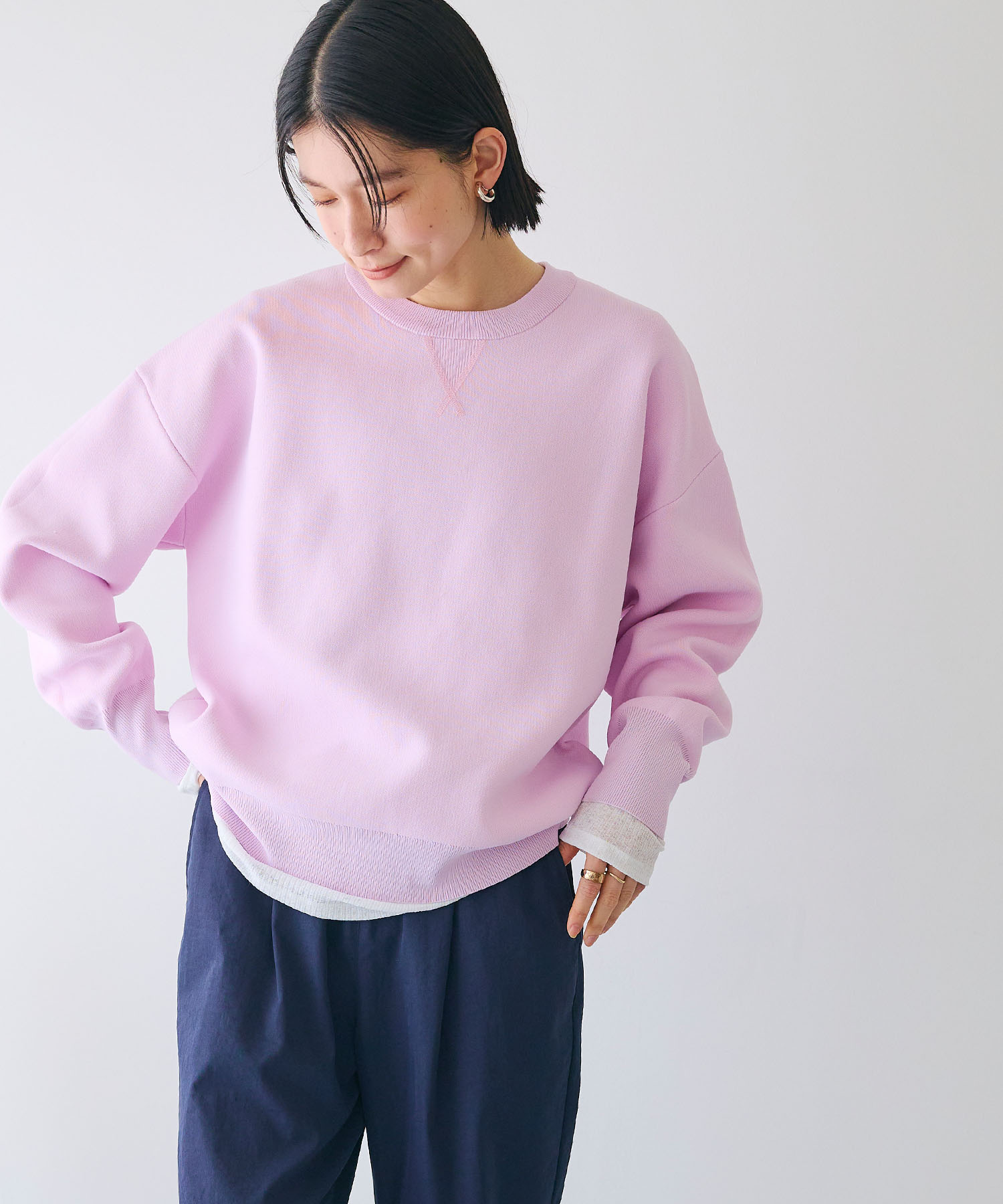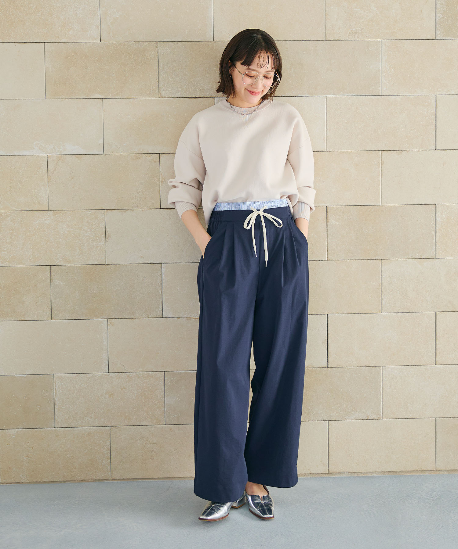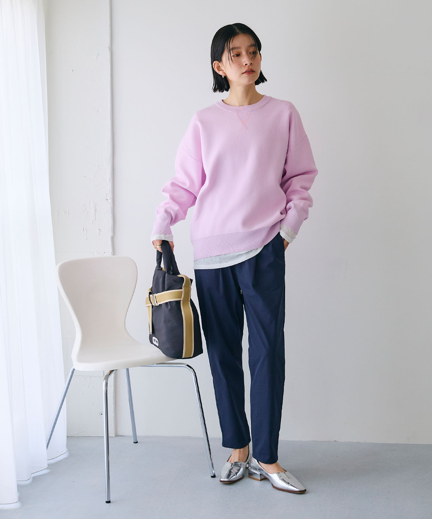 程よく立体感のあるスウェットライクニットに、レイヤード風パンツを合わせたリラックス感とトレンドがMIXされたきれいめカジュアル。トップスの柔らかなフォルムとボトムのすっきりしたラインが、自然とスタイルを整えてくれます。シンプルな組み合わせでも今っぽさが叶い、最高気温20度の穏やかな日に心地よく着られる服装です。