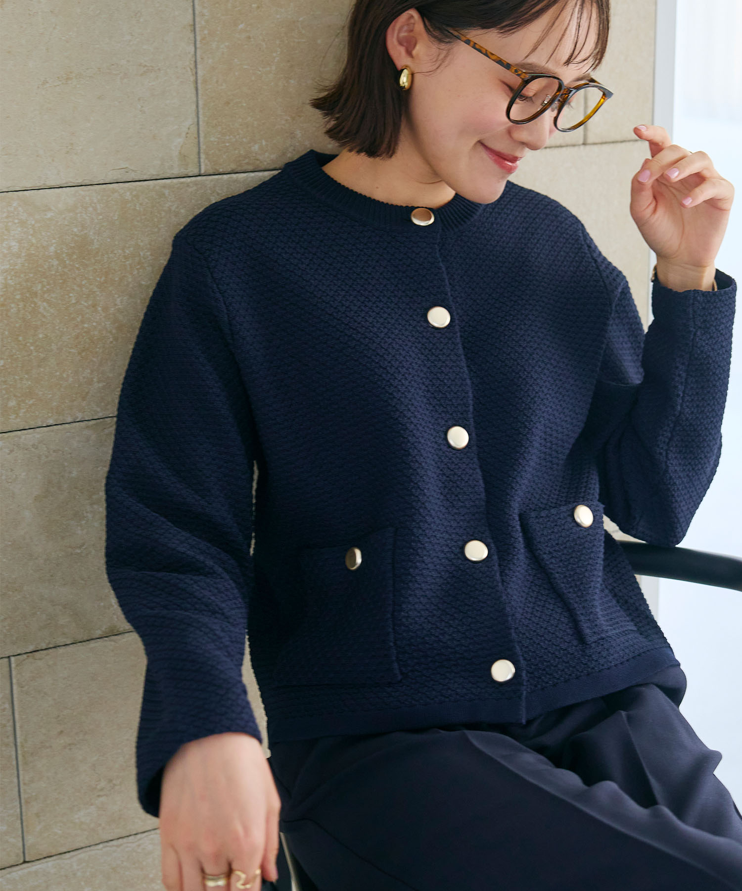 程よいハリ感のあるダンボール素材を使用したカーディガンは、軽やかな着心地で最高気温20度の日にも取り入れやすいアイテム。さっと羽織るだけでシルエットが整い、体のラインを拾いにくいのも嬉しいポイントです。UVカット機能付きで日差し対策にも活躍し、季節の変わり目の温度調整が必要な服装に重宝します。