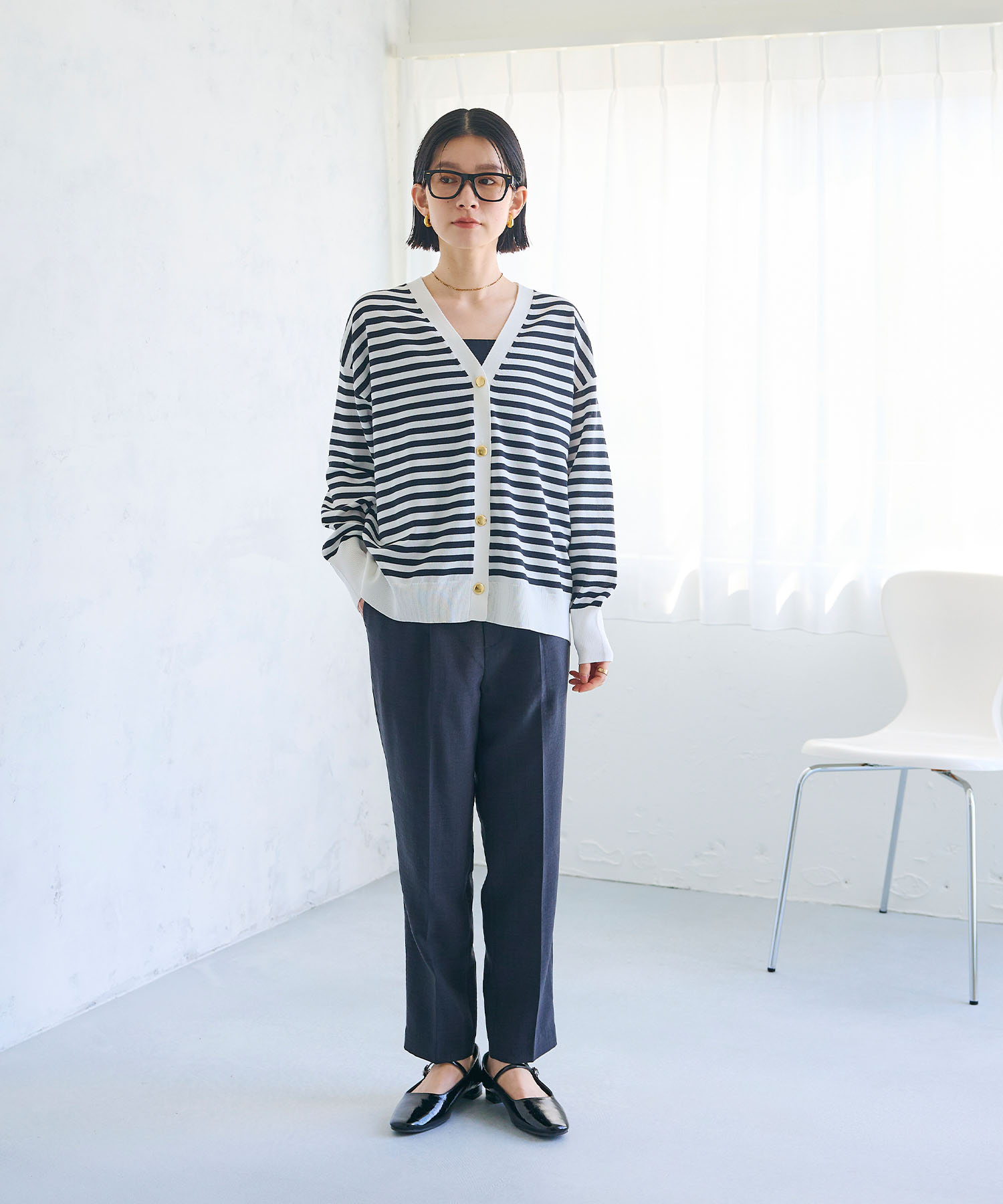 細めのボーダー柄に金ボタンをあしらったカーディガンは、カジュアルながらも上品な印象に仕上がる一枚。さらりとした肌ざわりで軽やかに着られるため、最高気温20度の日にも快適に過ごせます。程よくゆとりのあるシルエットで体のラインを拾いにくく、パンツにもスカートにも合わせやすく、大人の毎日の服装に活躍するアイテムです。