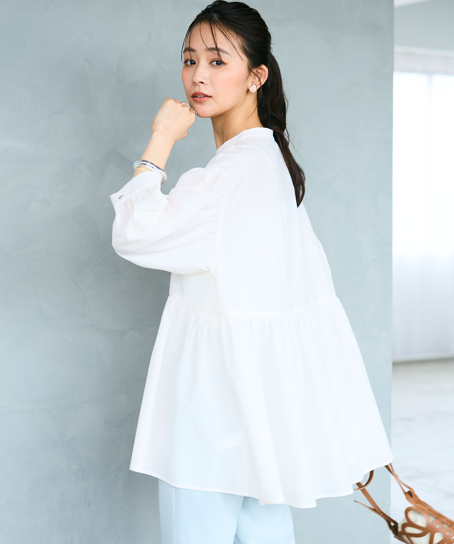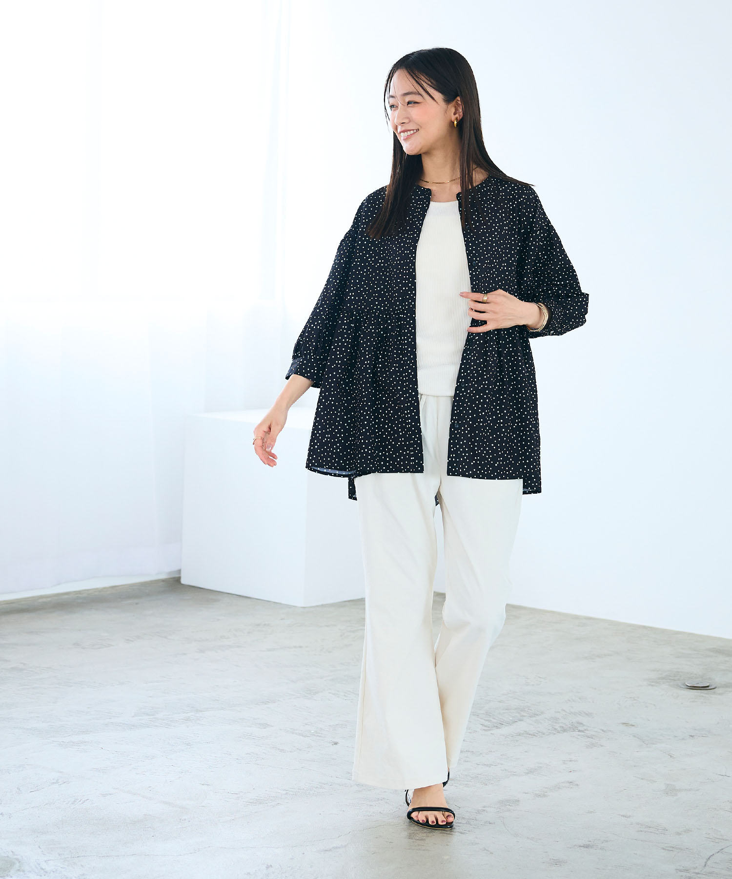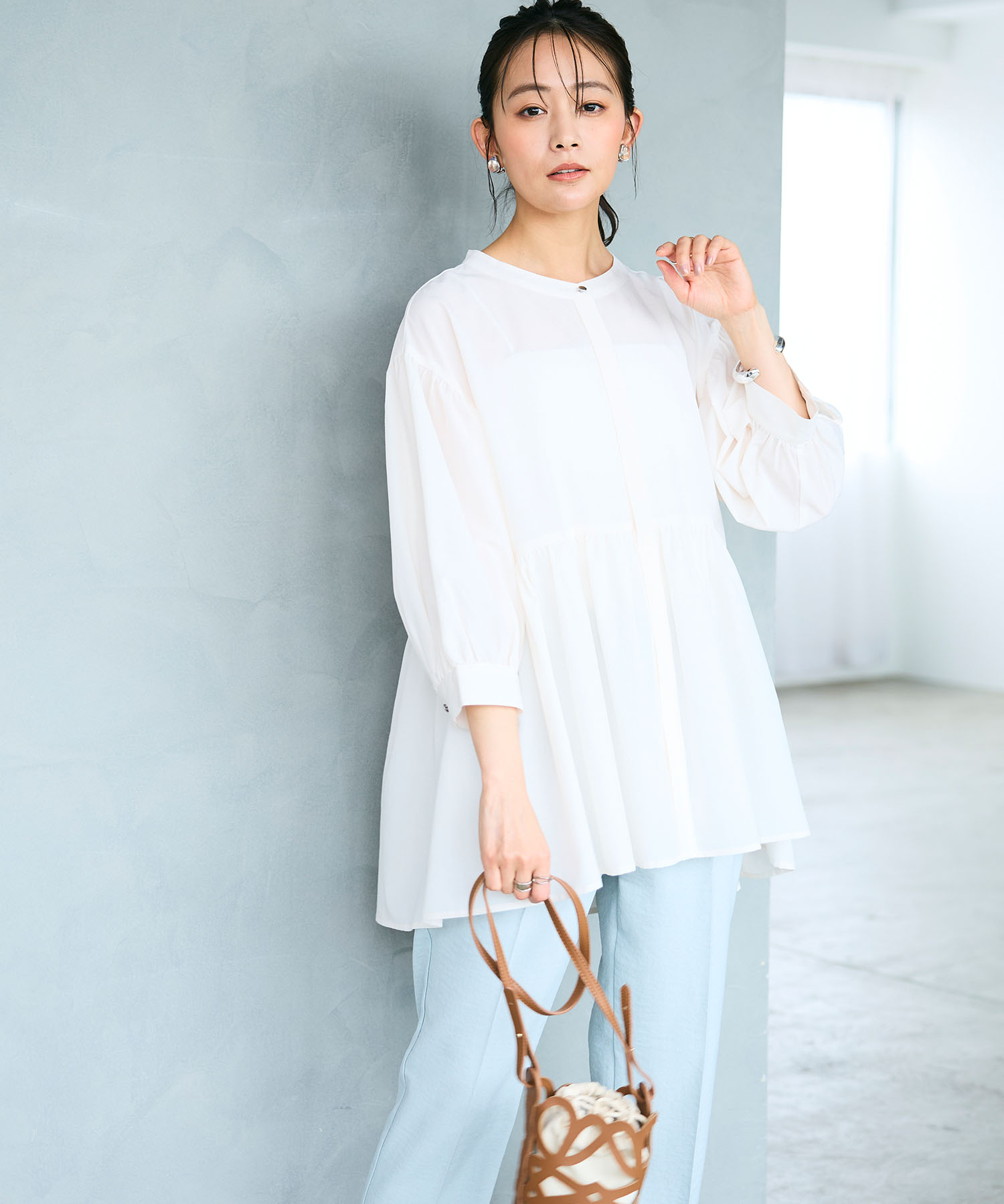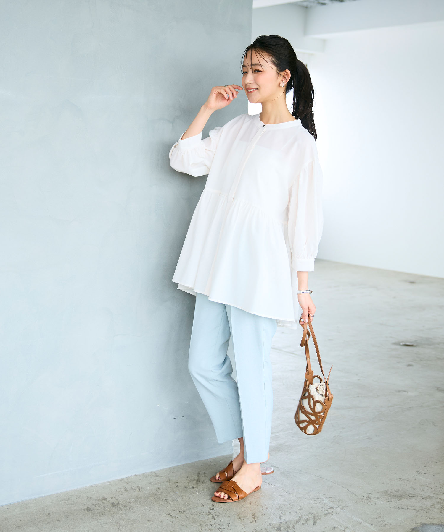 軽やかなペプラムブラウスを羽織ったスタイルは、最高気温20度の日にちょうどよい温度調整ができる服装。さらりとした素材感のブラウスは冷房対策にも役立ち、日中の外出も快適に過ごせます。セミフレアパンツを合わせれば美脚シルエットが叶い、シンプルながらも上品な大人のきれいめカジュアルが完成します。