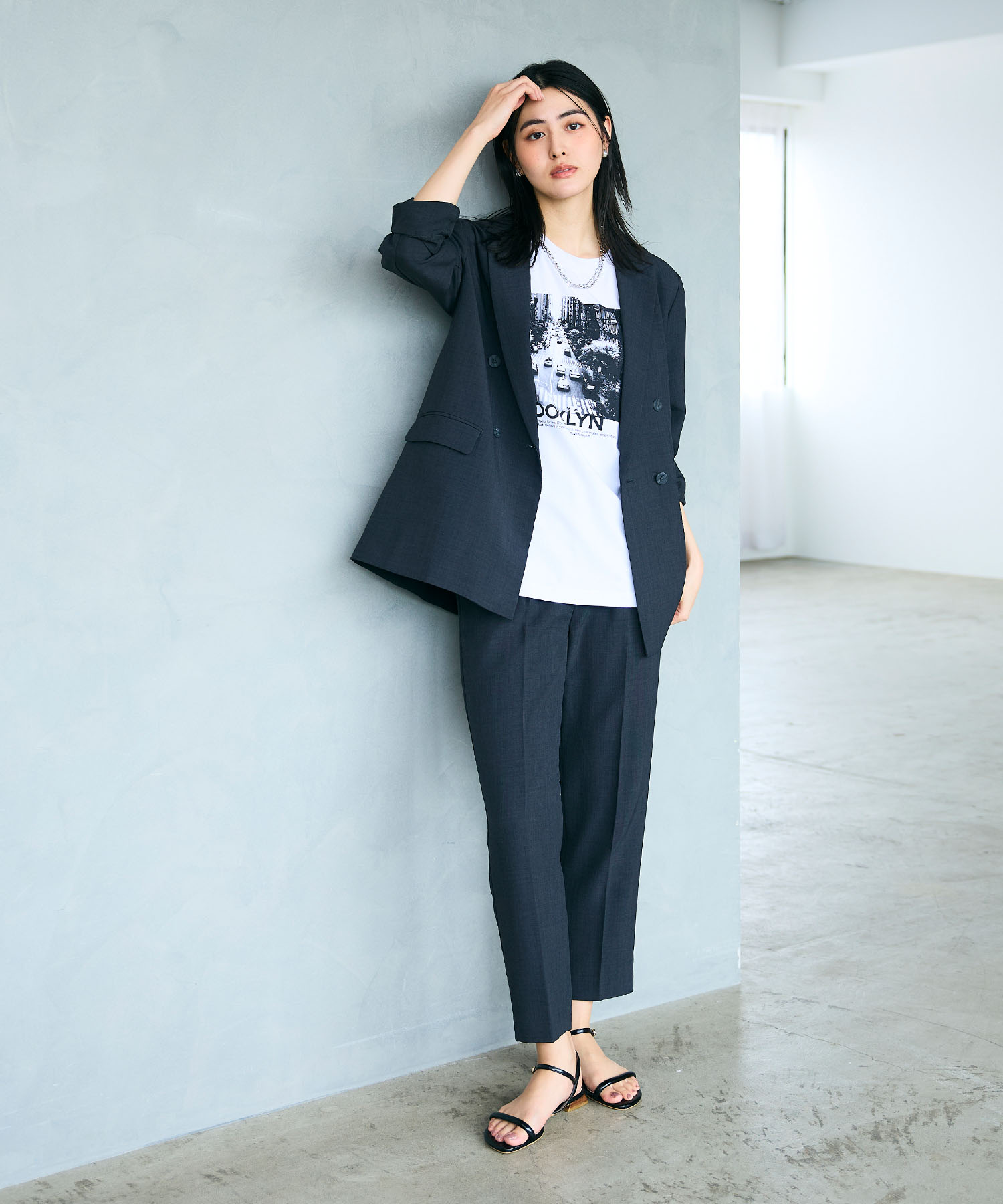 ラフなTシャツにジャケットをプラスすることで、肩の力を抜きながらも大人らしいきれいめスタイルに。すっきりとしたパンツで全体を引き締めれば、バランスの取れた服装が完成します。最高気温20度の過ごしやすい日の通勤に活躍する、オフィスカジュアルです。