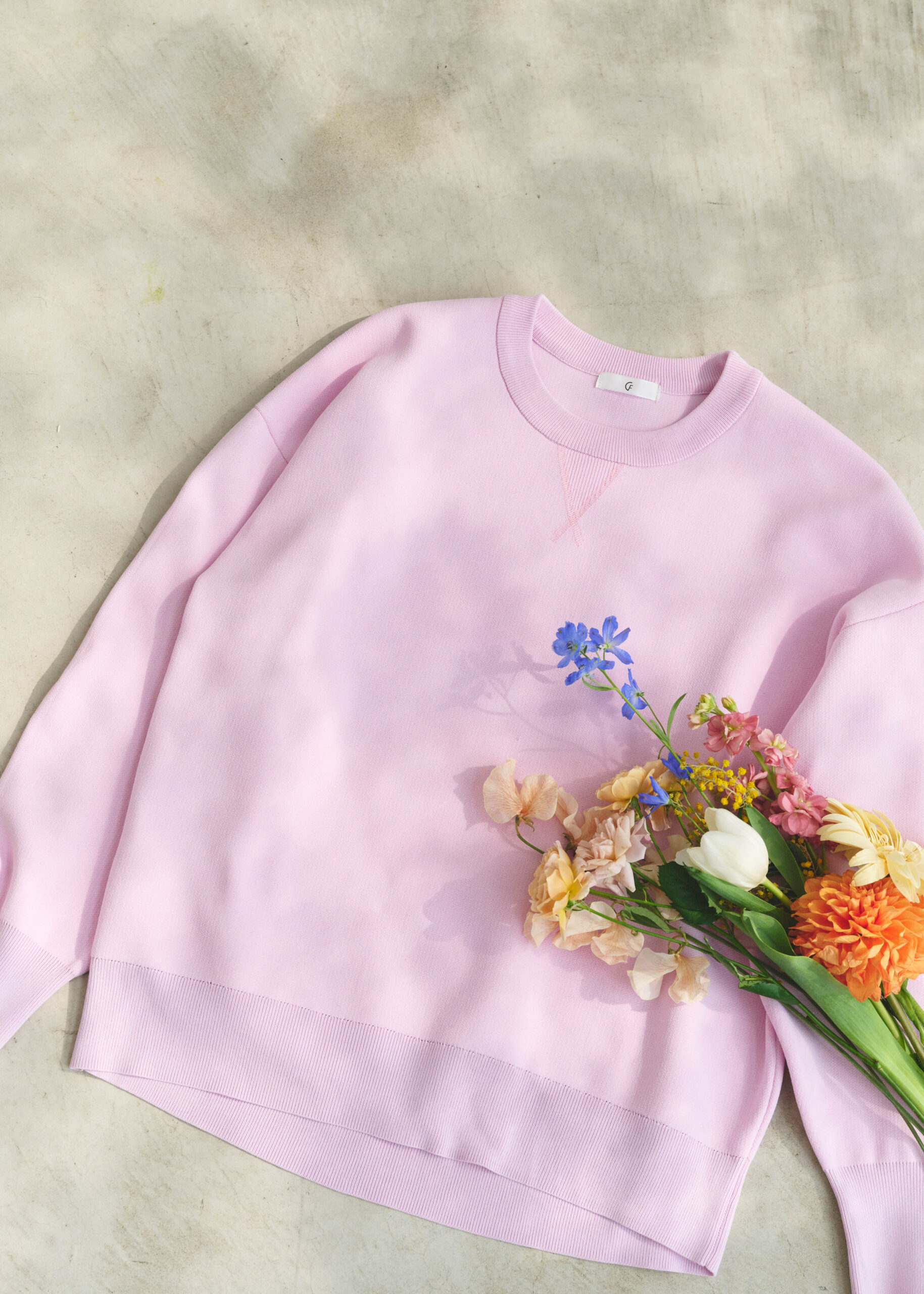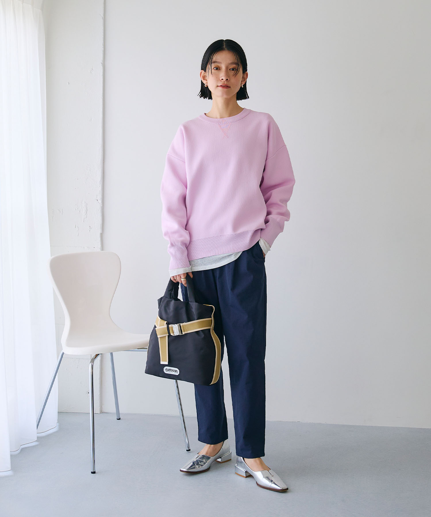 やわらかなペールピンクのスウェットライクニットとロンTのレイヤードスタイルが大人のこなれ感をプラスし、シンプルな着こなしも春らしい雰囲気に仕上がります。ネイビーのパンツを合わせることで甘さを程よく抑え、大人らしい落ち着きのあるバランスに。お花見シーズンにぴったりなカジュアルスタイルです。