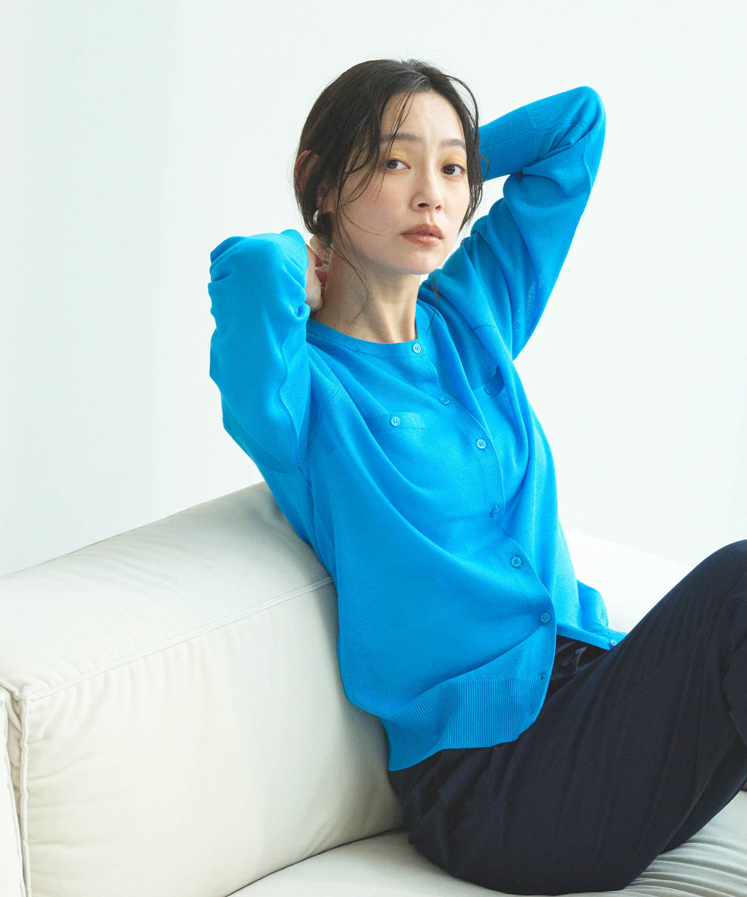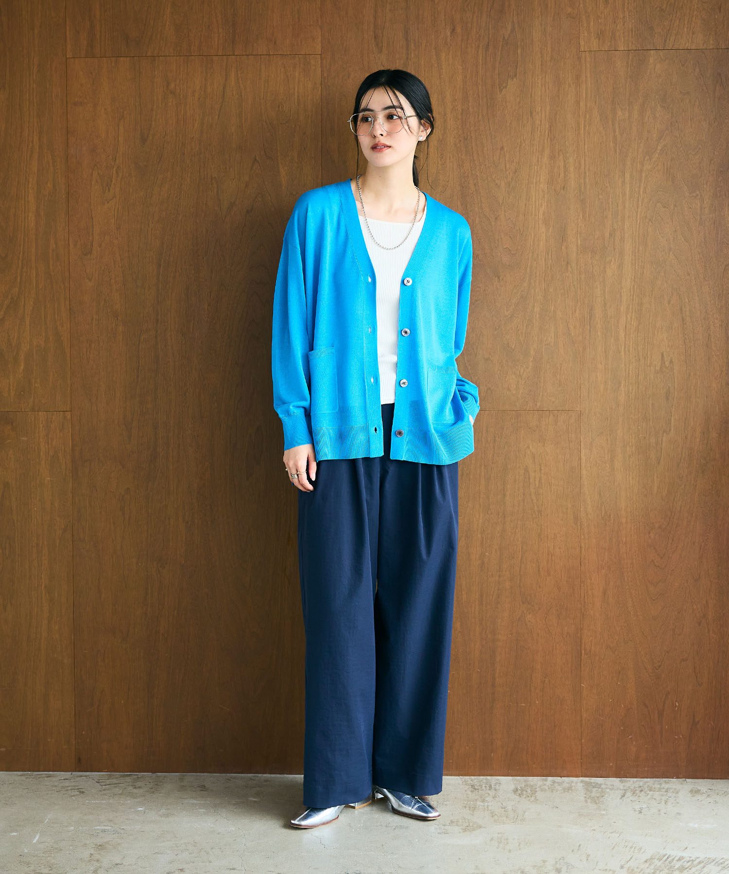 ベーシックな白トップスにビビットなシアーブルーのカーディガンを重ねたスタイルは、ゆったりとしたワイドパンツを合わせることで、気張りすぎない大人のリラックススタイルに仕上がります。鮮烈なブルーが着こなしにメリハリを与え、配色でまとめることでカジュアルになりすぎず、お家時間や子どもとの公園遊びにも取り入れやすいスタイルが叶います。
