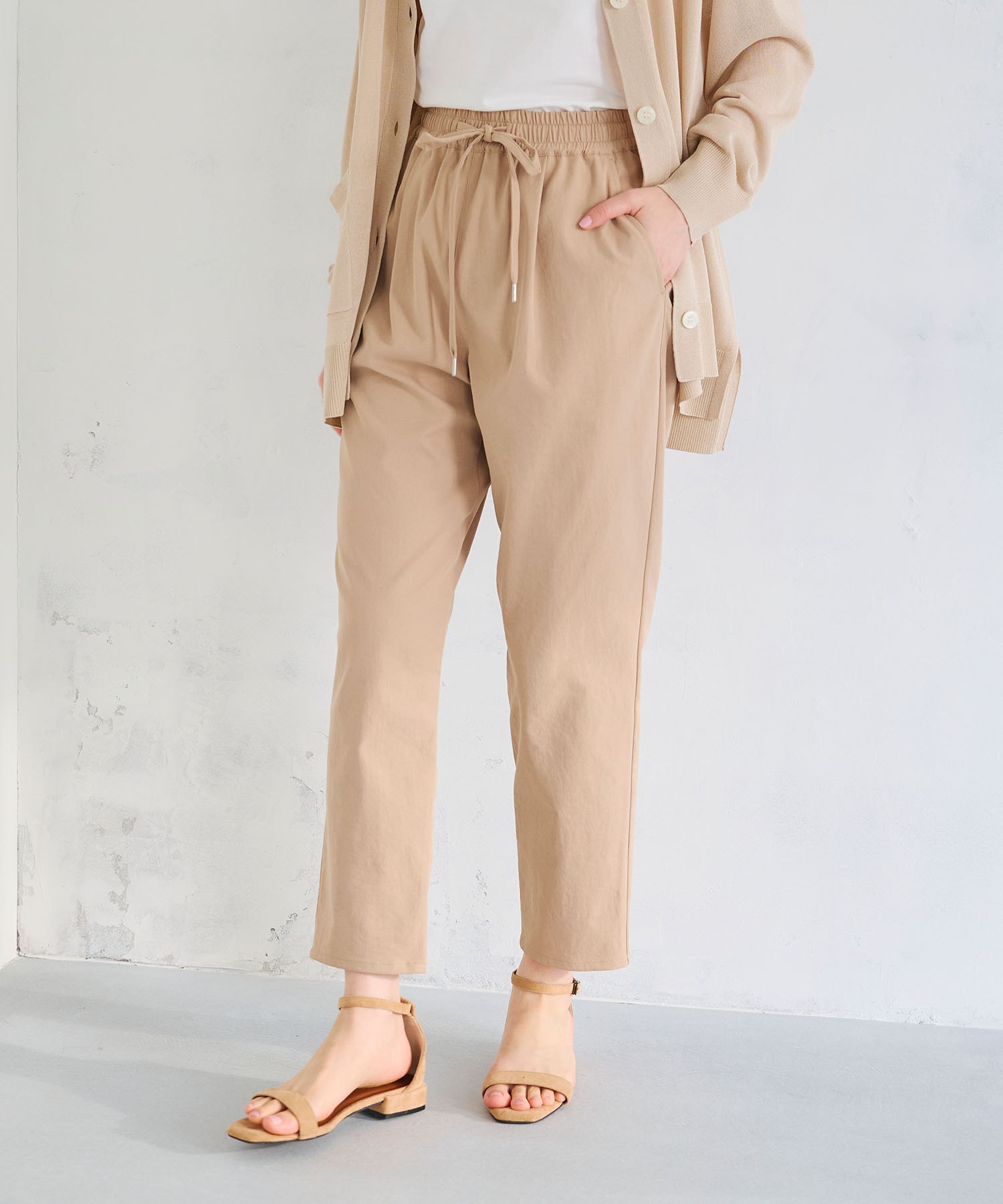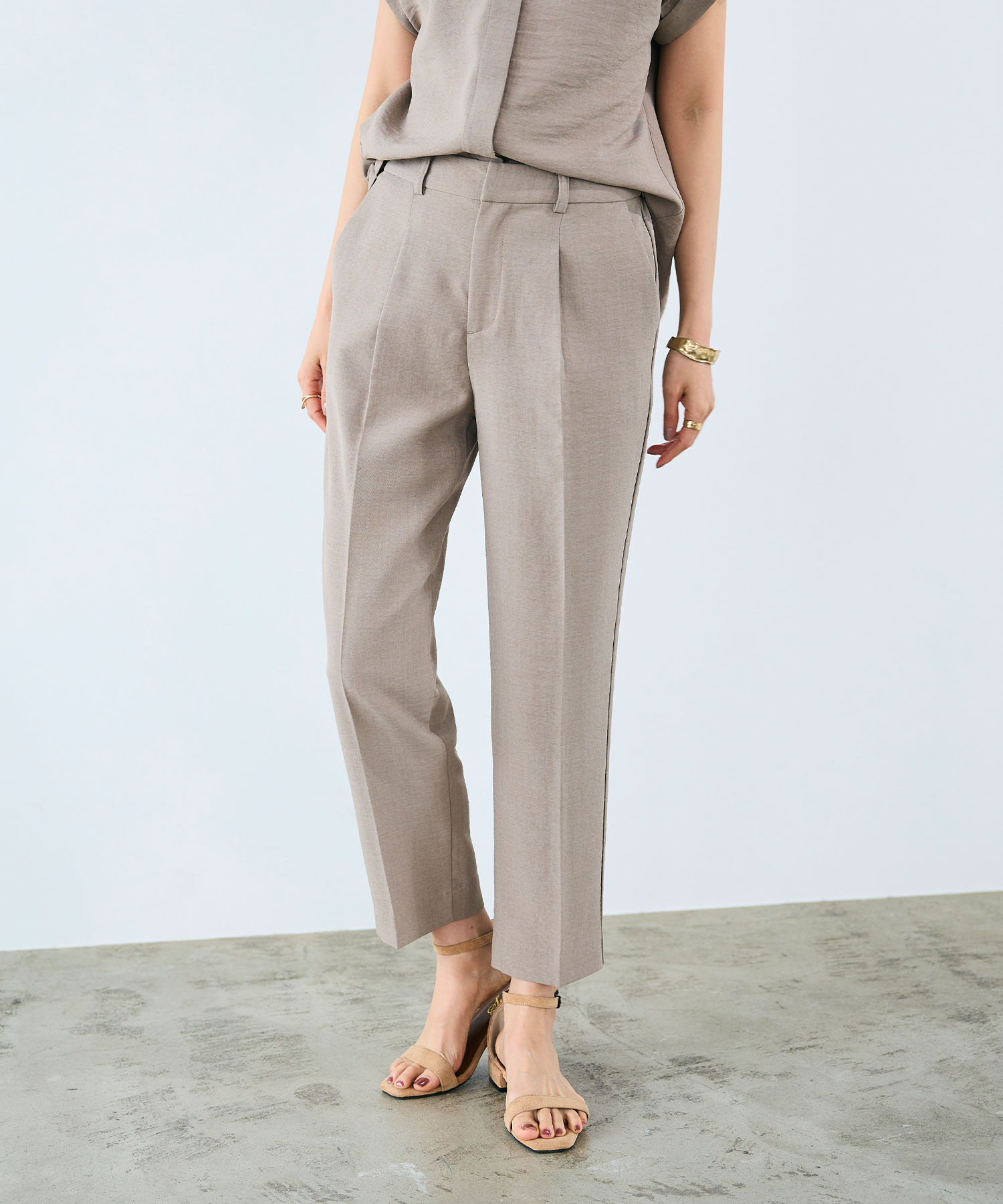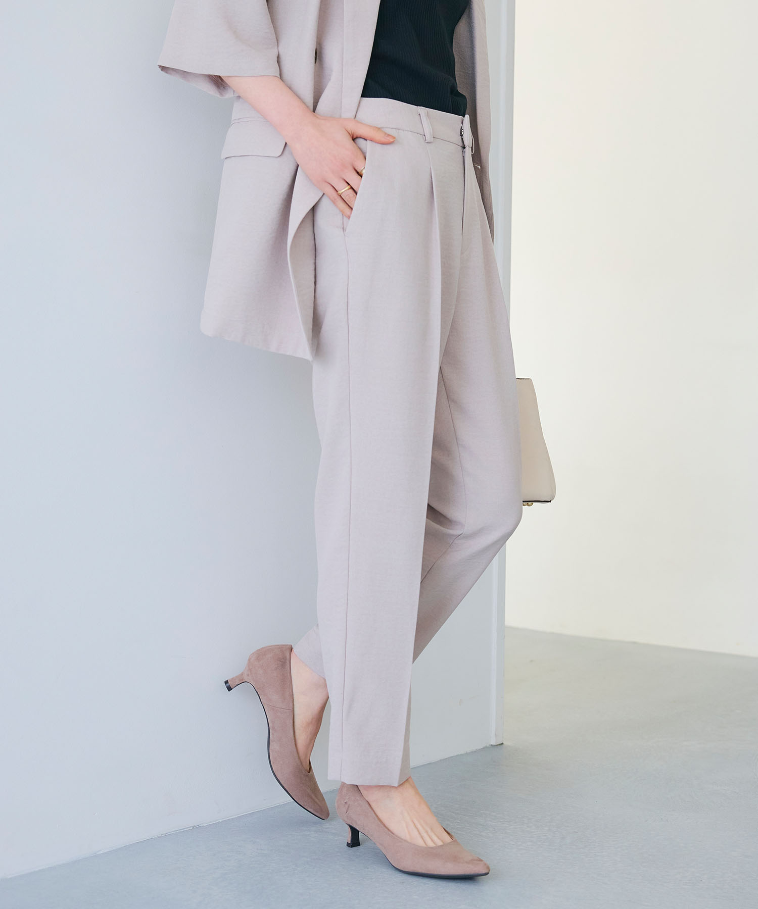 同じ春カラーでも、素材やシルエットによって印象が変わります。リネンライク素材や落ち感のあるポリエステル素材など、軽やかで品のある質感を選ぶことで、カラーアイテムでも大人らしい上品な春カラーコーデに。さらに、きれいなラインのシルエットを意識することで、より洗練された印象に仕上がります。