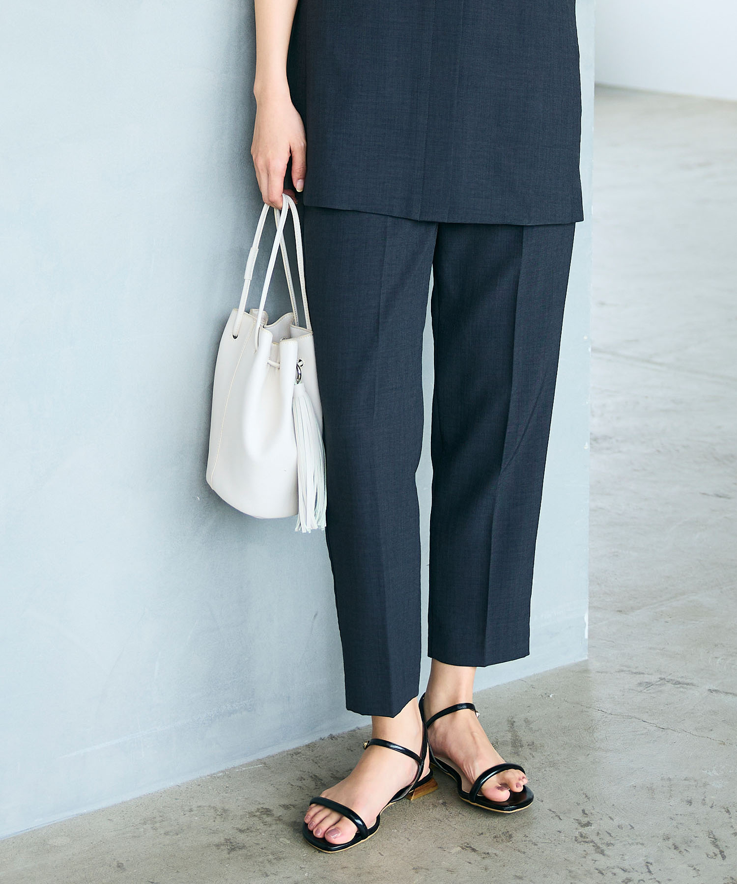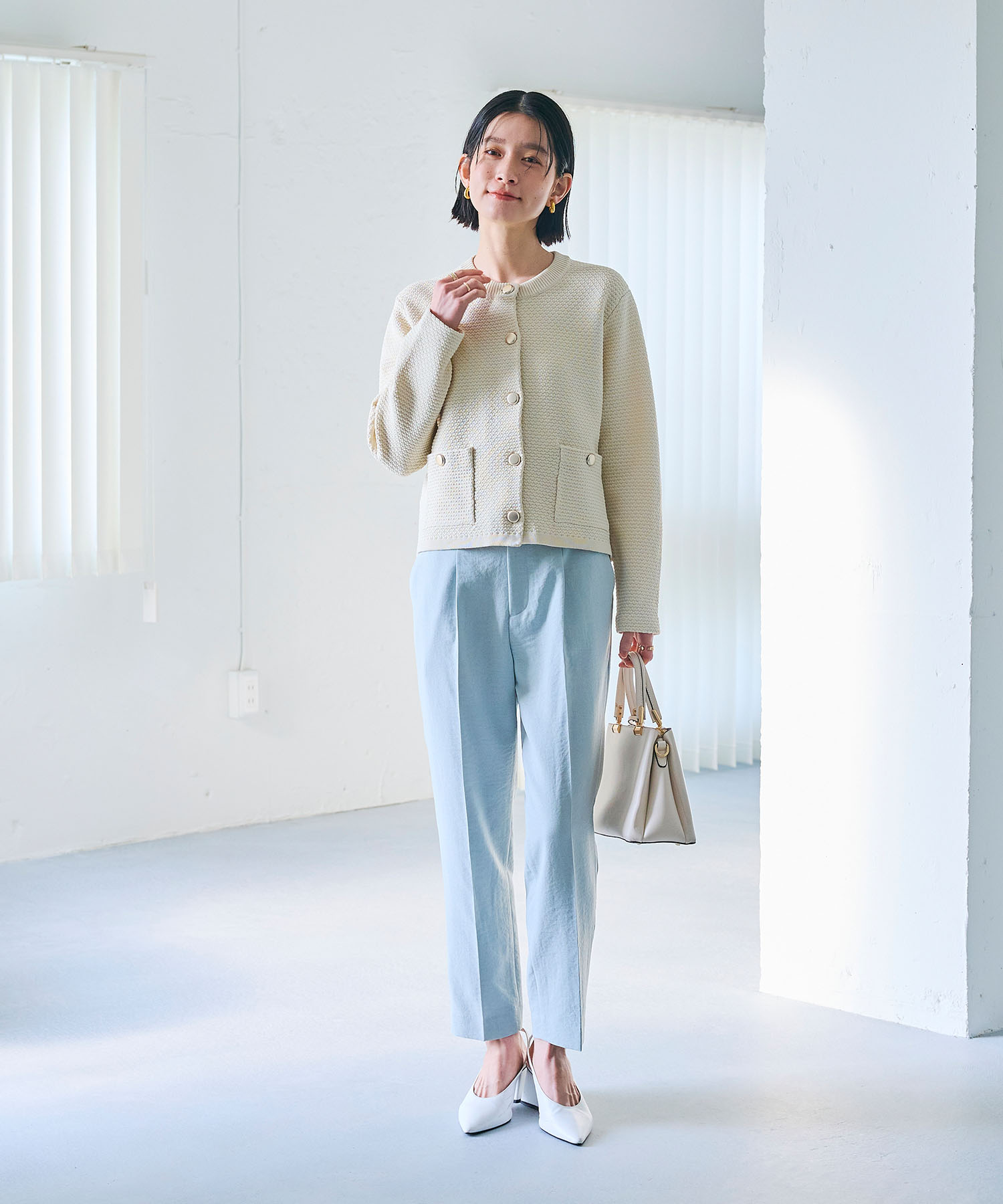 目を引くミントグリーンのパンツを主役にした春カラーコーデは、通勤スタイルにほどよい華やかさをプラス。コンパクトなニットジャケットを合わせることでより洗練された印象に。明るいカラーのボトムスがコーデ全体を軽やかに見せ、春らしい好印象スタイルが完成します。