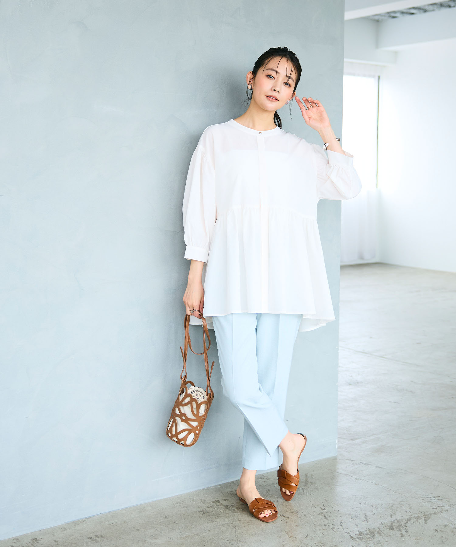 ふんわりとしたシルエットのペプラムブラウスにミントグリーンのパンツを合わせたスタイルは、休日のお出かけにおすすめ。淡い春カラーのパンツがコーデ全体をやわらかな印象にまとめてくれます。パンツスタイルで動きやすさを確保しつつ、ペプラムのシルエットが女性らしさを引き立てるのもポイント。ランチやショッピングなどにも取り入れやすいきれいめカジュアルです。