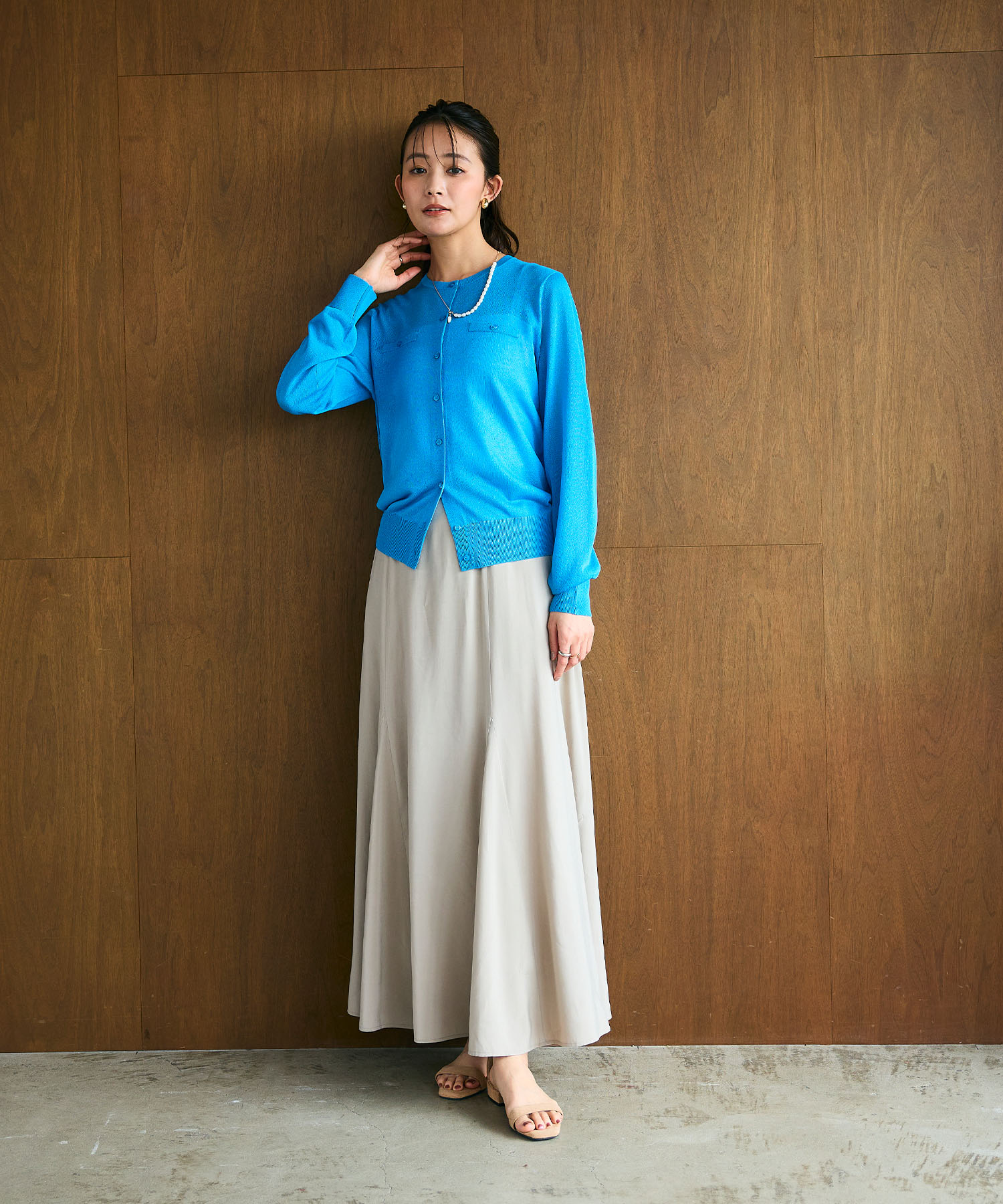 目を引くシアーブルーのカーディガンには、動きのあるフレアスカートを合わせることで、程よい女性らしさと上品さをプラス。カラー×ベーシックカラーの組み合わせなら派手になりすぎず、オフィスでも自然に春カラーを取り入れられます。鮮やかな春カラーが、仕事中の気分も明るく盛り上げてくれます。