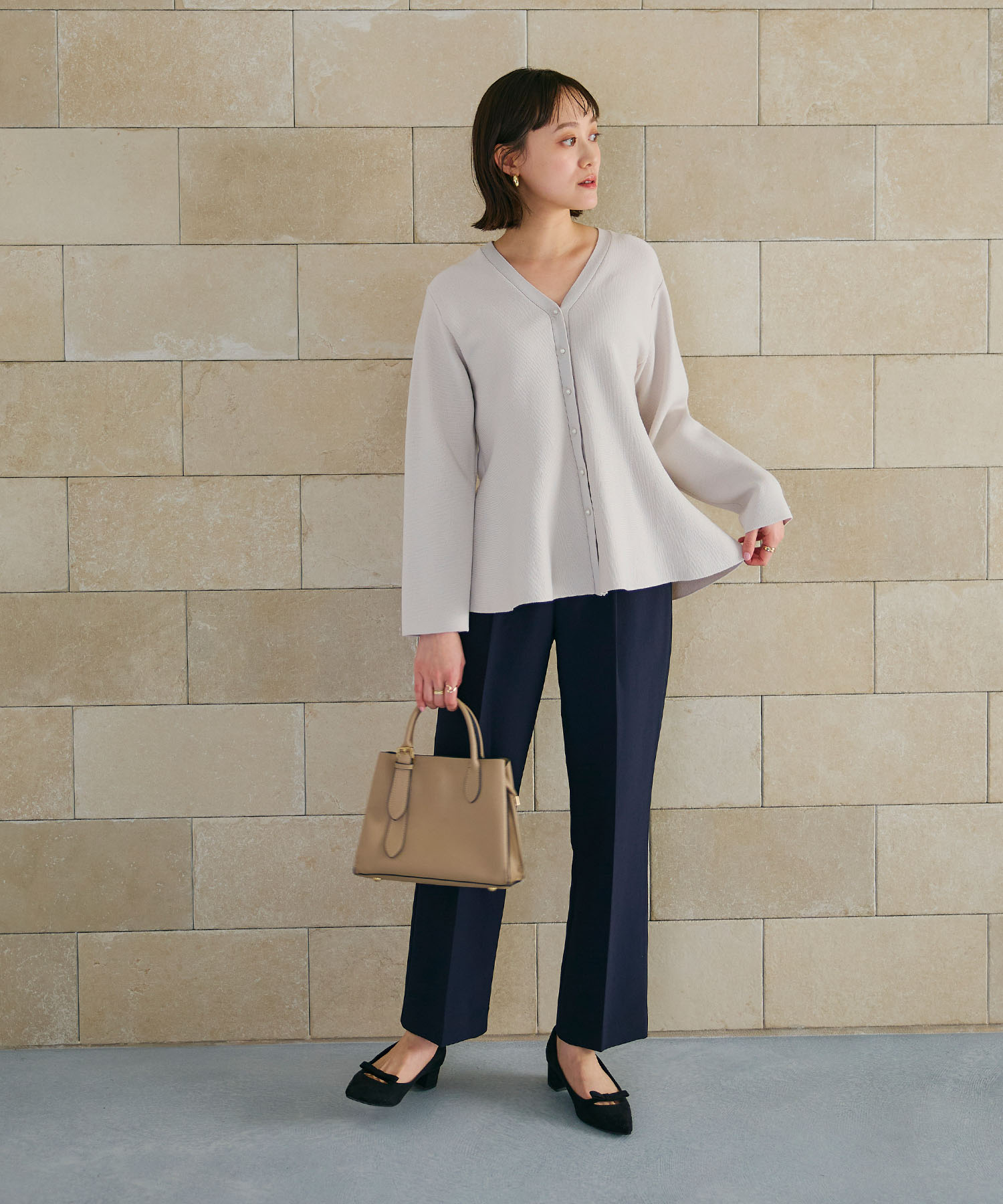 鮮やかなブルーのペプラムカーディガンを取り入れた春カラーコーデは、清潔感ときちんと感が両立。落ち着いたネイビーのパンツを合わせることで、カラーアイテムも大人らしく上品にまとまります。程よくゆとりのあるシルエットが抜け感を生み、忙しい朝でもきちんと見えが叶う働くママにおすすめのコーデです。