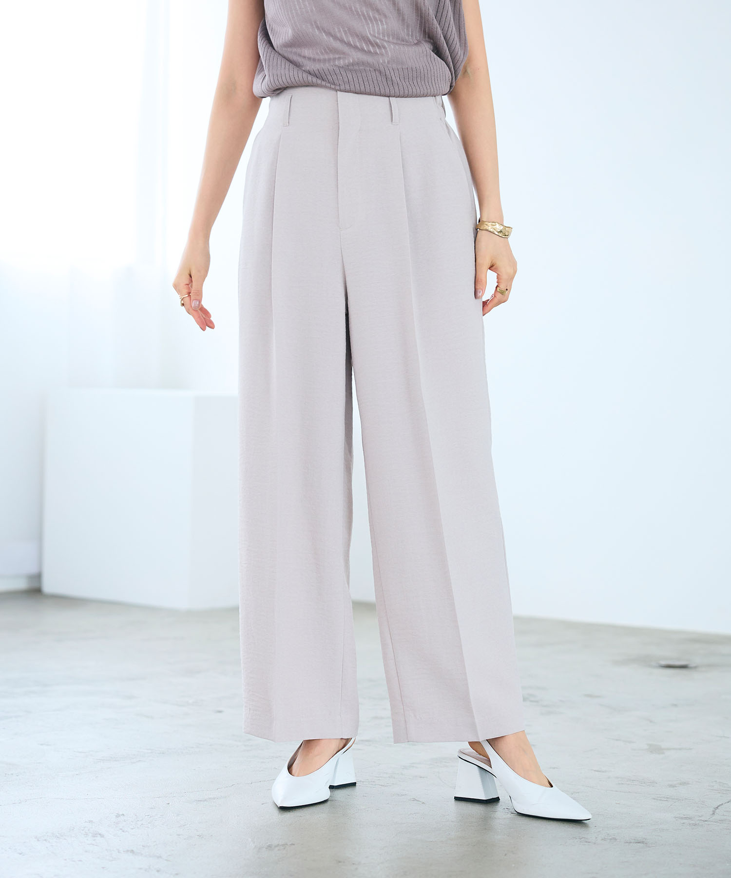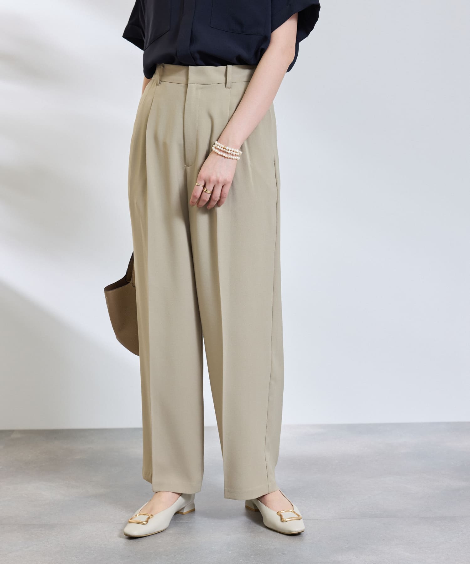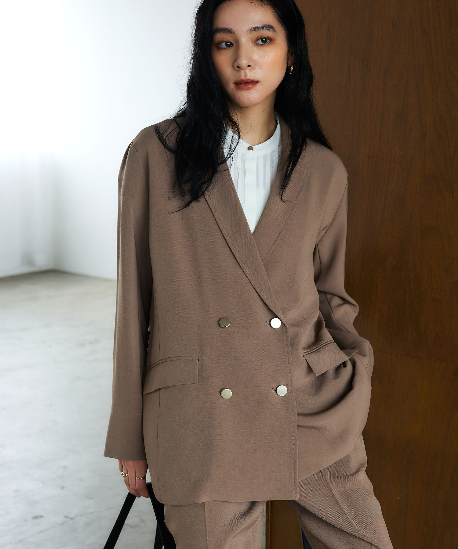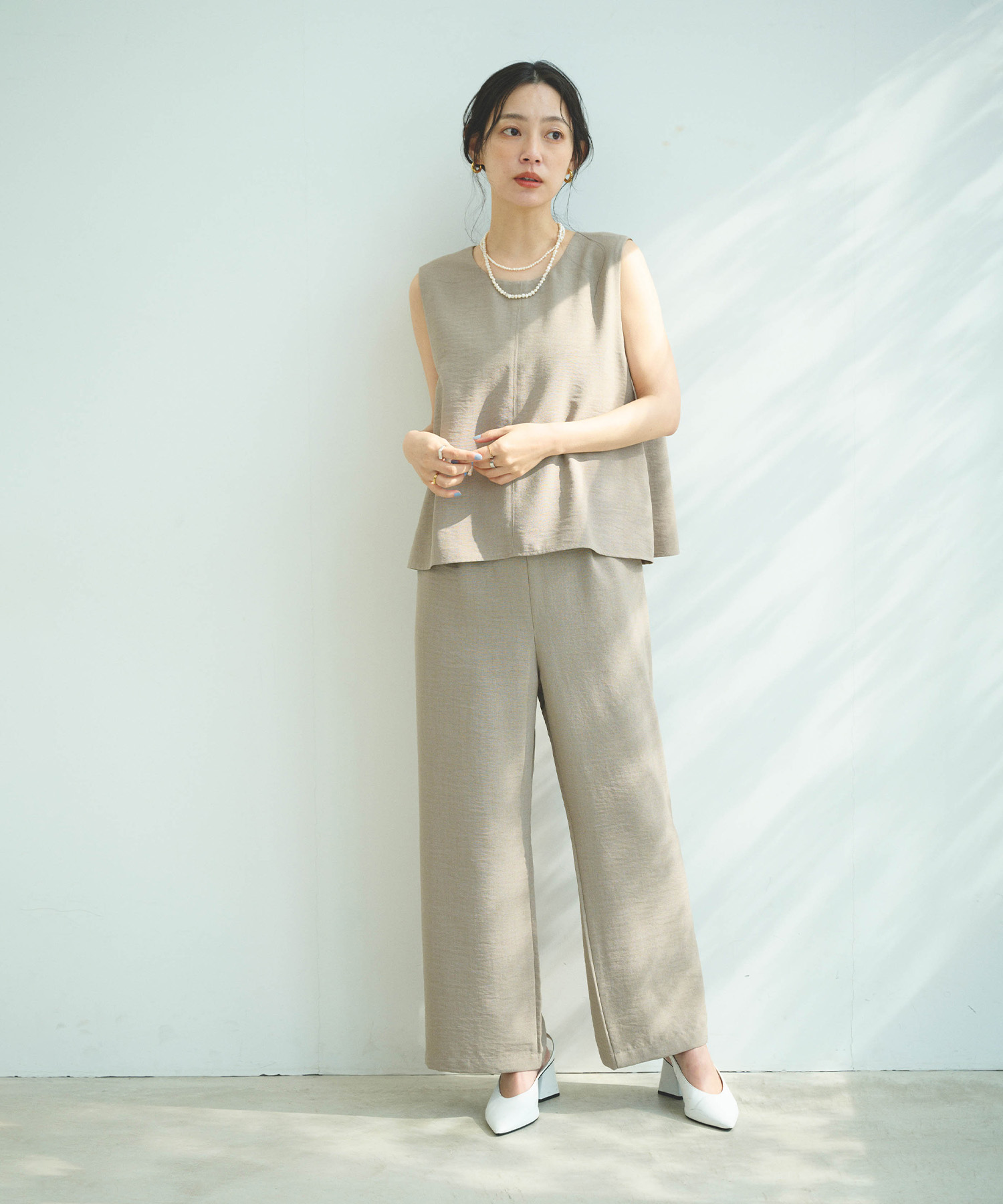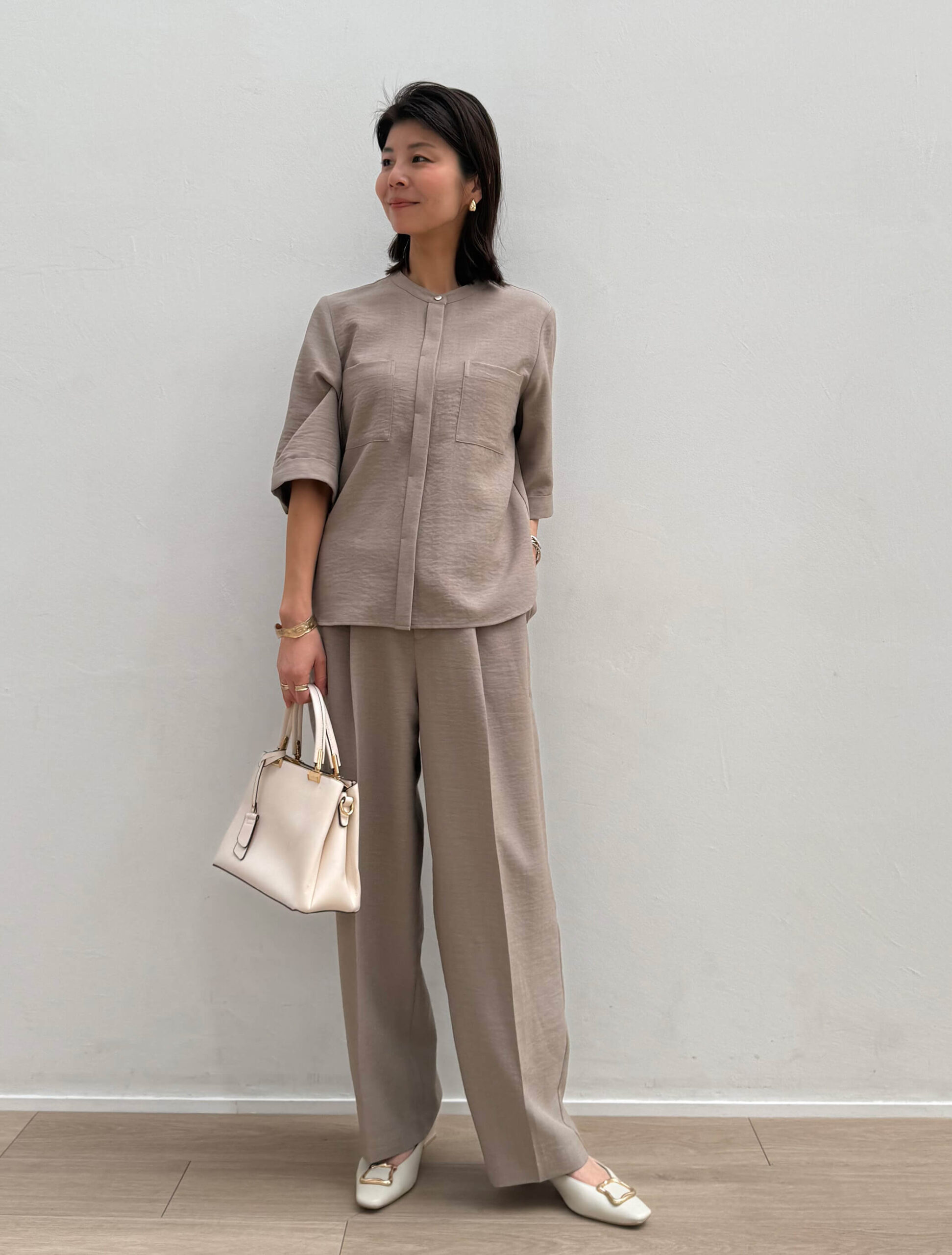 やわらかなモカカラーのセットアップは、春の通勤服に取り入れやすい落ち着きと上品さが魅力。センタープレスのワイドパンツなら、動きやすさときれい見えが両立し、通勤時間も快適に。シンプルながらもニュアンスのある色味で、落ち着いた印象の洒落た大人の通勤コーデが叶います。