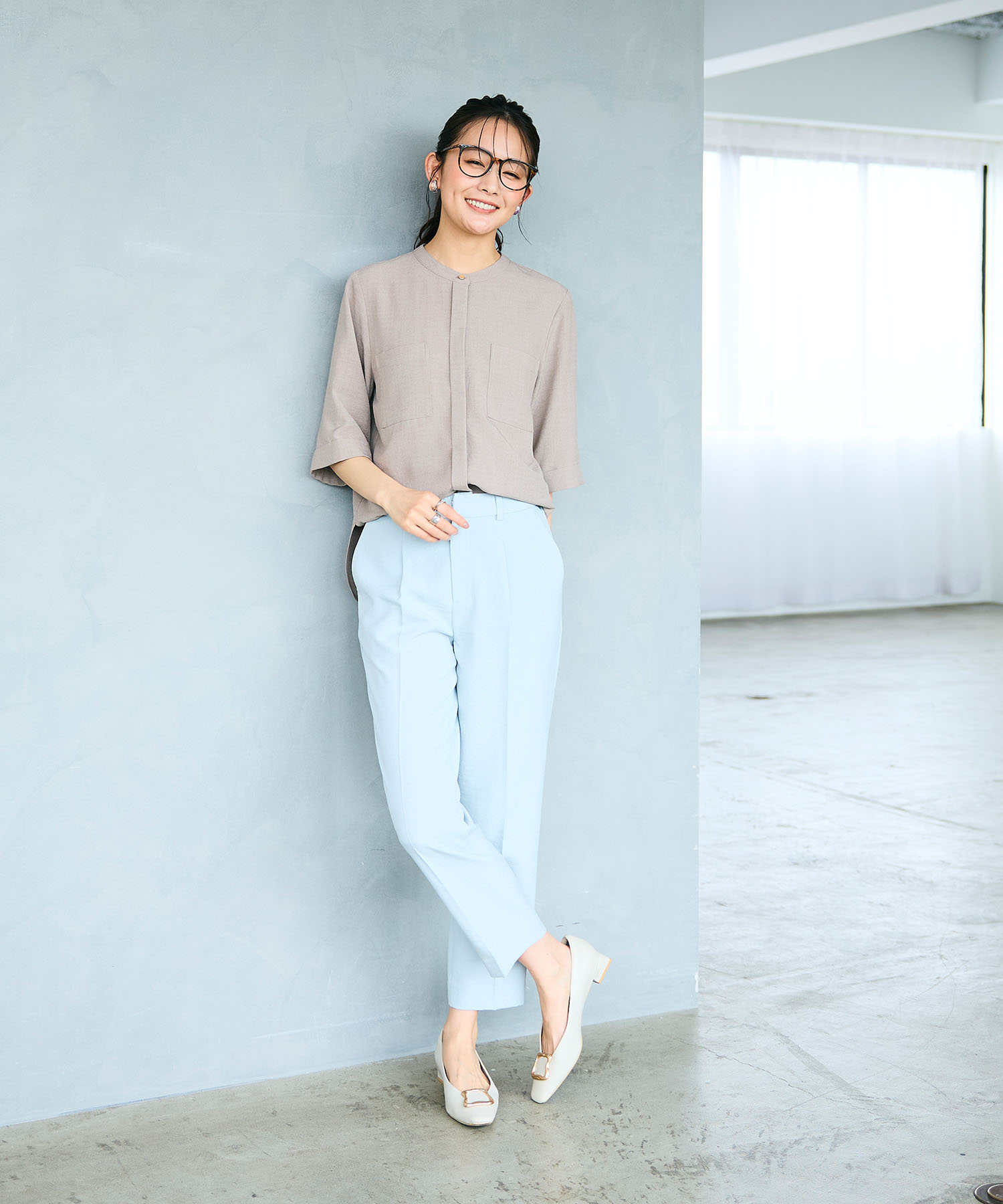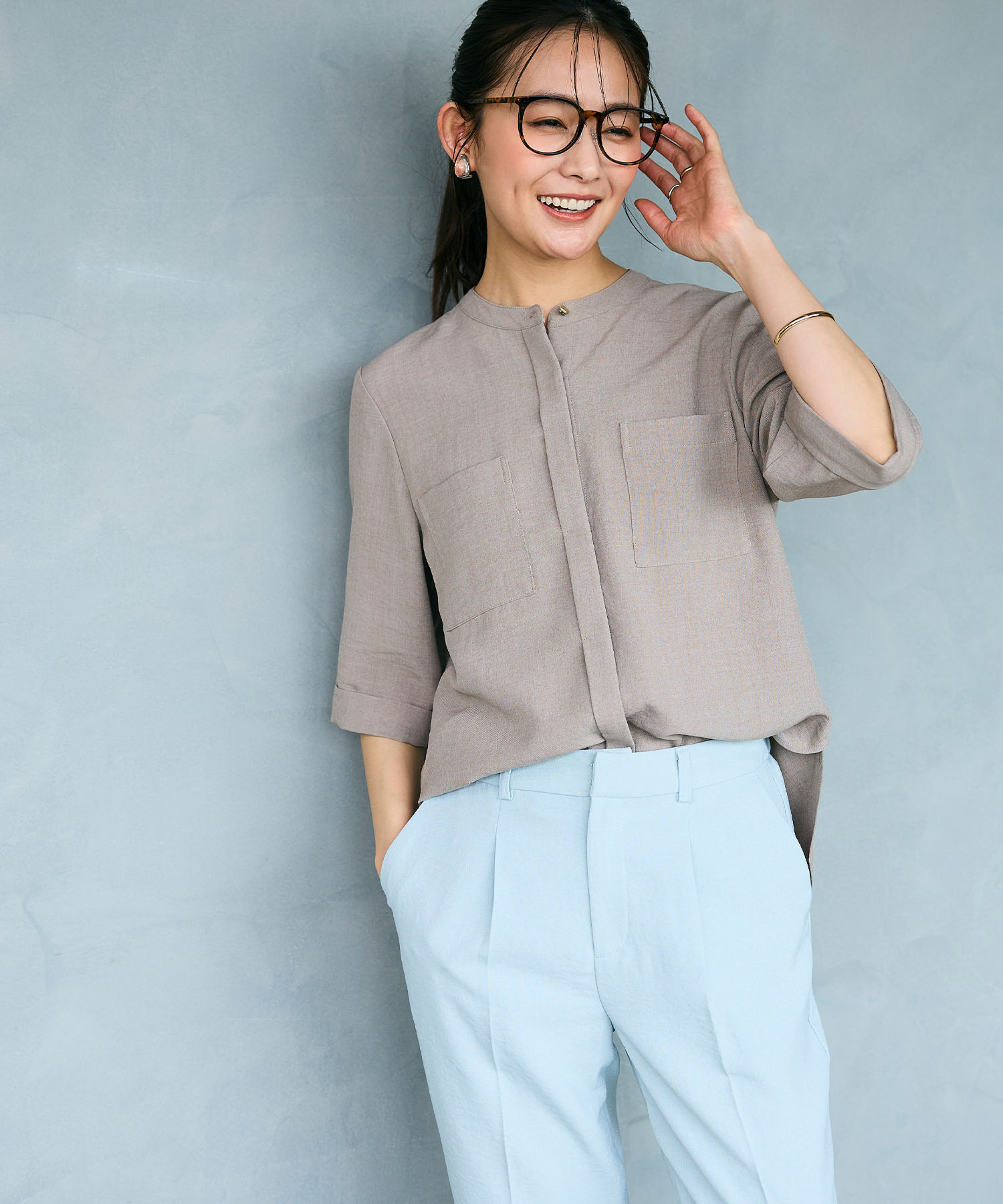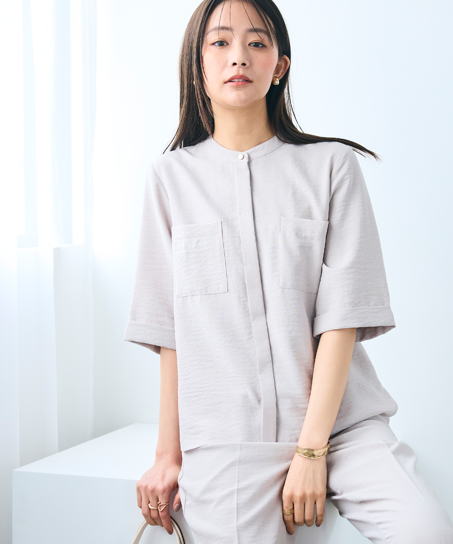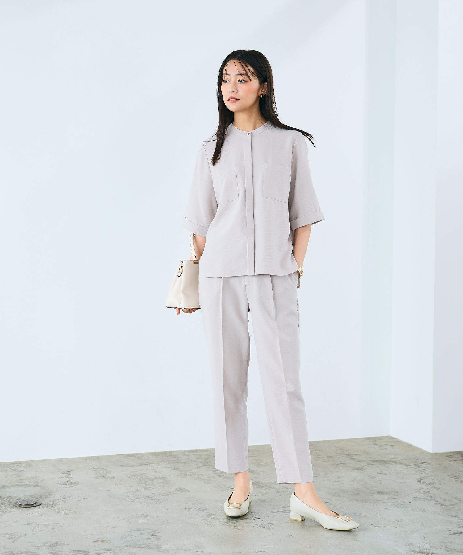 やわらかなニュアンスカラーのワントーンでまとめたブラウスセットアップスタイルは、春の通勤にぴったりな上品コーデ。首まわりがすっきり見えるバンドカラーのブラウスと、センタープレス入りのテーパードパンツが、清潔感のある大人の印象を演出します。セットアップならではの統一感で、忙しい朝でも自然とコーデが整います。