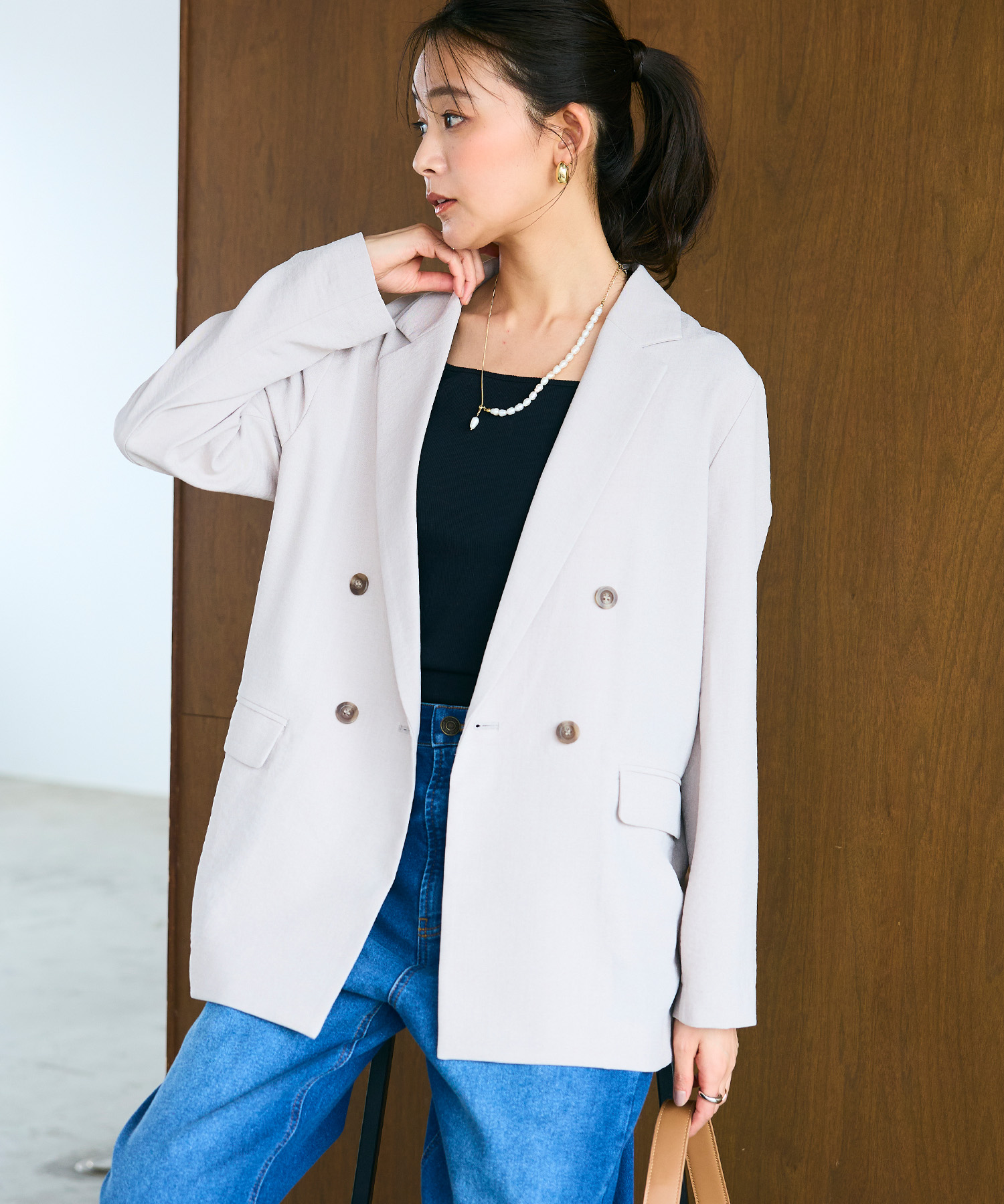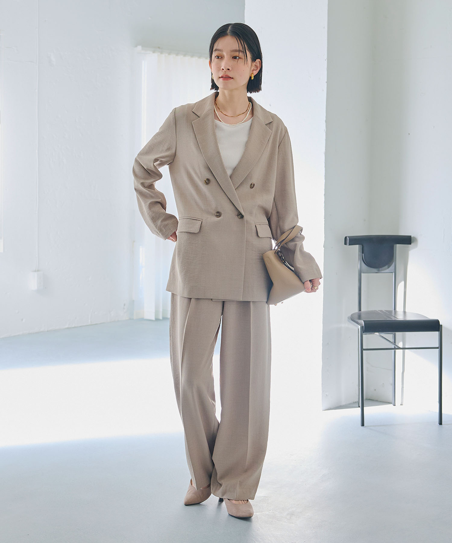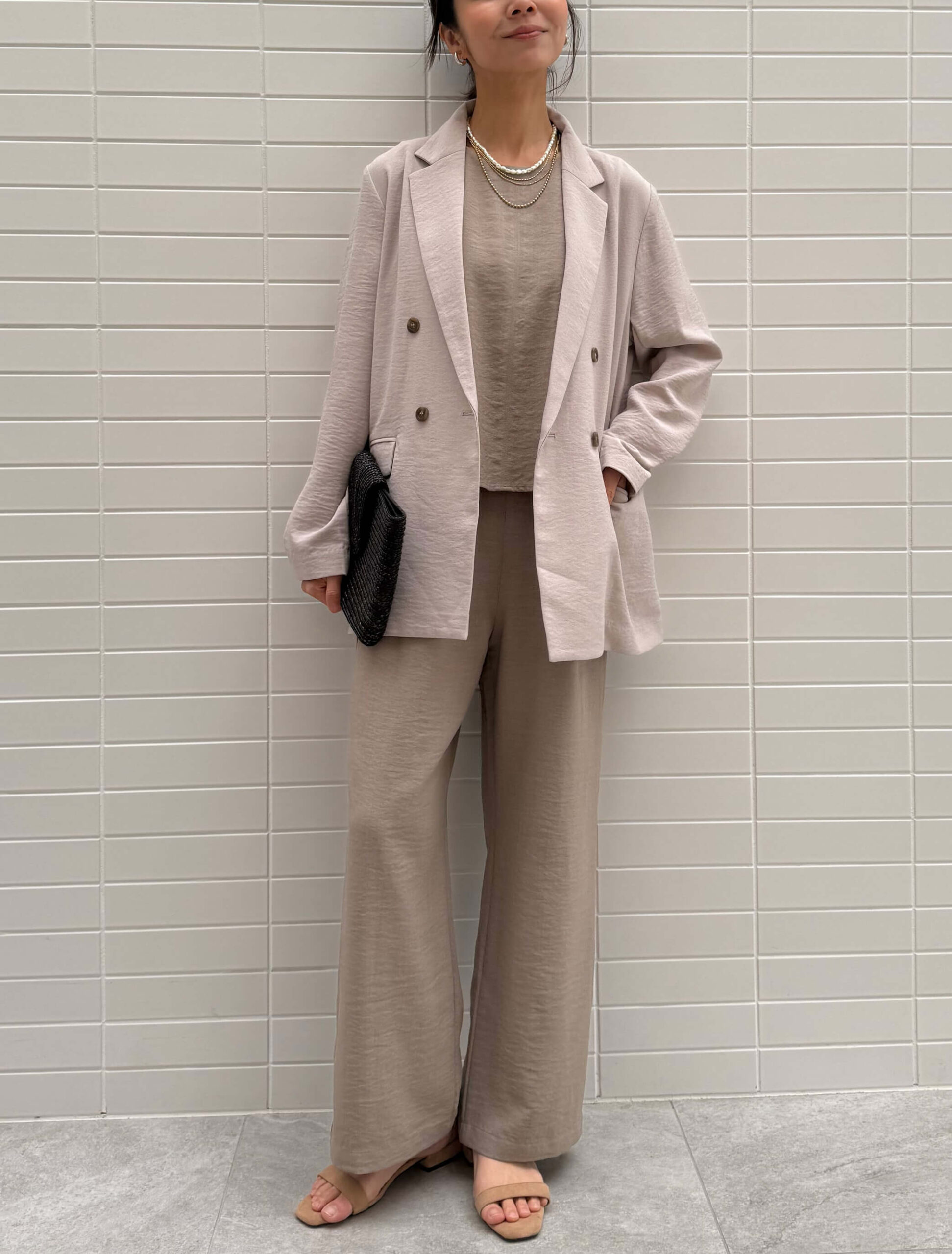 ダブルジャケットが主役のセットアップは、春の寒暖差にも柔軟に対応できる万能コーデ。全体をニュアンスベージュの同系色でまとめれば、忙しい朝も悩まずにこなれた大人のセットアップスタイルが完成します。時短と洒落感を両立させた、働くママ必見の春の通勤コーデです。