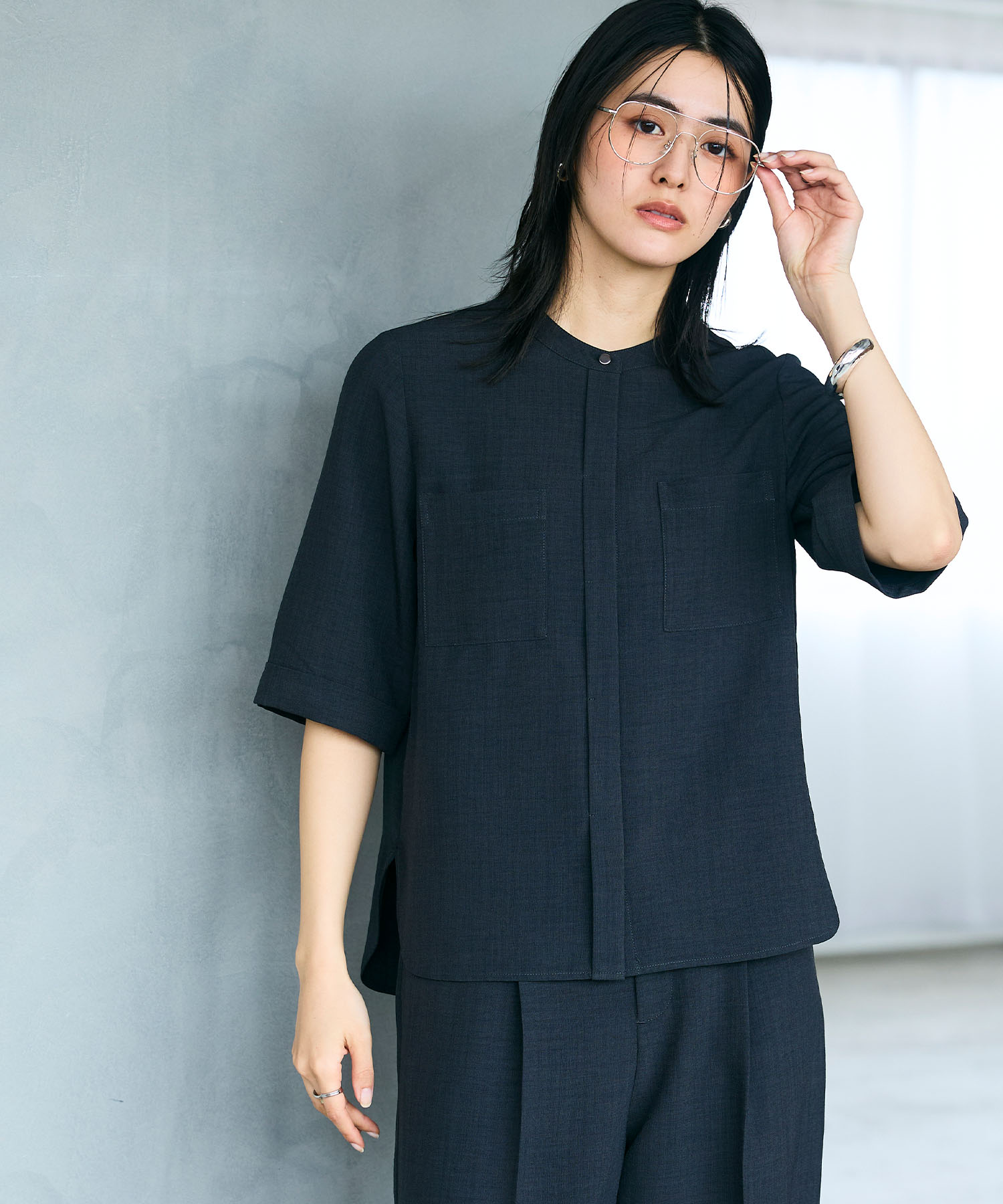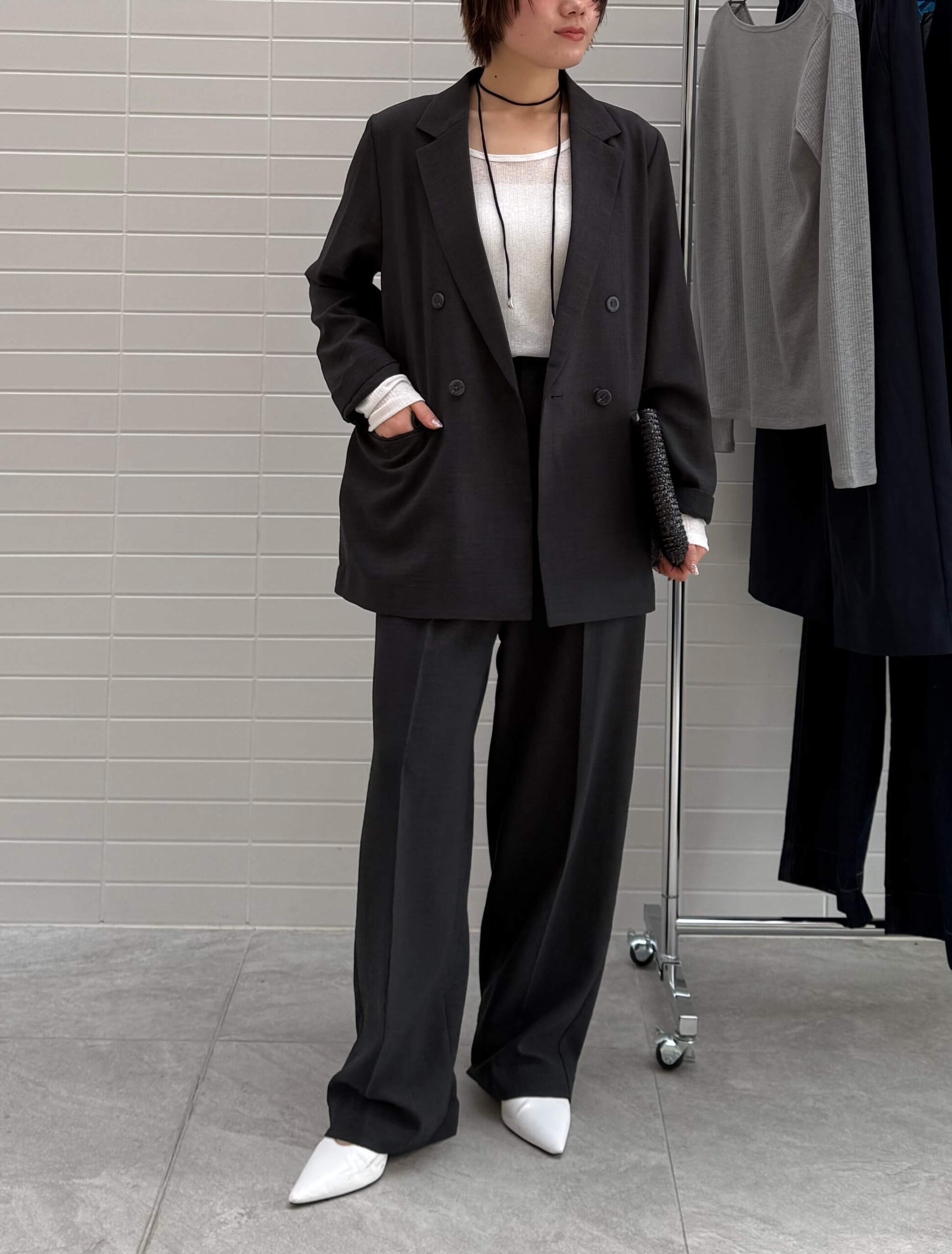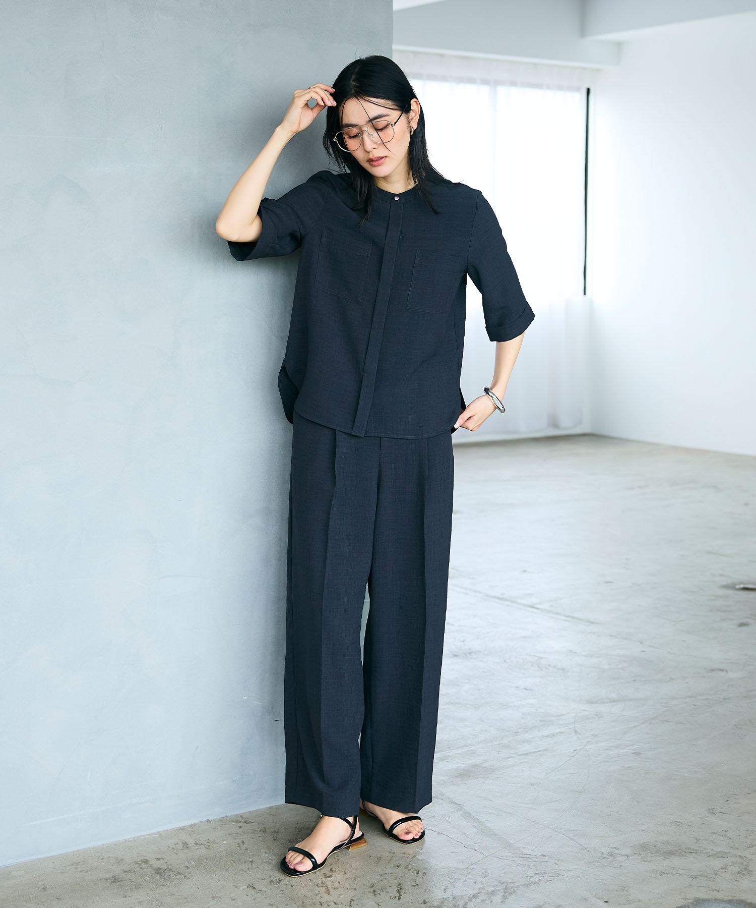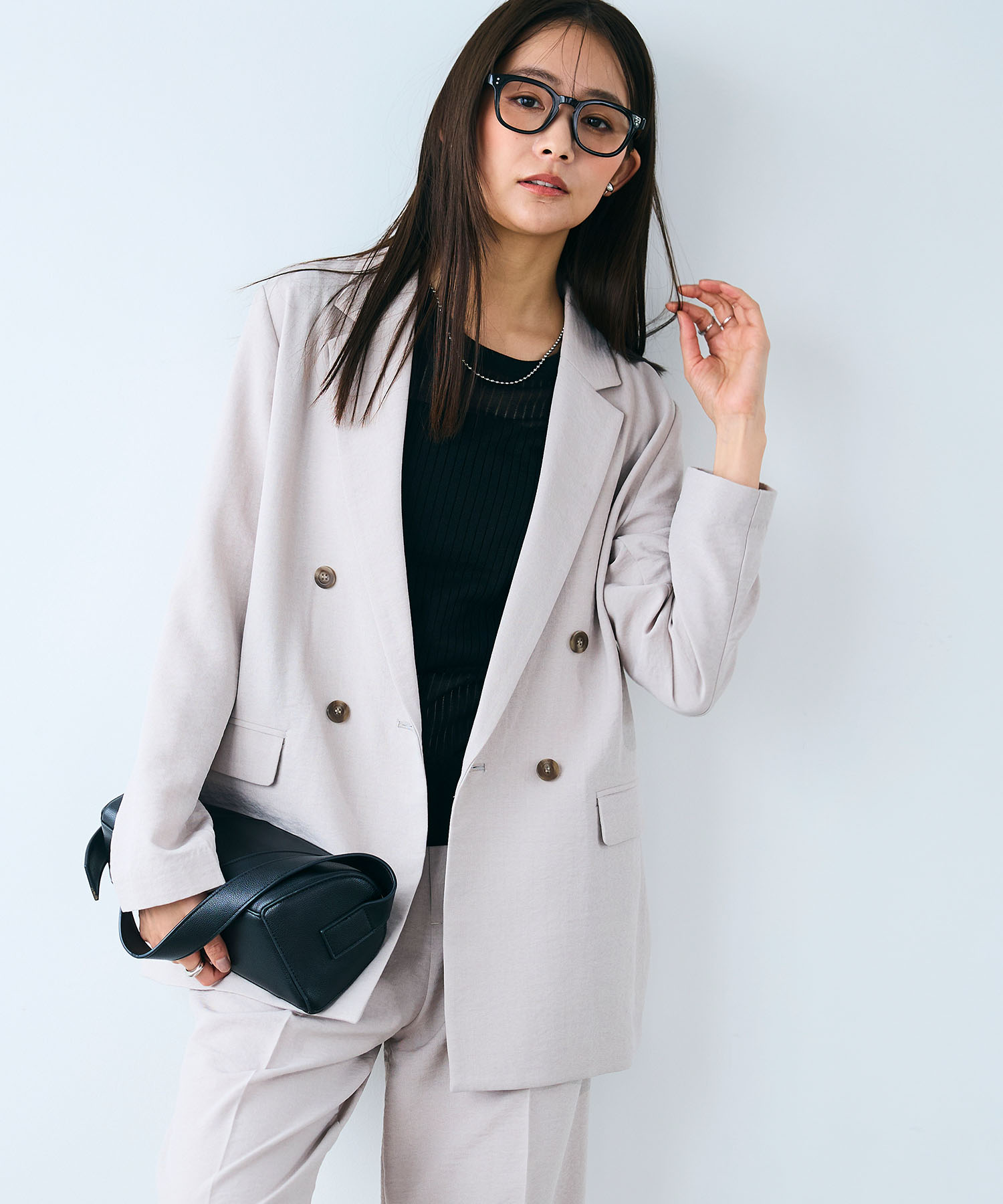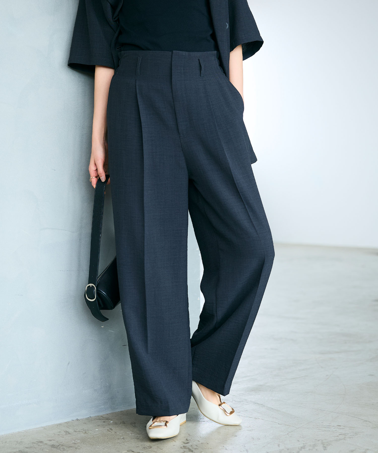 きちんと感と季節感のどちらも欲しい春の通勤には、リネンライク素材のセットアップが頼れます。素材感を活かせば重たくなりがちなチャコールも春の装いにふさわしい軽やかで洗練された印象に。センタープレスパンツと合わせることで、コーデ全体が引き締まり、知的で大人らしい通勤コーデが完成します。