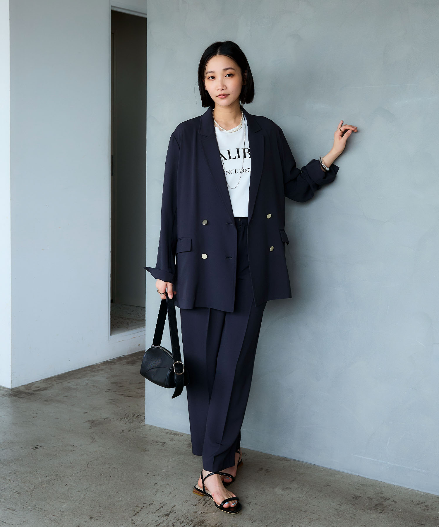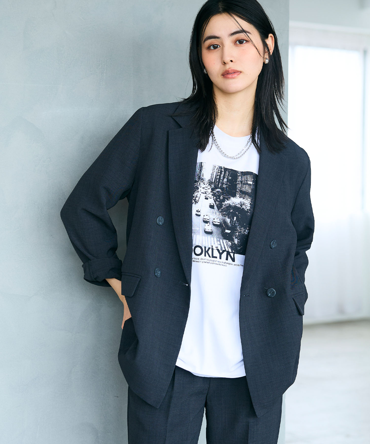 チャコールグレーのセットアップは、春の通勤服として落ち着いた印象と信頼感を演出できる万能コーデ。ジャケットの金釦がさりげないアクセントになり、程よい華やかさをプラスします。Tシャツを合わせてカジュアルダウンすることで、きちんとしすぎず今っぽい抜け感も演出できます。