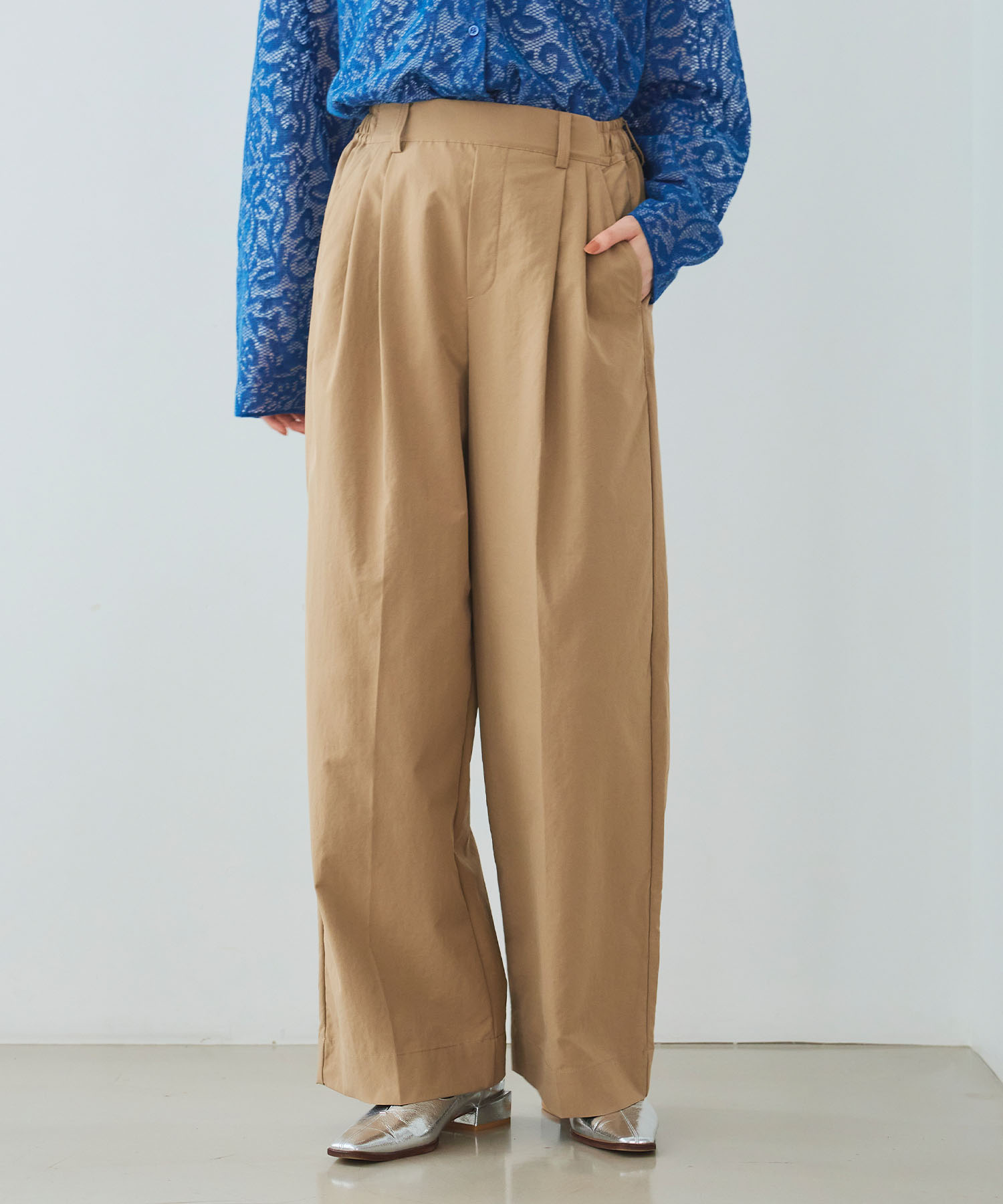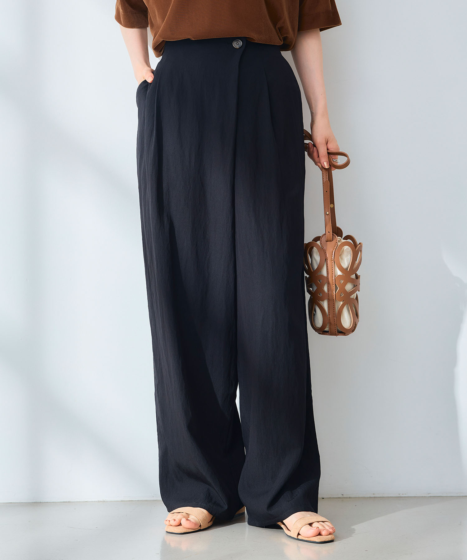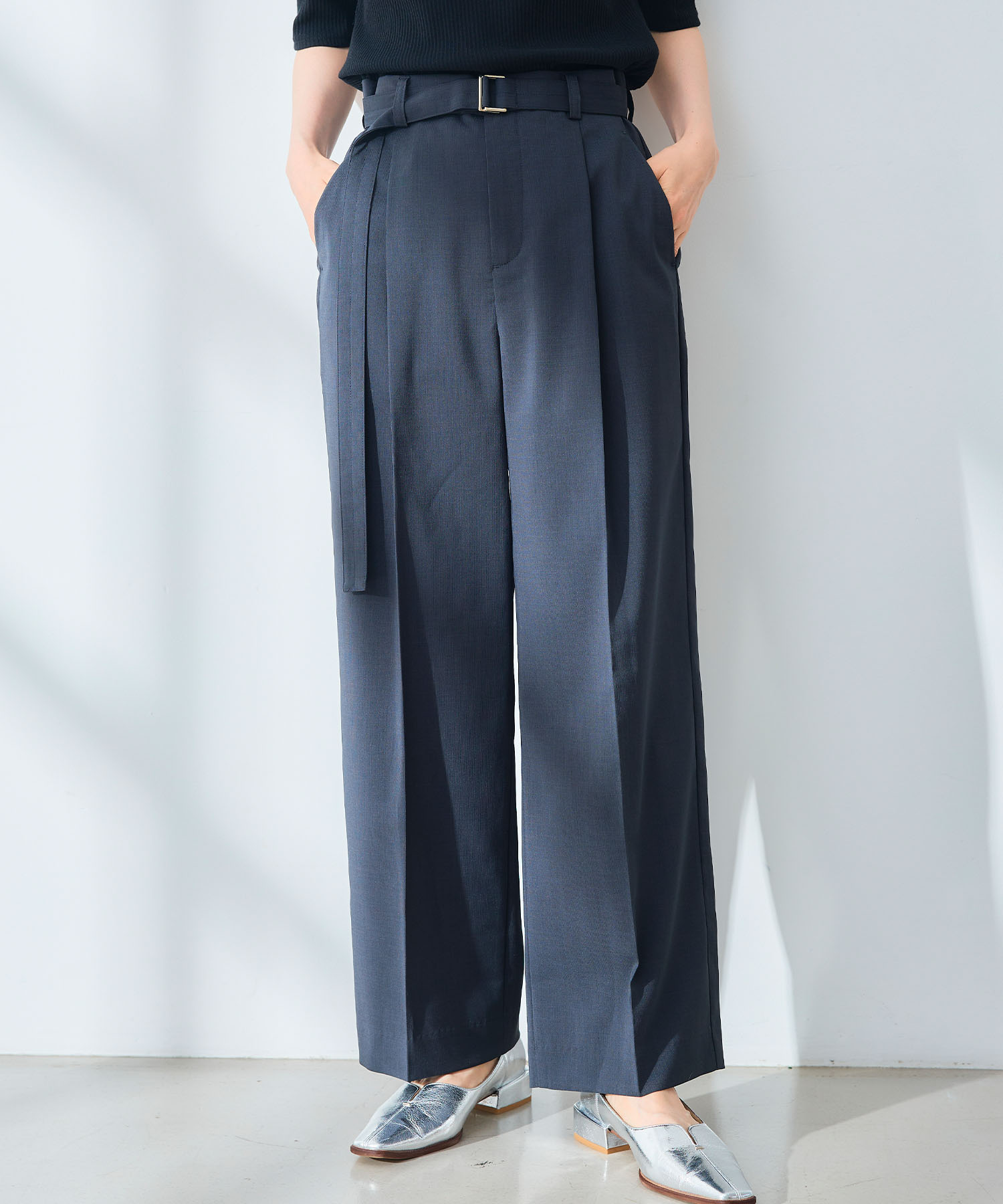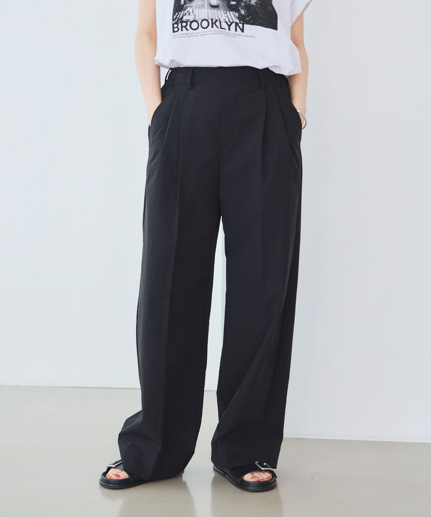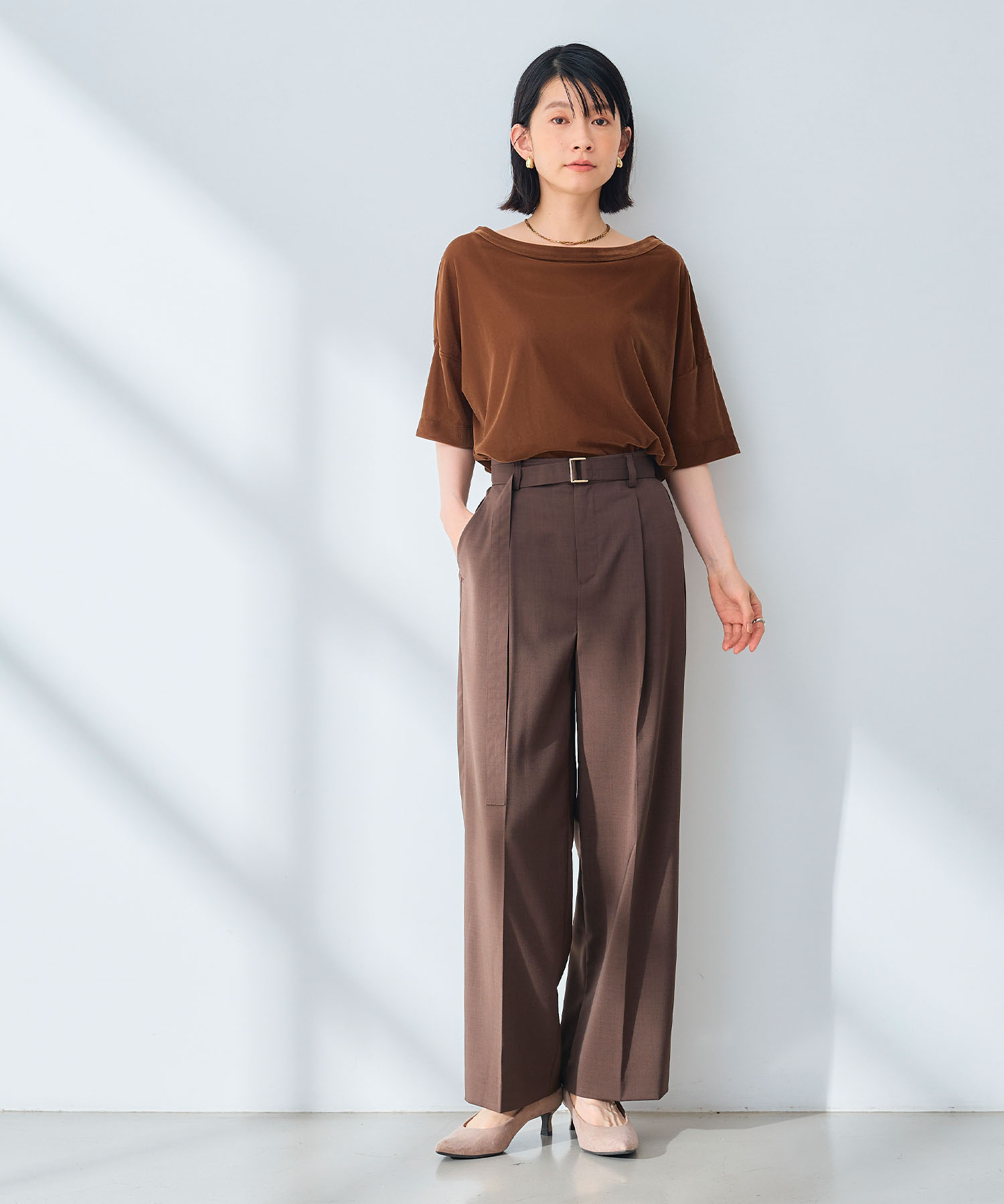 UVカットや吸水速乾の高機能付きで最適な穿き心地ながらも、タック入りのシルエットが美しく、スッキリとした印象にサマ美えするワイドパンツ。涼しさと品の良さを兼ね備えた秋見えコーデが叶うアイテムです。