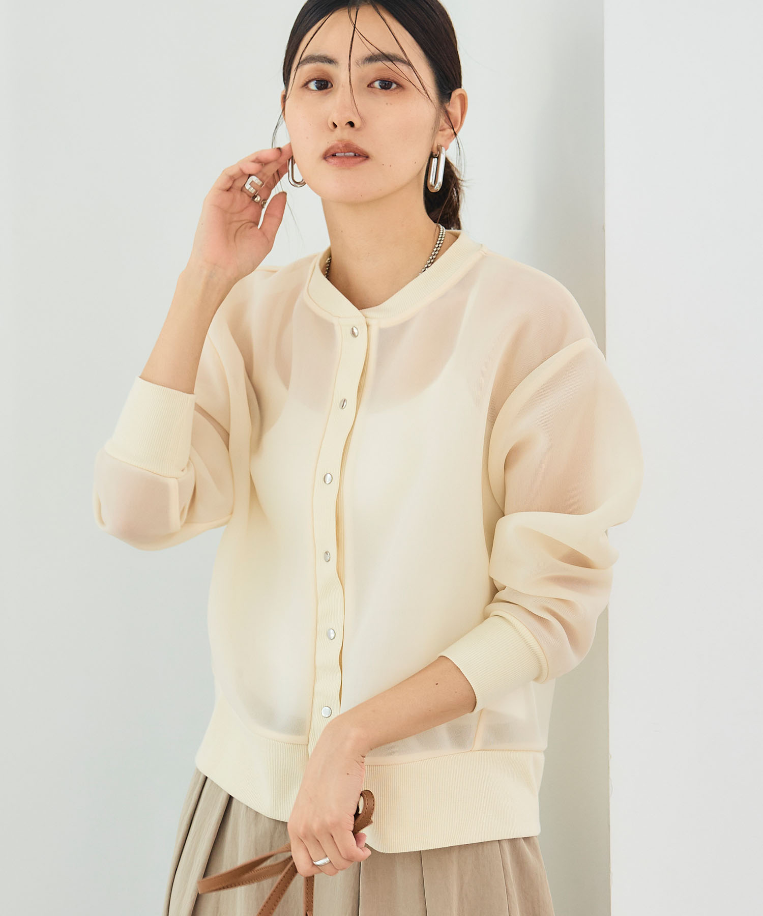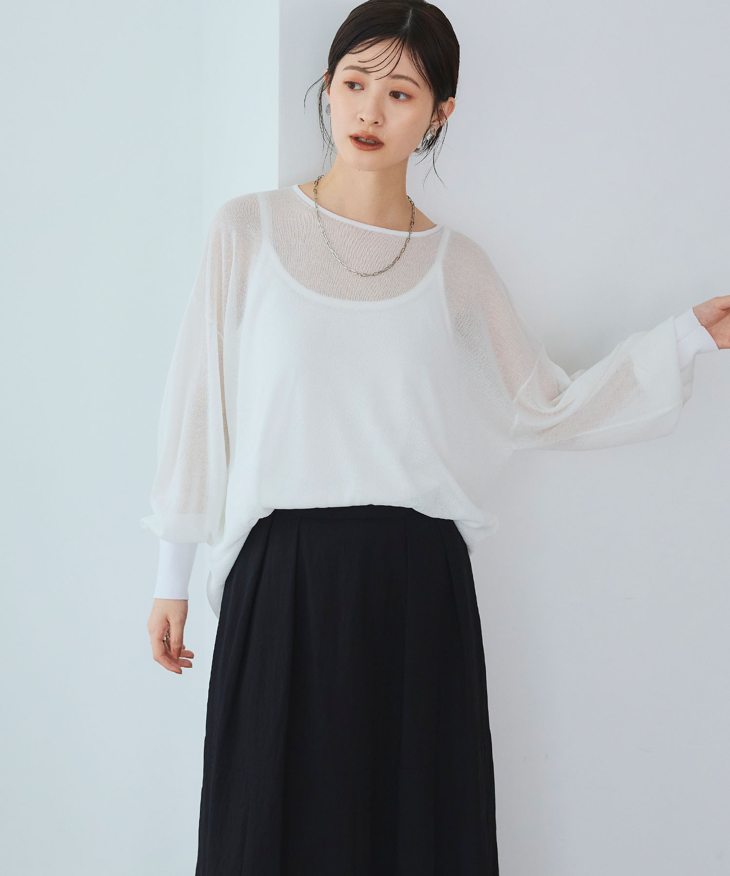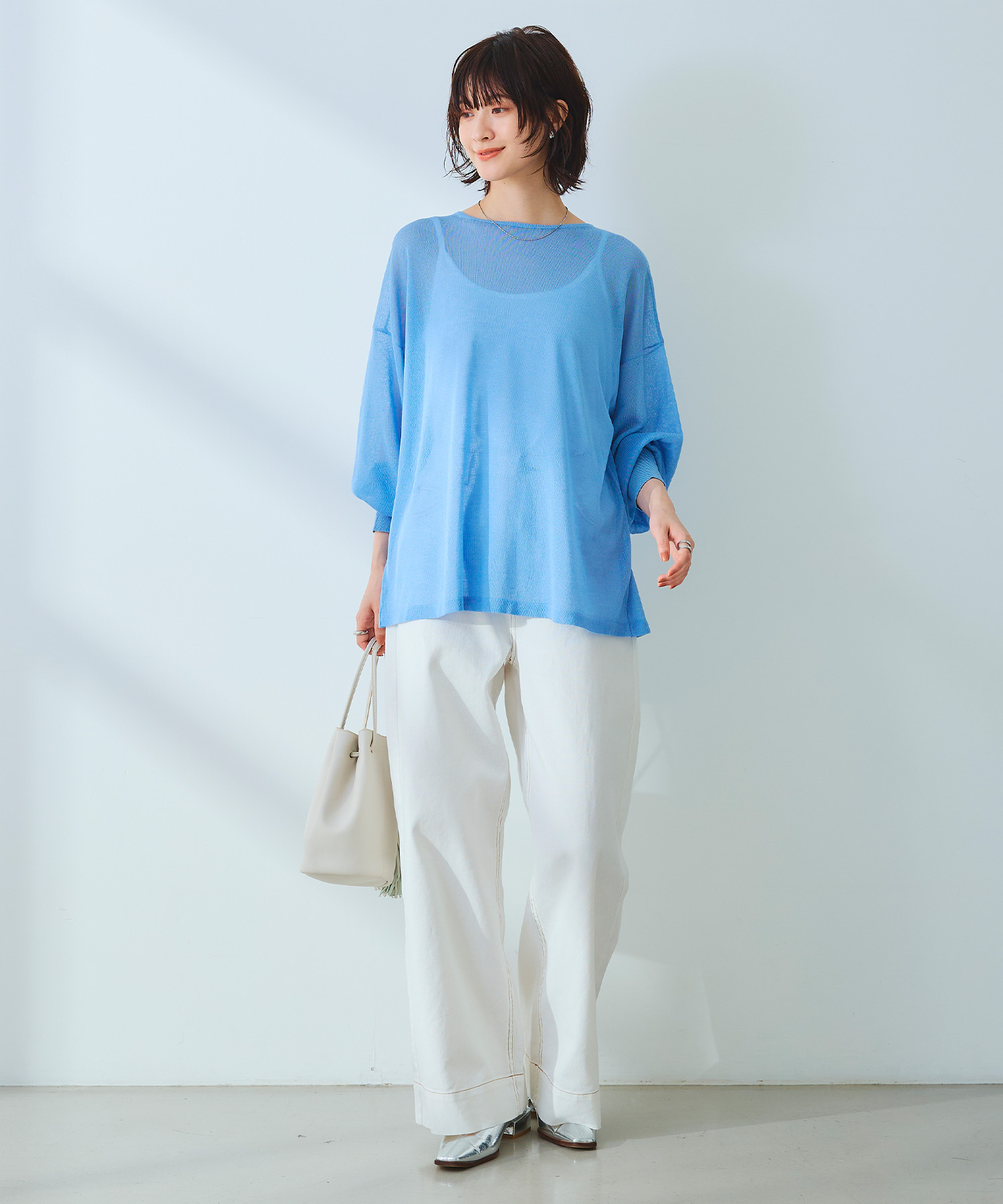 インナー付きで安心して着られるシアーニットは、涼しげな着心地と上品さを兼ね備えたアイテム。ホワイトデニムを合わせてクリーンな印象が引き立つ高見えスタイルに。休日やオフィスカジュアルにも活躍する、洗練された秋見えコーデです。