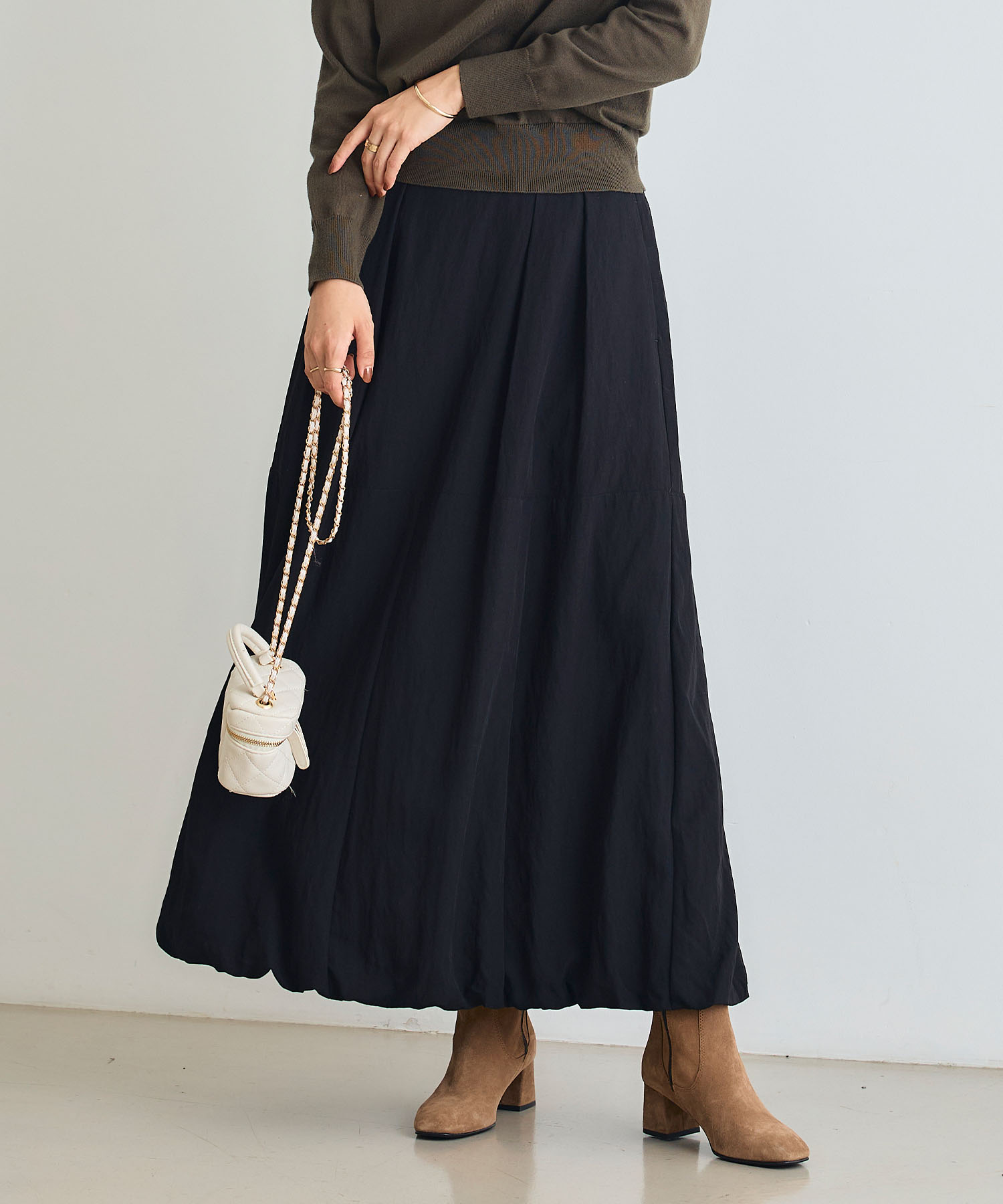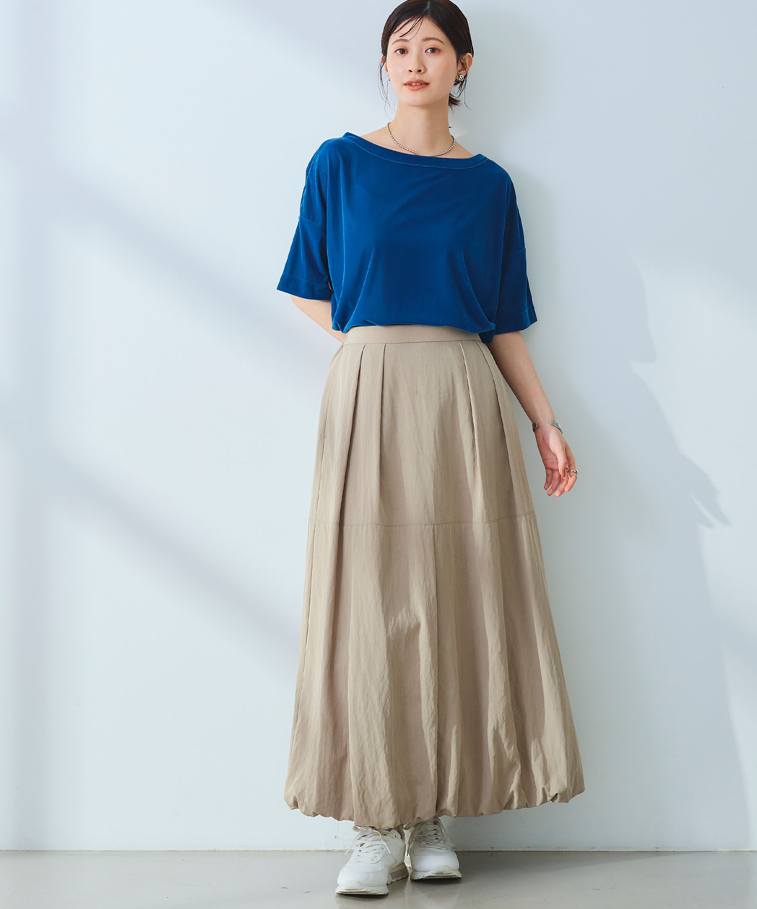 鮮やかなブルー×ニュアンスベージュの組み合わせは秋らしい落ち着き感があり、カジュアルながらも着映えしたスタイルに。バルーンスカートの動きのあるシルエットが華やかさを演出し、こなれ感のある大人の秋見えカジュアルコーデが完成します。