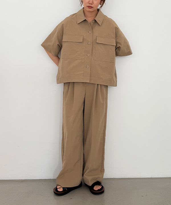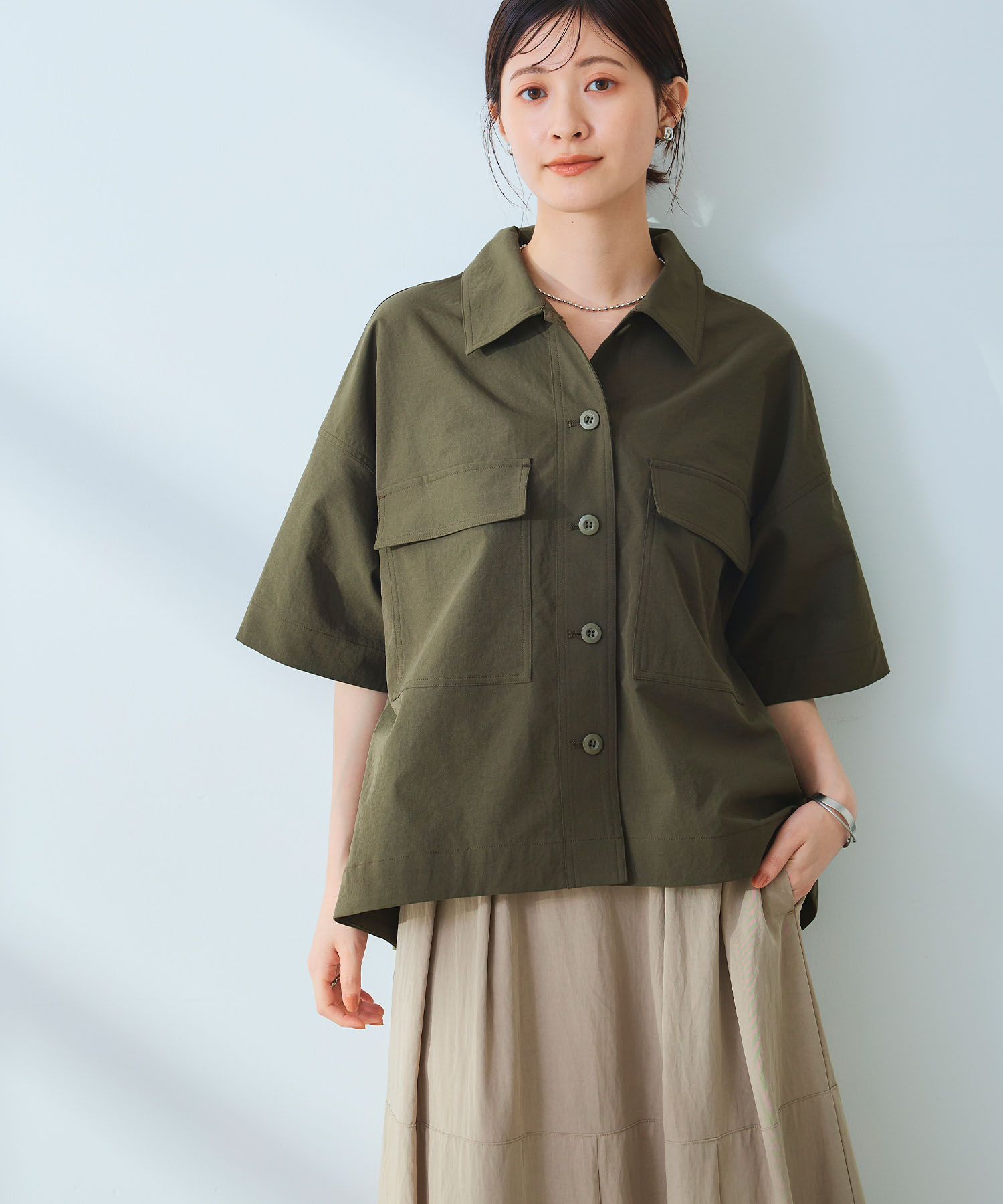 UV&吸水速乾の高機能を備えたシャツジャケットとタックワイドパンツのワンツーコーデ。シャツジャケットが大人女子にはほど程よいミリタリー感を演出し、ワイドパンツのタック入りラインがきちんと感をプラス。秋ムードあるキャメルカラーで高見え効果も抜群のスタイルです。