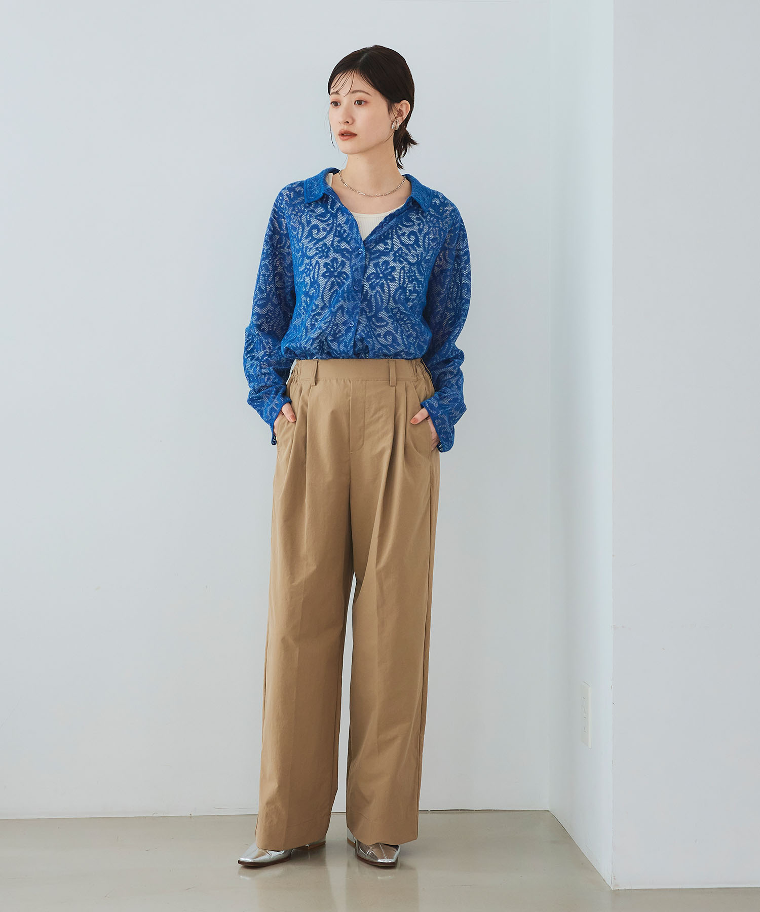 鮮やかなブルーと温かみのあるキャメルの組み合わせは、高見えしながら秋ムードを楽しめるスタイル。レースニットは羽織るだけで着映えし、ホームケアが簡単なのも好ポイント◎。ゆったりとしたタックパンツで体型カバーもしつつ上品に見せてくれる、大人女子の味方コーデです。