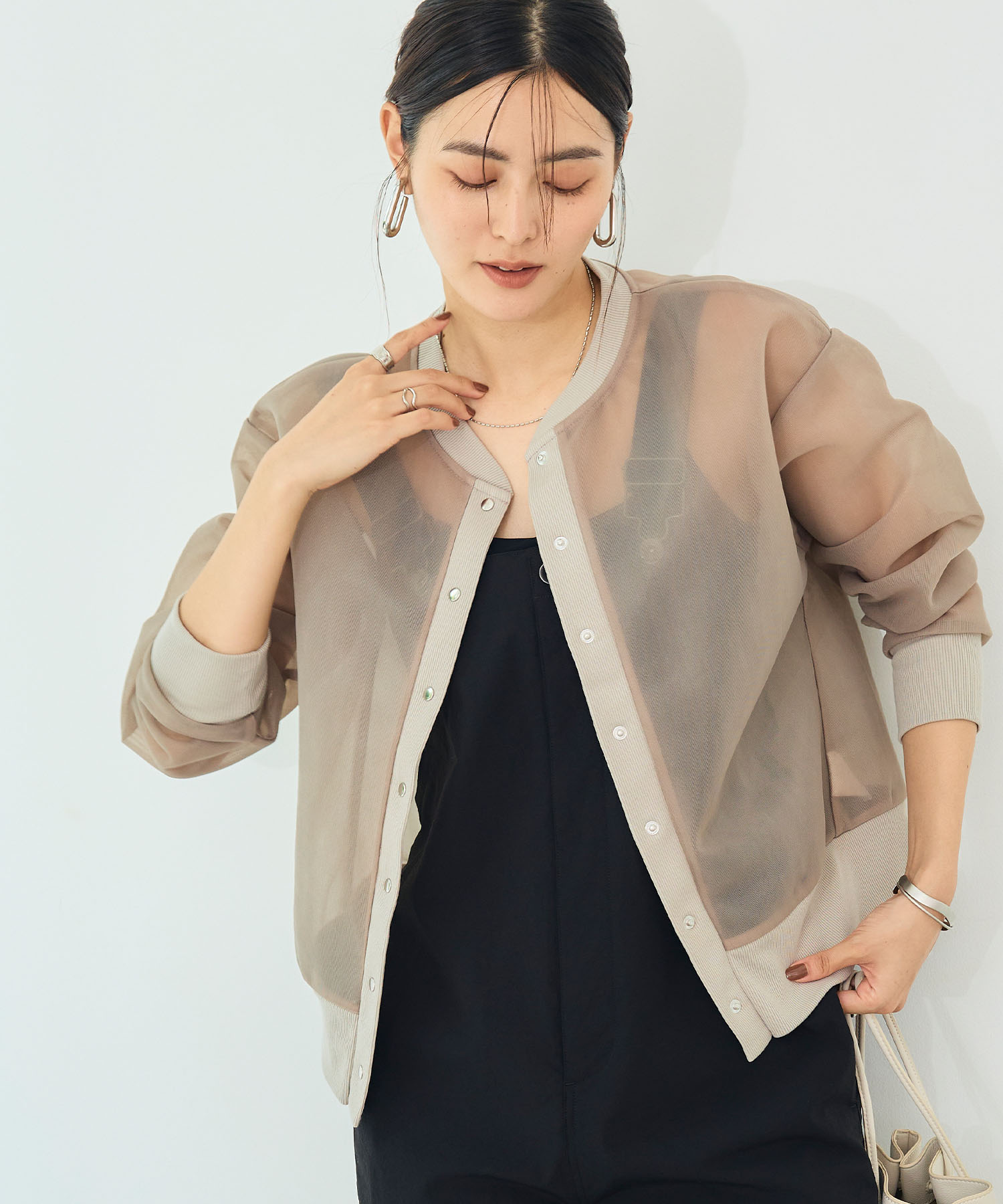 透け感のメッシュ素材が程よい抜け感を演出し、Tシャツやワンピースにさらりと羽織るだけでこなれた印象に。チャコールとベージュの落ち着いたカラー展開で、秋コーデの仕上げに最適な一枚です。