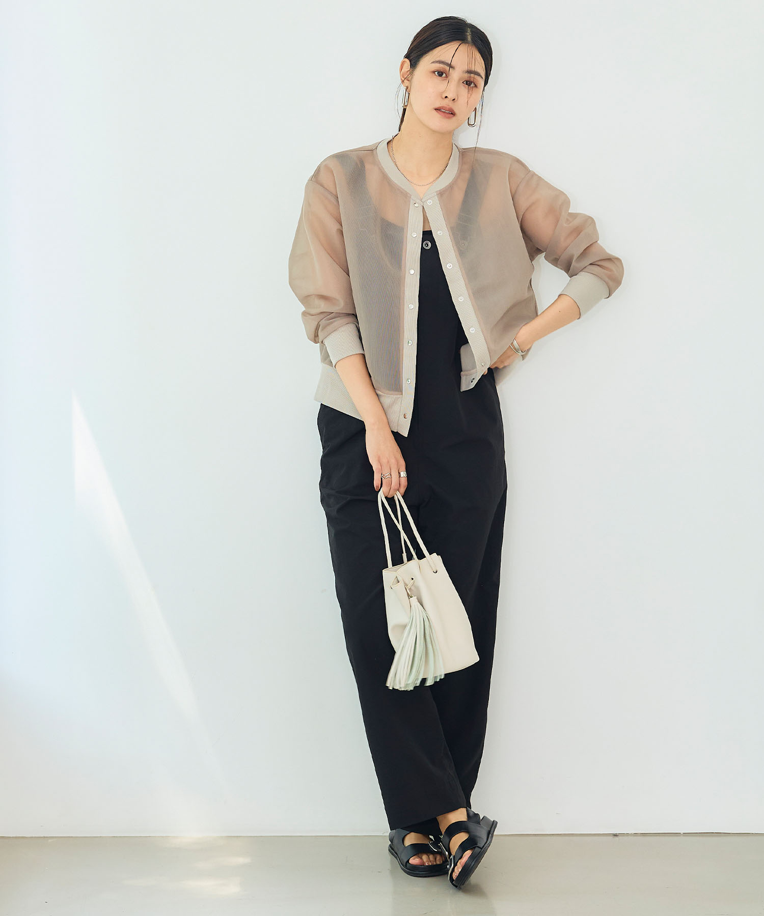 軽やかな透け感が魅力のメッシュシアーカーデは、羽織るだけでこなれ感をプラスできる万能アイテム。カジュアルな印象のサロペットに重ねれば、抜け感のある大人コーデに仕上がります。シアーメッシュは残暑でも涼しく、大人のニュアンスと上品さを両立できるスタイルです。