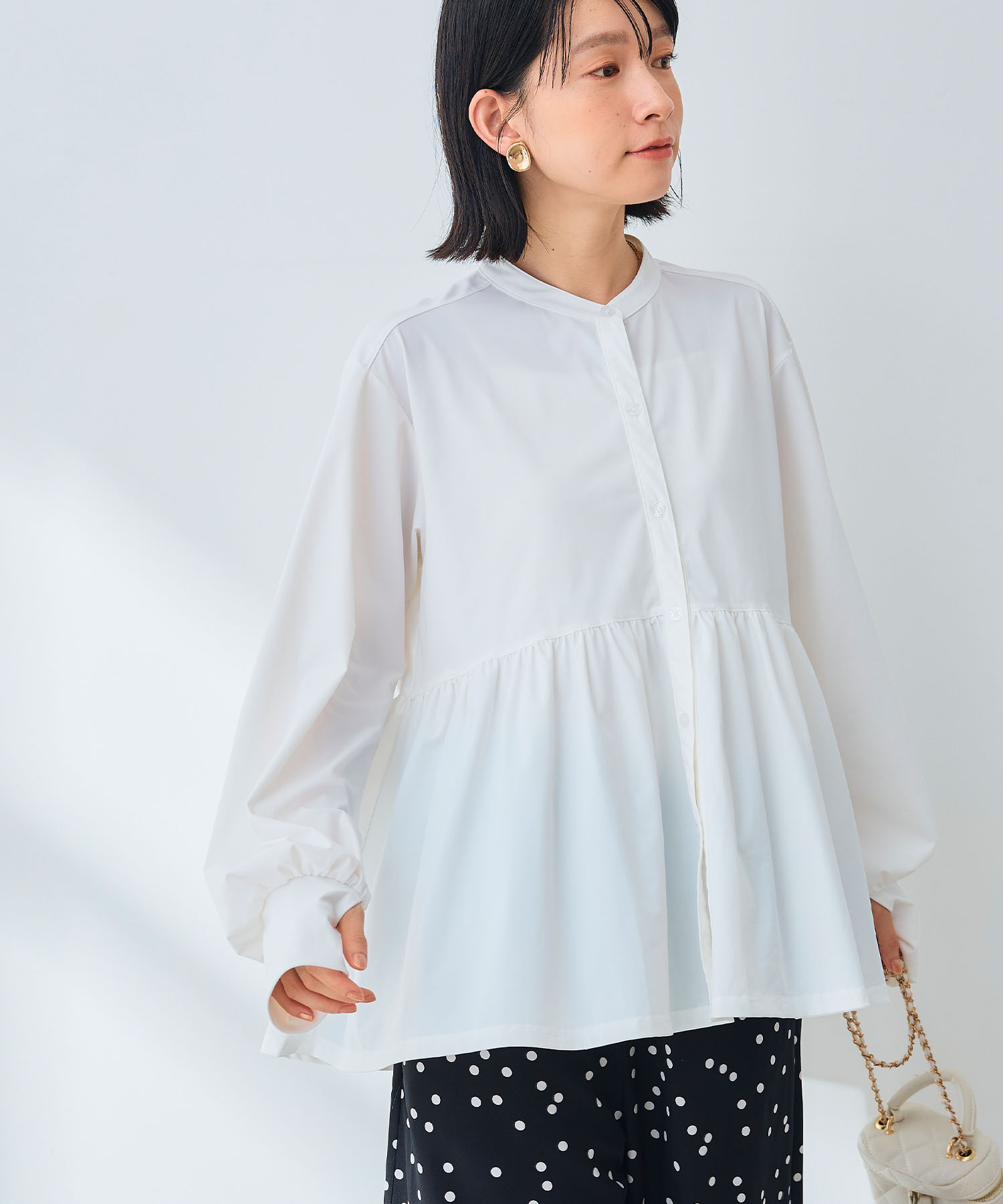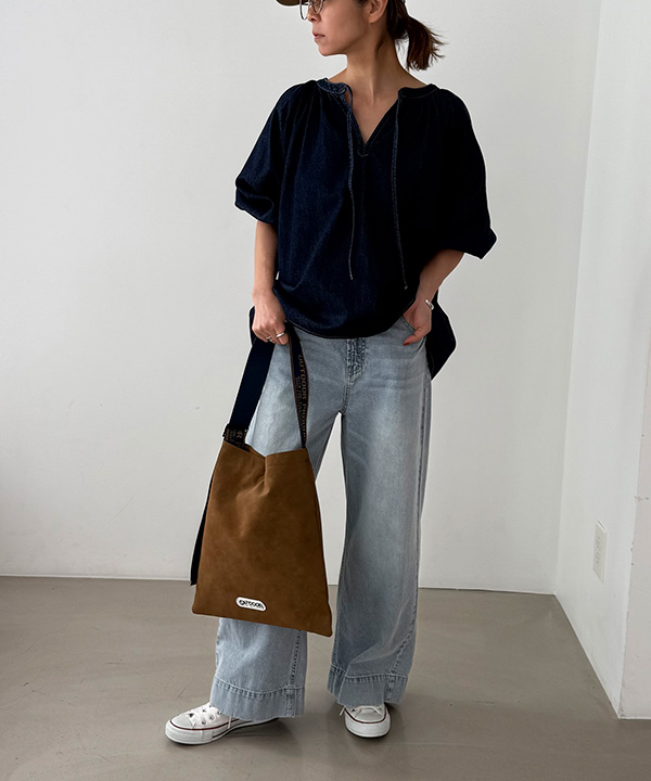 ふんわり広がる裾が女性らしい印象を与えるペプラムブラウスに、ワイドデニムを合わせて程よくカジュアルダウンした、シックなデニムスタイル。ラッシュ機能のあるブラウスなら秋の日差しをカバーし、暑さの残る秋も快適に。シンプルながらも洗練された秋の大人カジュアルです。