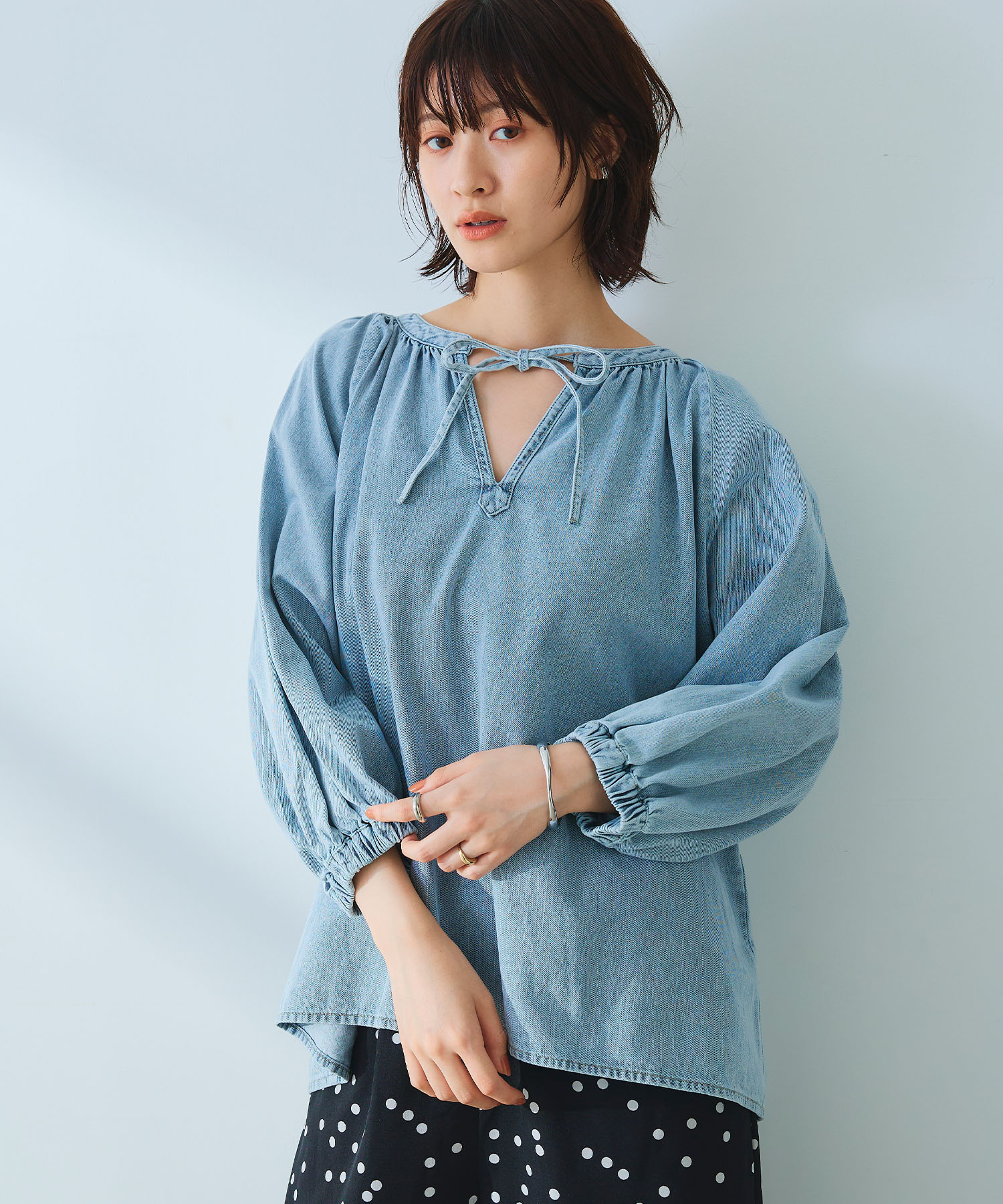 ゆるりと大人見えするカフタンブラウスに、濃淡違いのワイドデニムを合わせたパンツルック。定番デニムも簡単に高見えコーデにサマ変わり。「脱カジュアル」が叶うデニムオンデニムスタイルは、おしゃれに敏感な大人女子にぴったりの秋コーデです。
