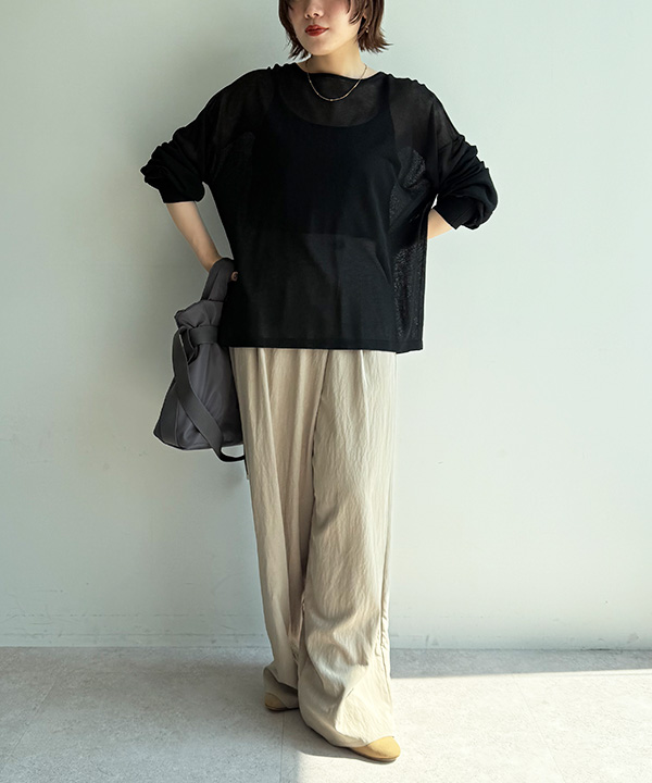 秋見えしつつ涼しさを兼ね備えたシアーニットに、ツヤ感のある軽やかなラップパンツを合わせれば、大人女子にぴったりなリラックスコーデが完成。少しハリのあるニットと接触冷感機能のパンツで涼やかな着心地が叶い、オンオフ問わず秋口のおしゃれを快適に楽しめます。