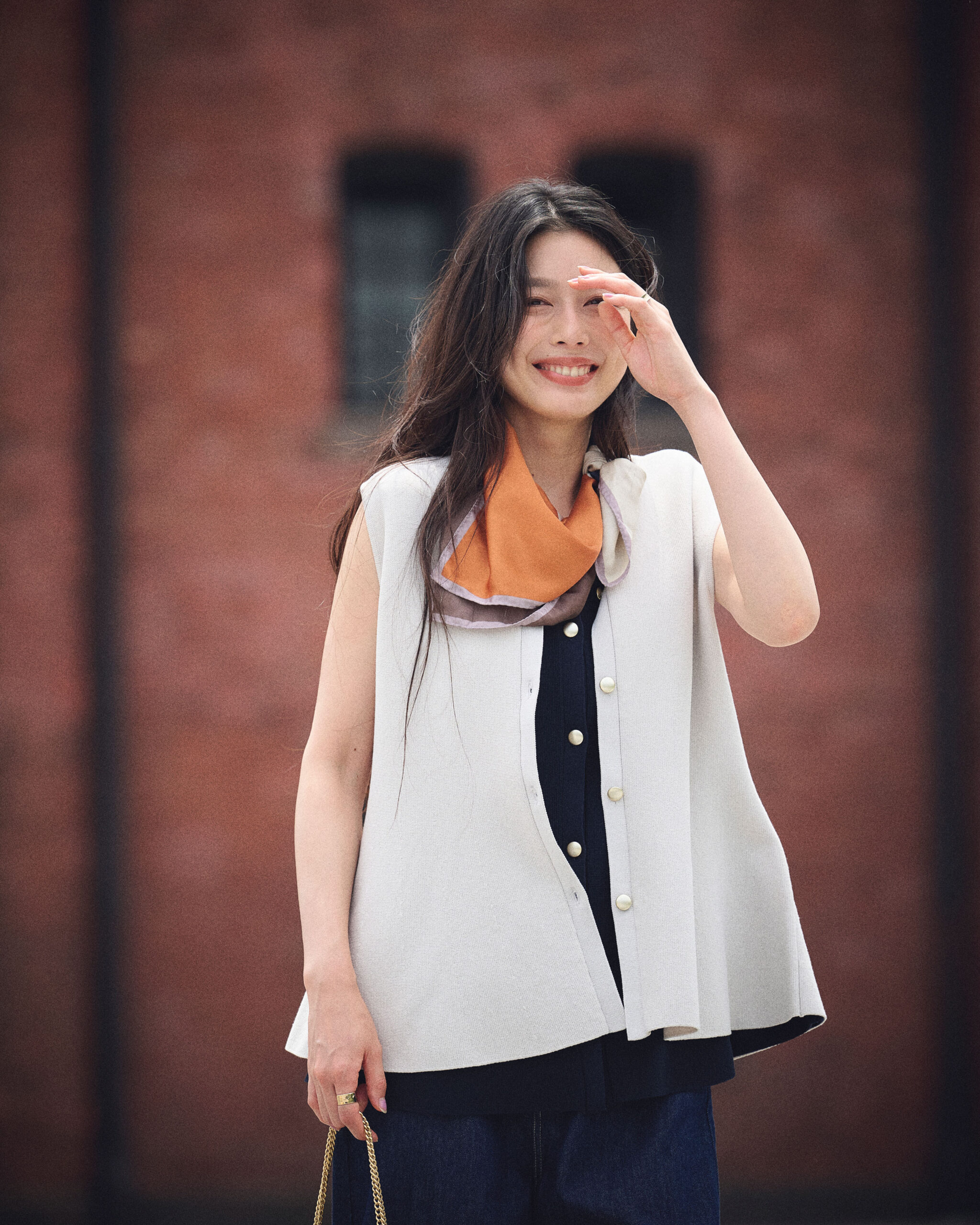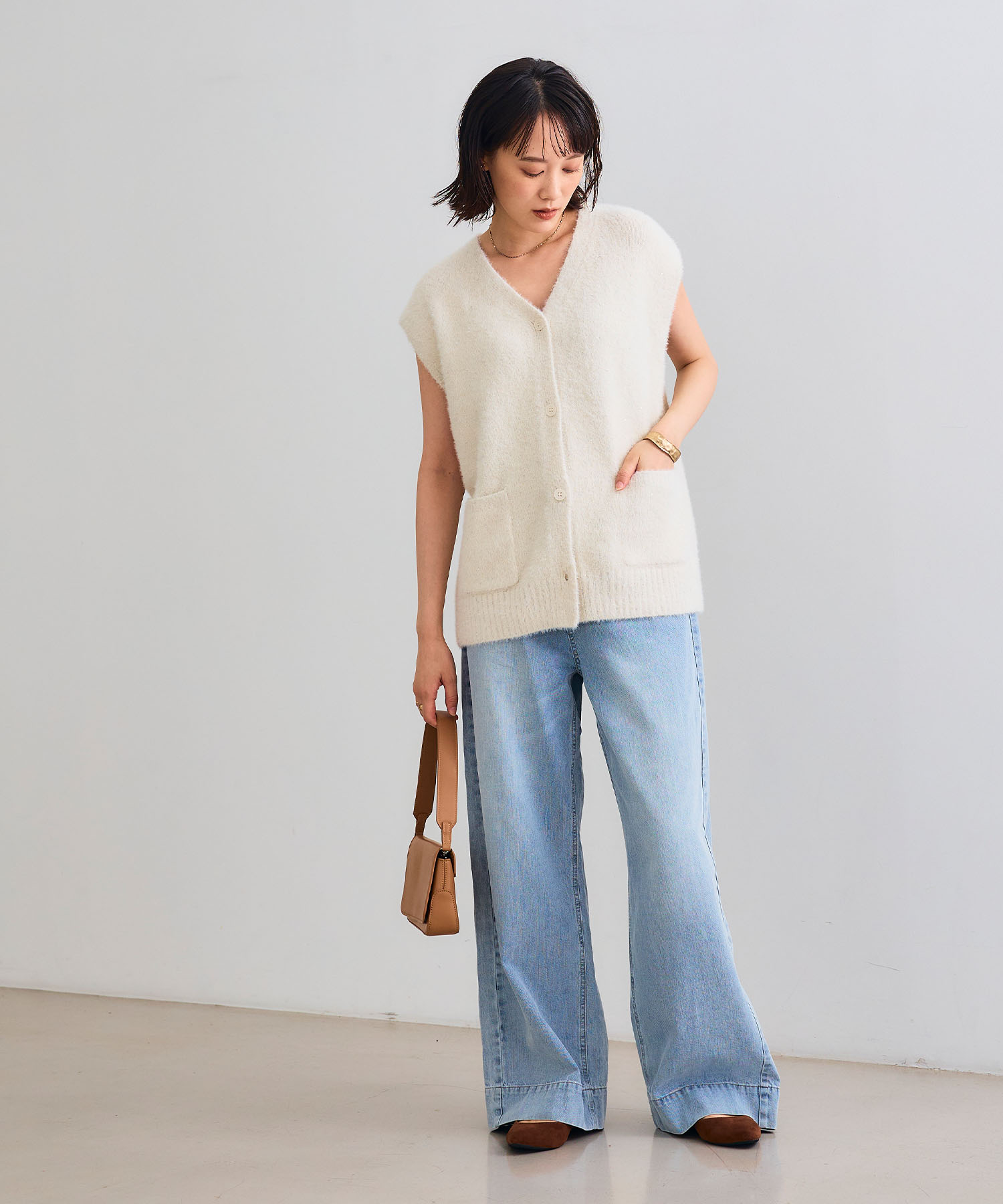 フェザーベスト×ワイドデニムの組み合わせは、シンプルながらも旬な秋スタイルに。柔らかい着心地のフェザーニットベストは最低気温25度の日は1枚で着るのが正解。相性抜群の軽さのあるワイドデニムなら、忙しい朝もワンツーコーデが完成します。