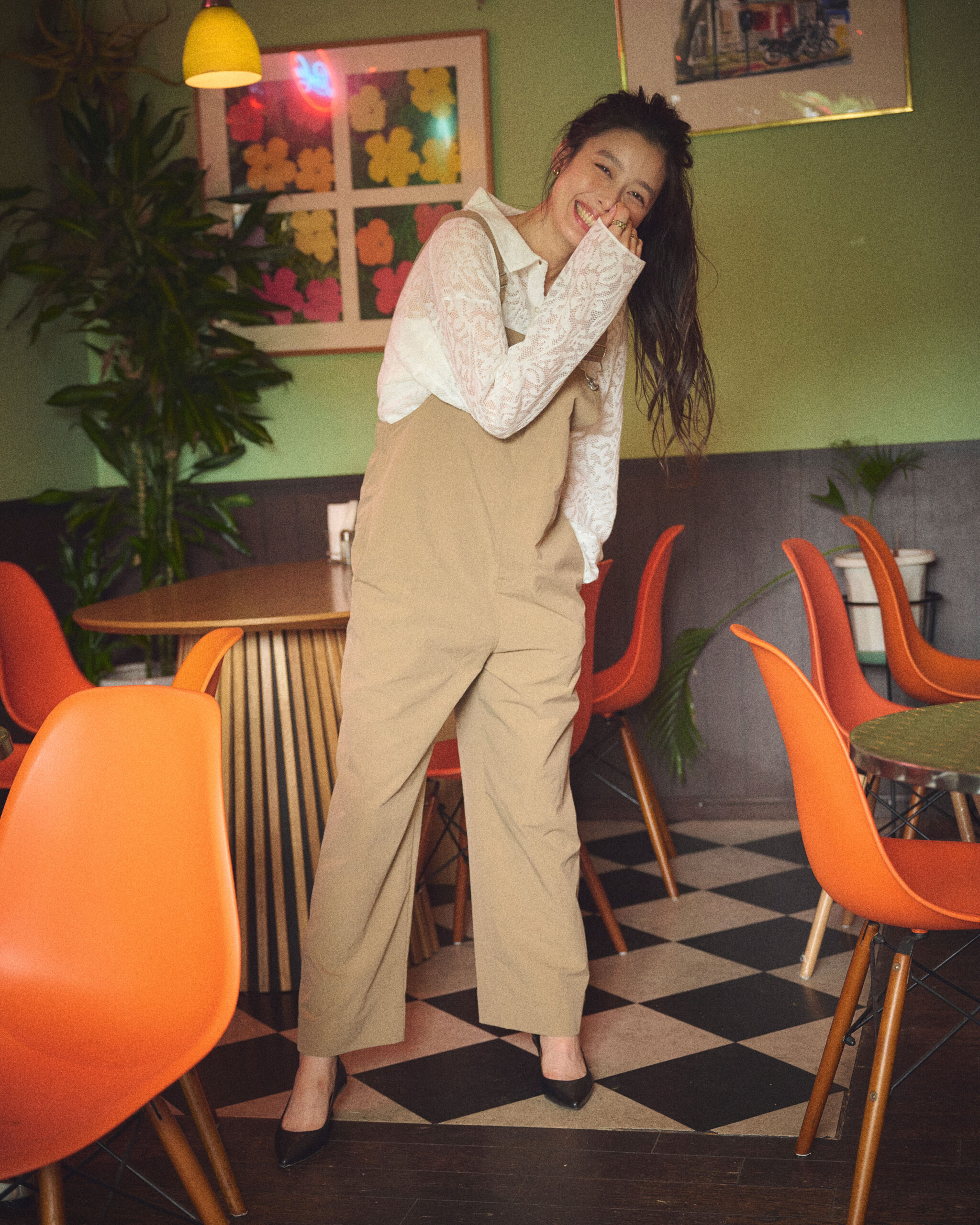 ココアカラーのシアートップスとインディゴデニムのスタイルは、最低気温25度の暑秋でも、秋見えするカラーコーデ。トップスの程よい肌見せにインディゴデニムの落ち着きのある深みが加わり、シンプルながらも洗練された大人カジュアルに仕上がります。