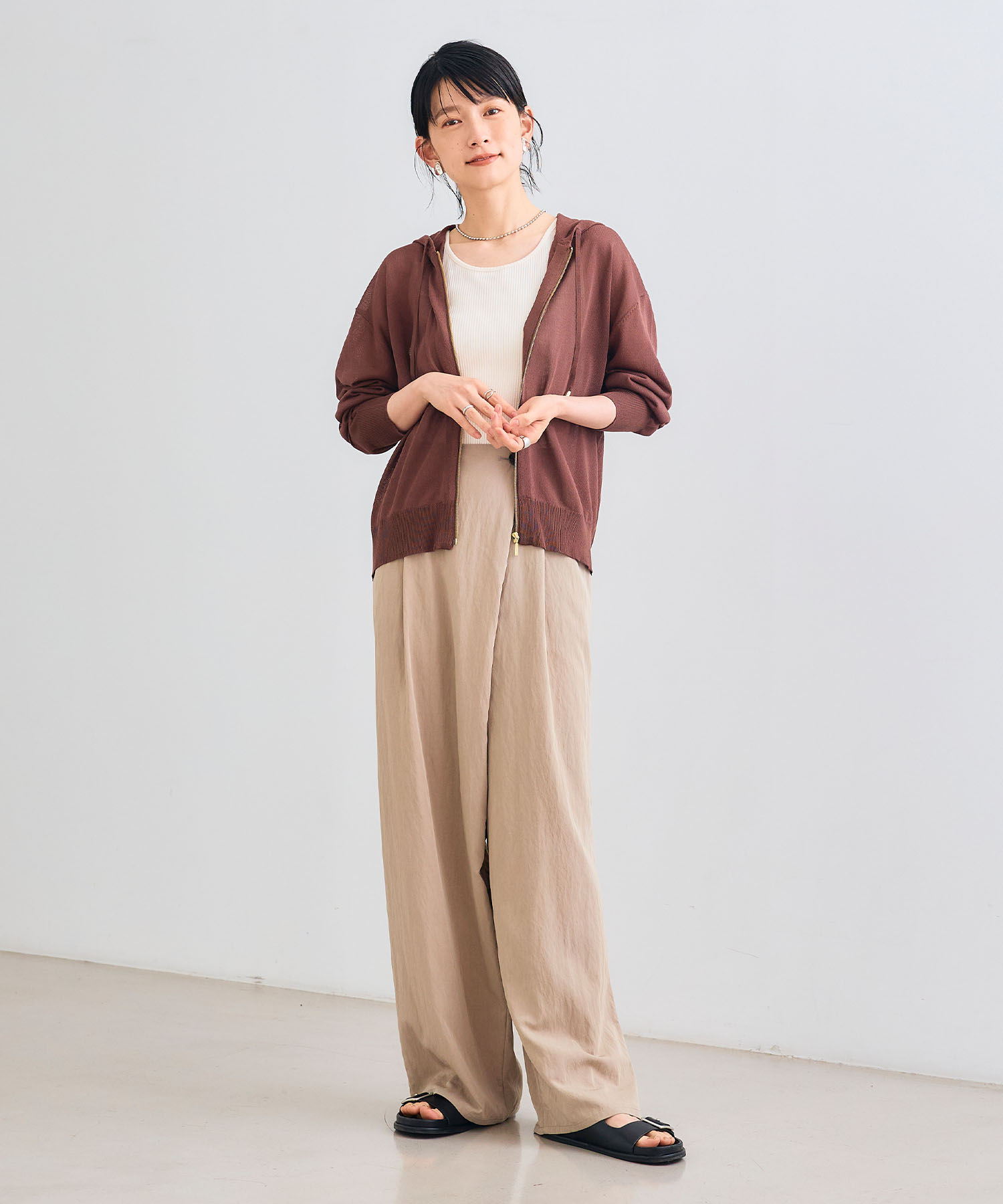 シアーパーカーとワイドパンツをブラン系でまとめることで、全体に統一感が生まれ、上品かつリラックス感のある大人カジュアルに。シアーパーカーを羽織ることで、最低気温25度の日の朝晩と日中の気温差にも対応でき、おしゃれと実用性を兼ね備えた万能コーデに仕上がります。