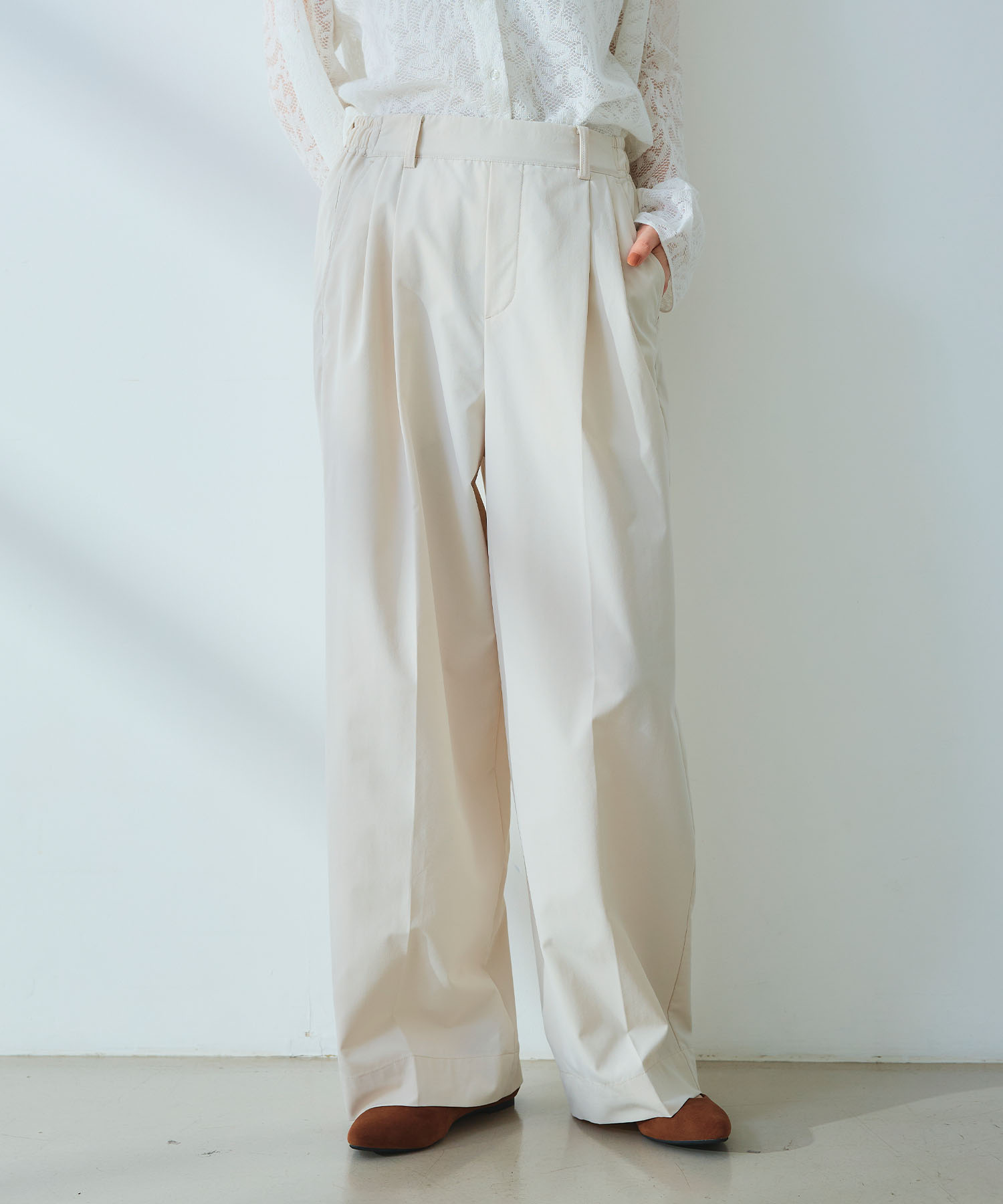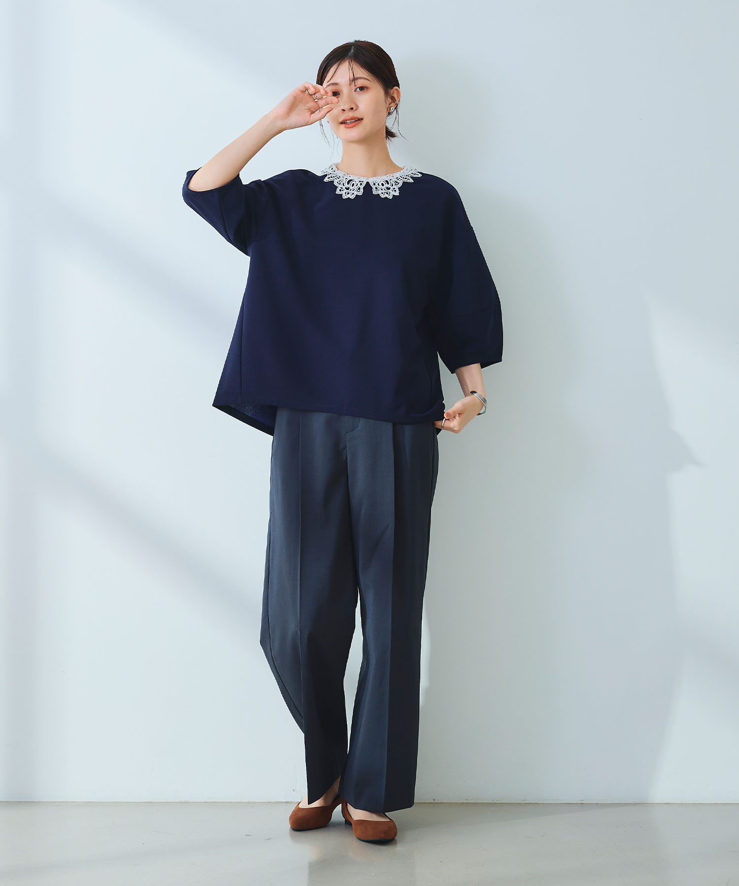 ネイビーのレース襟トップスにセンタープレスパンツを合わせた、最低気温25度の暑さでもきちんと感をキープできる味方服。ワイドパンツには通気性やUVカット機能もあり、品の良さと機能を兼ね備えた、おすすめオフィスカジュアルです。