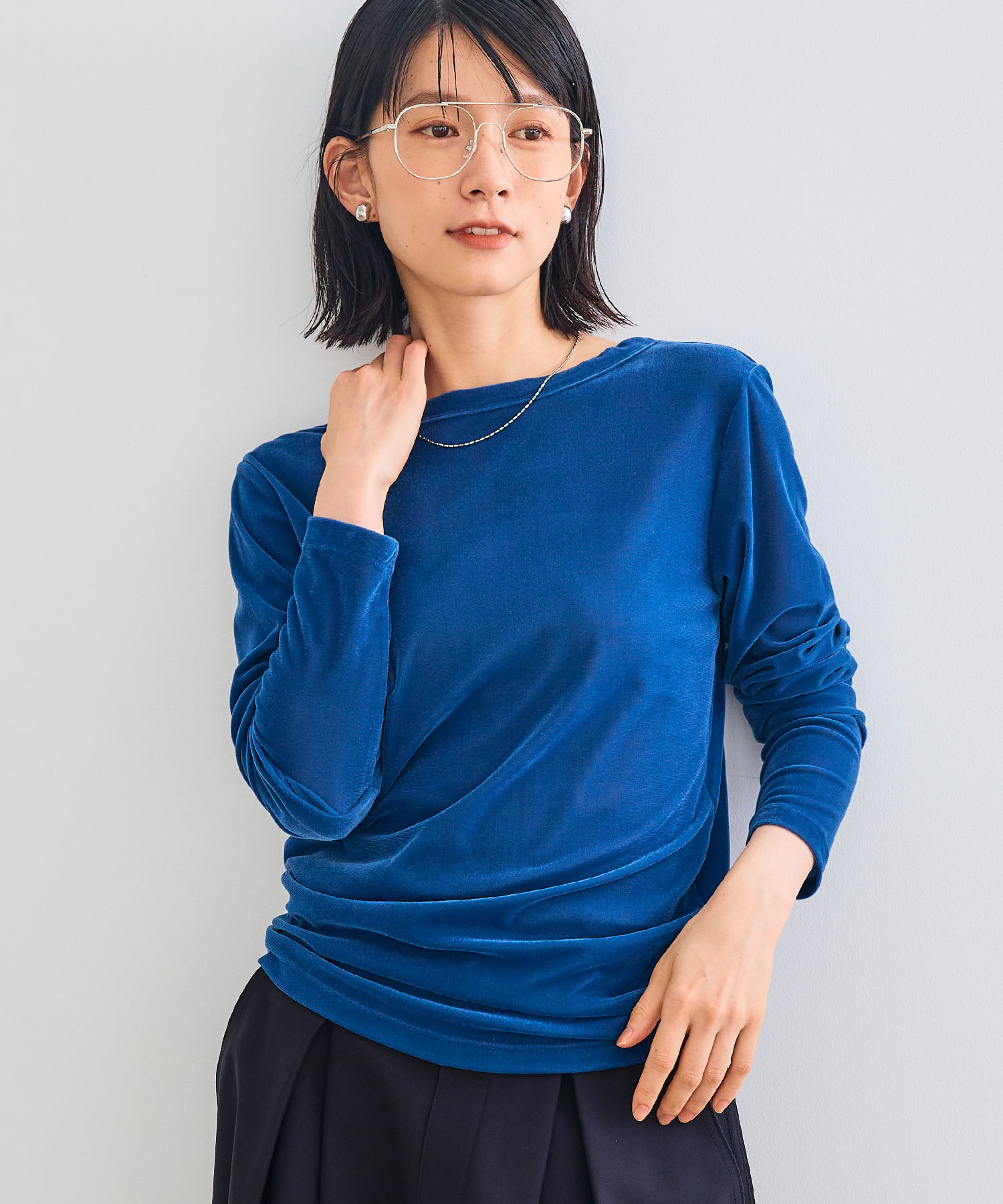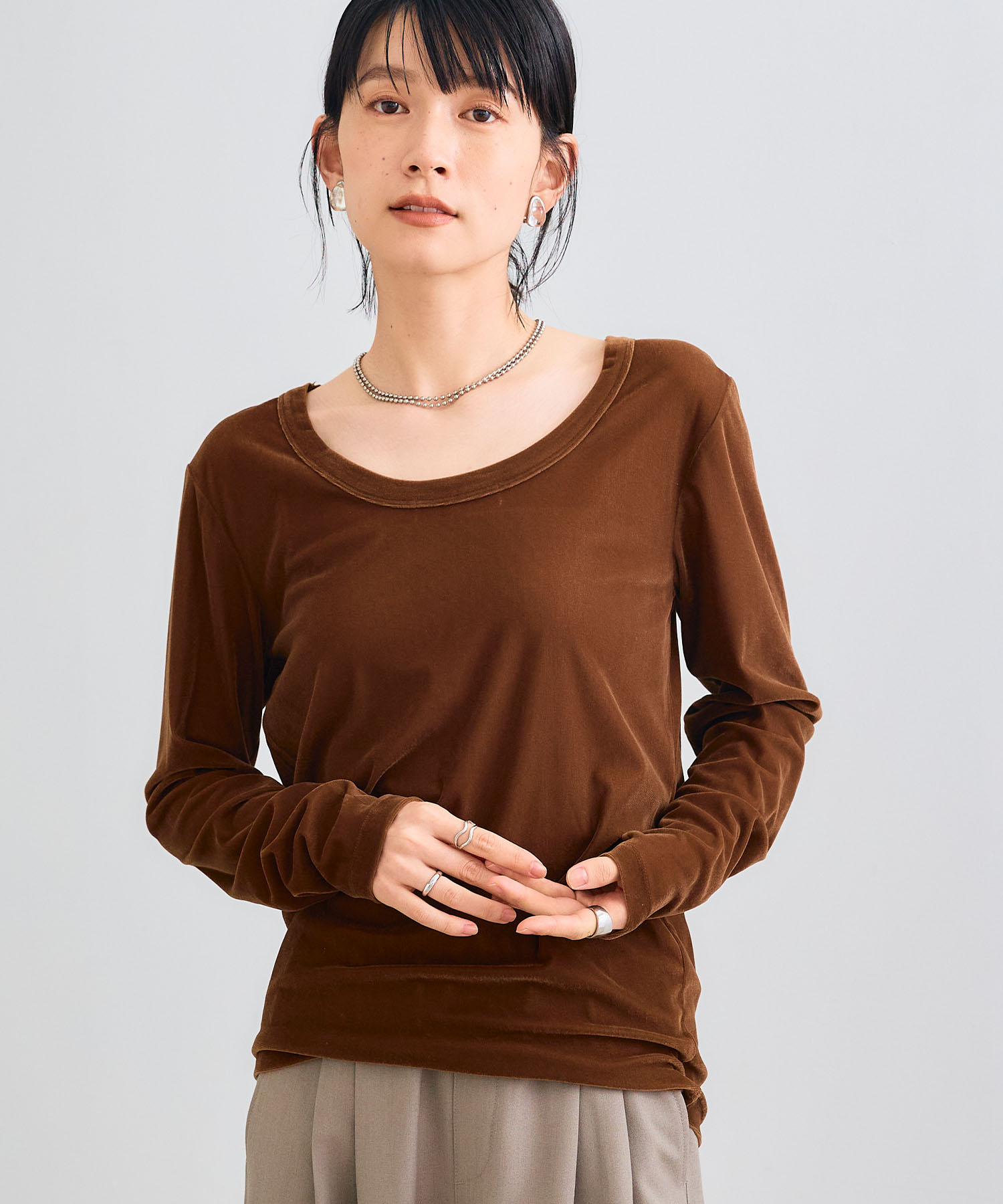 通気性に優れたシアーベロア素材は、最高気温25度の日でも心地良さをキープ。ボートネックとUネックを切り替えられる2WAY仕様で、シーンに合わせて着回すことができます。ほのかな光沢が大人の余裕を添え、デイリーにも使える1枚です。