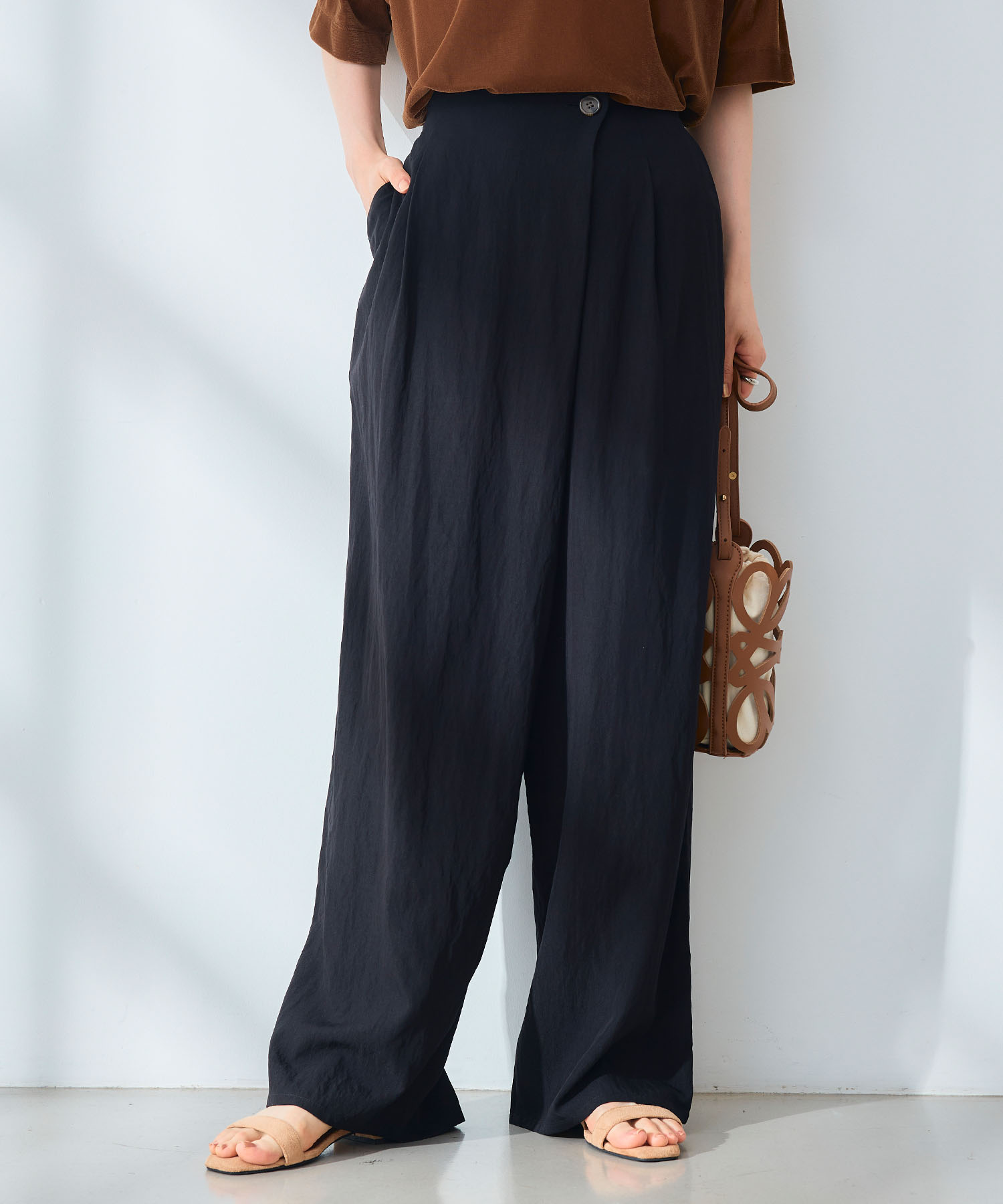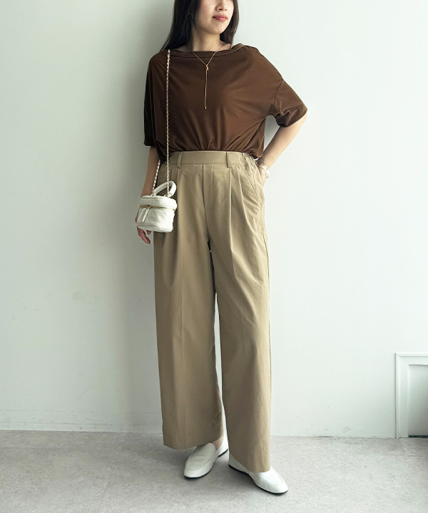 高通気性なシアーベロアトップスと、ワイドパンツの組み合わせは、シンプルなワンツーコーデながらも、素材とシルエットで秋見えをアピール。最低気温25度の日もトレンドのブラウンカラーでまとめれば旬な着こなしが完成します。
