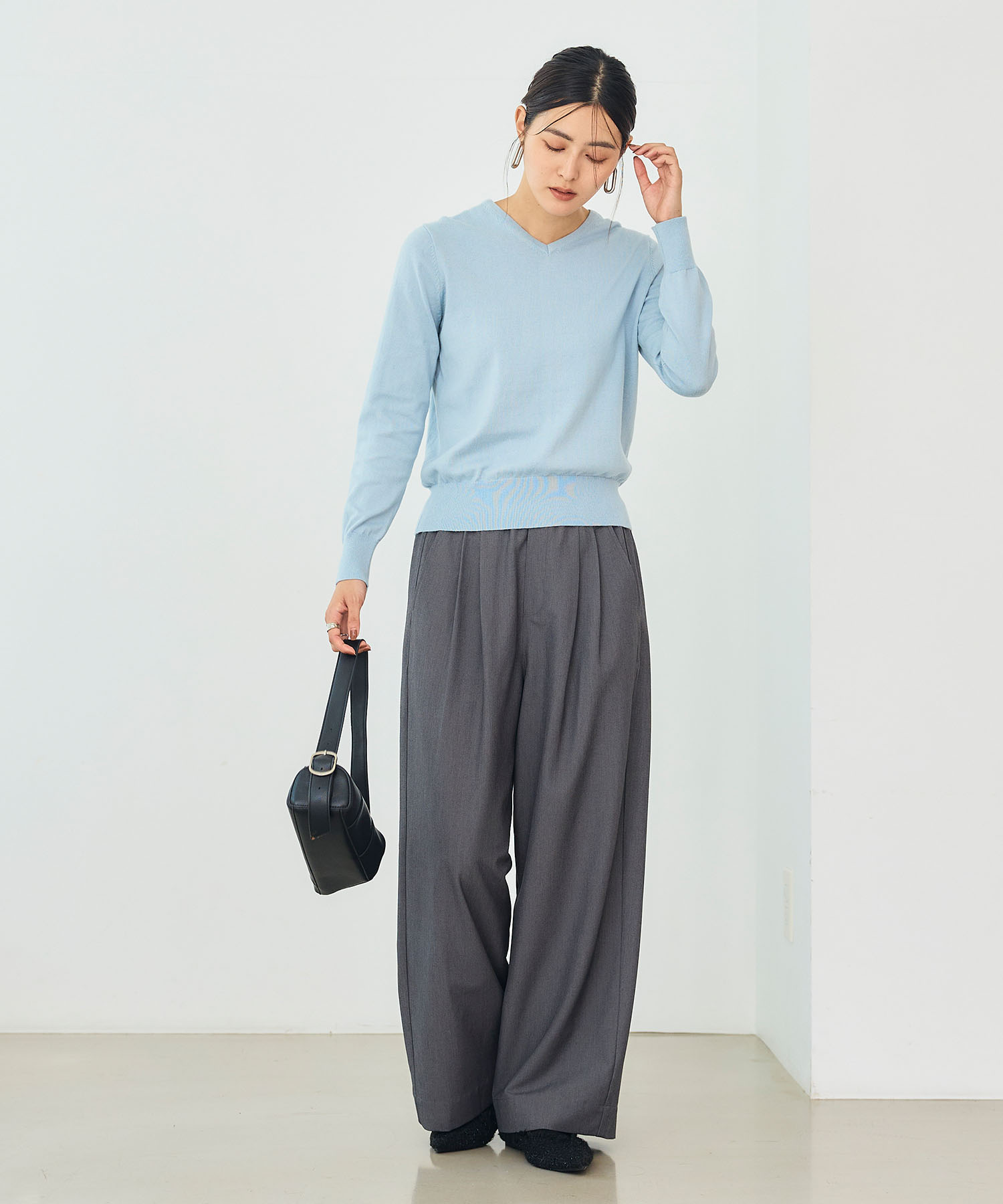 Vネックのライトブルーニットにワイドパンツを合わせれば、最高気温25度の日でも清涼感のある装いに。シンプルながら色使いで大人の余裕を感じさせ、ゆったりとしたパンツシルエットがバランスよくまとまります。オフィスでも活躍するきれいめカジュアルです。
