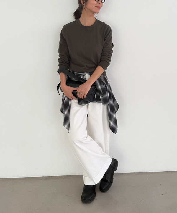 カーキニット×ホワイトワイドデニムにシアーチェックシャツを腰巻きした、大人カジュアル。腰に巻いたシアーチェックのレイヤードが、程よいコーデのアクセントに。最高気温25度の朝晩の温度調整も自由自在です。