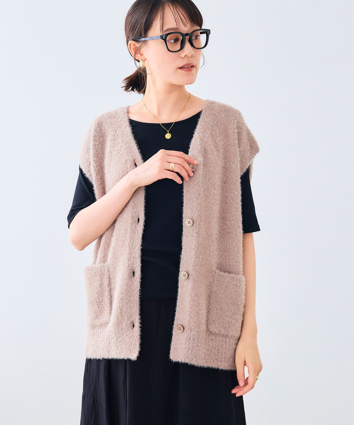 軽やかなフェザーヤーンのベストは、最低気温25度にちょうど良い1枚。散りばめられたスパンコールが華やかさを添え、1点投入するだけで秋ムードを演出できるアイテムです。