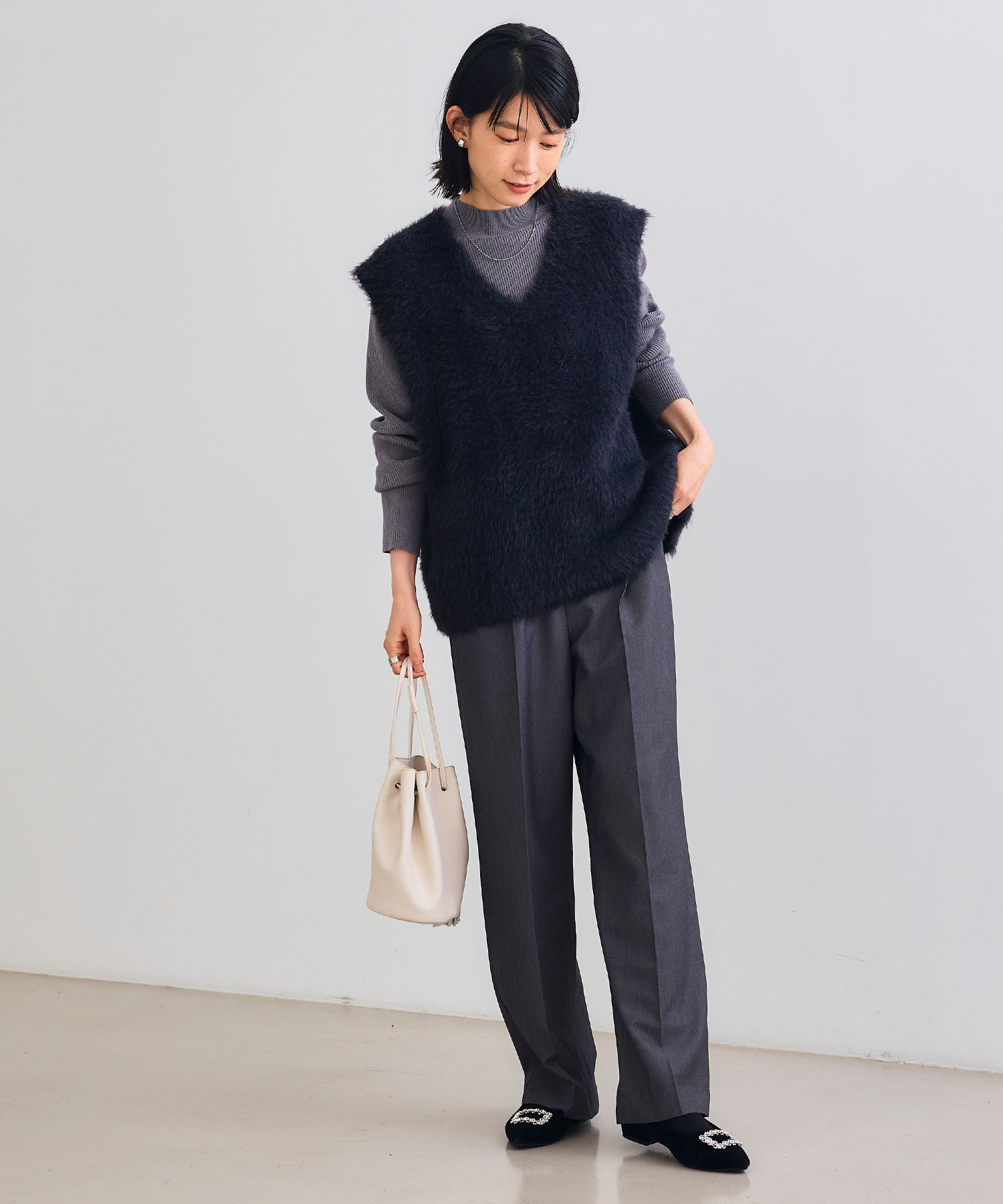 グレーよりこなれ感があがるチャコールニットは、黒パンツで程よく締めて大人の品をキープ。セミフォーマルなシーンにも活躍します。