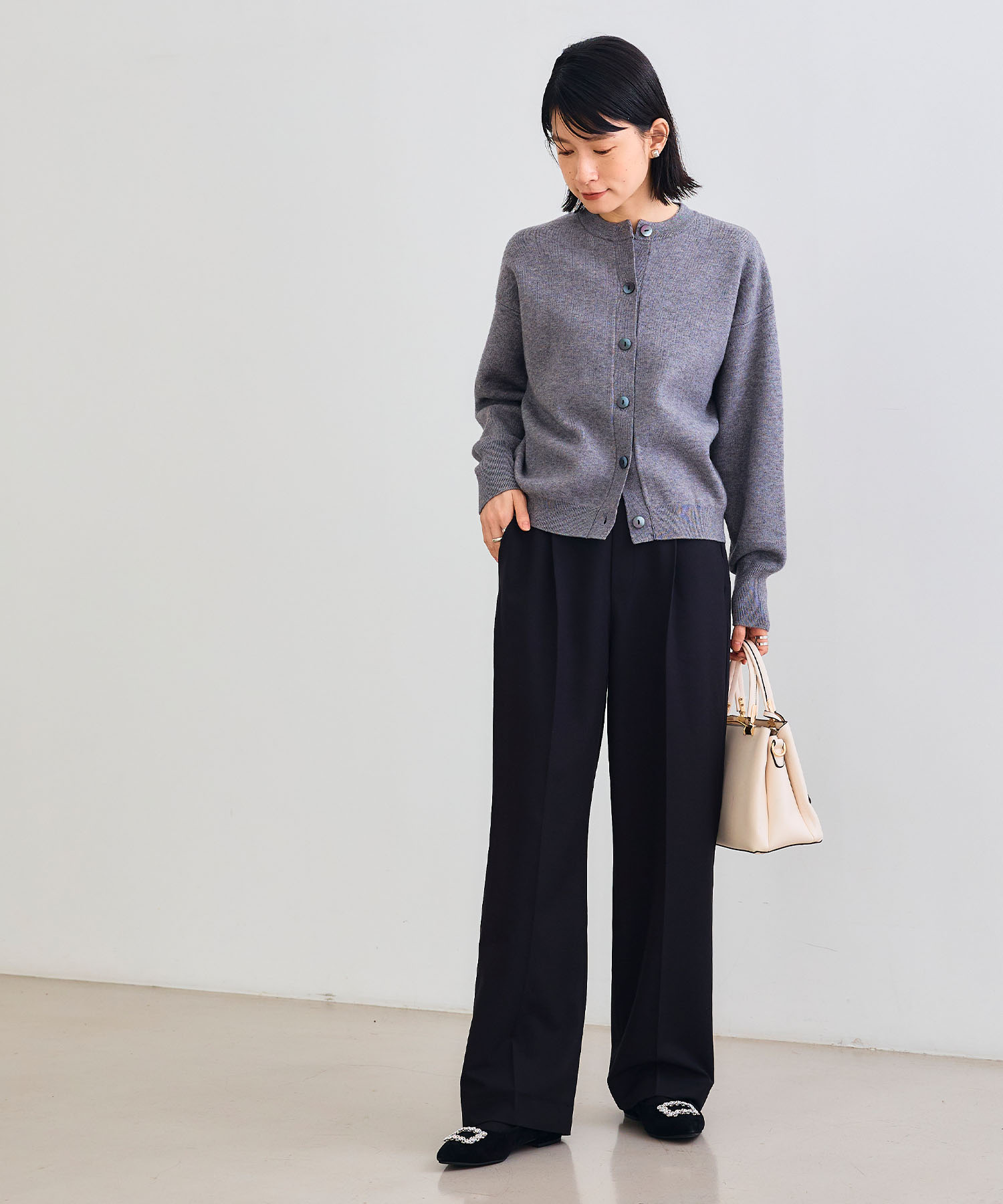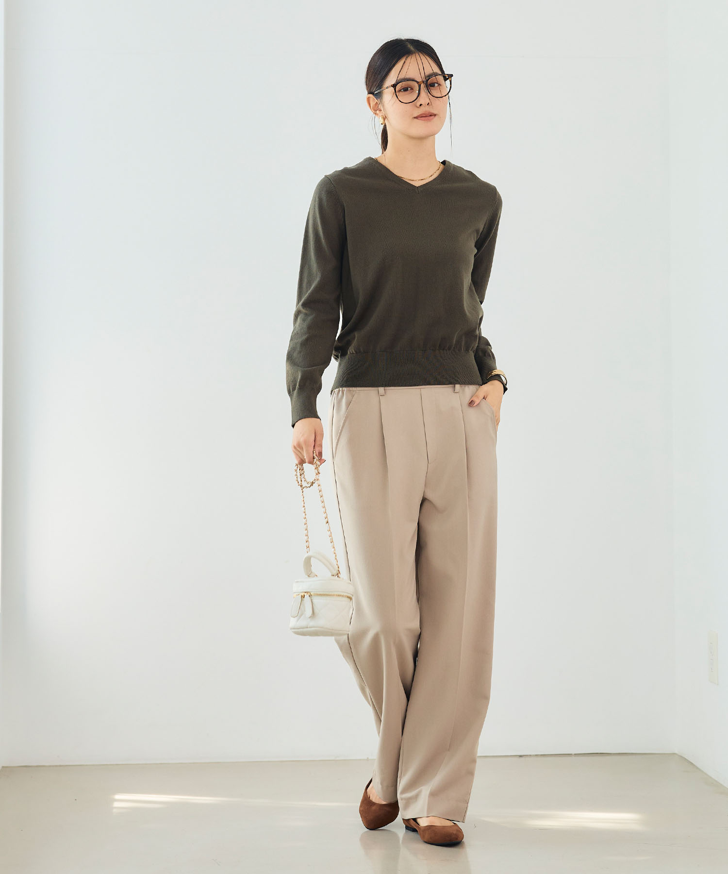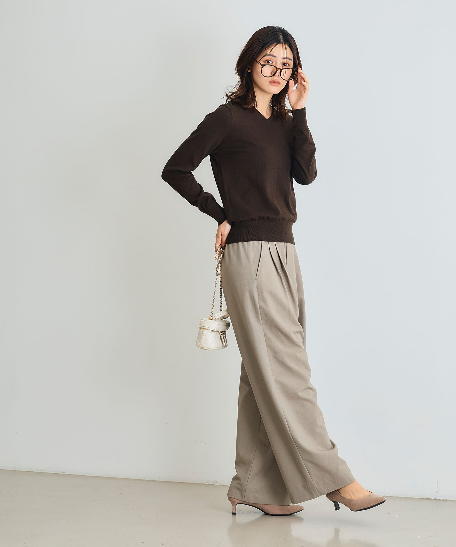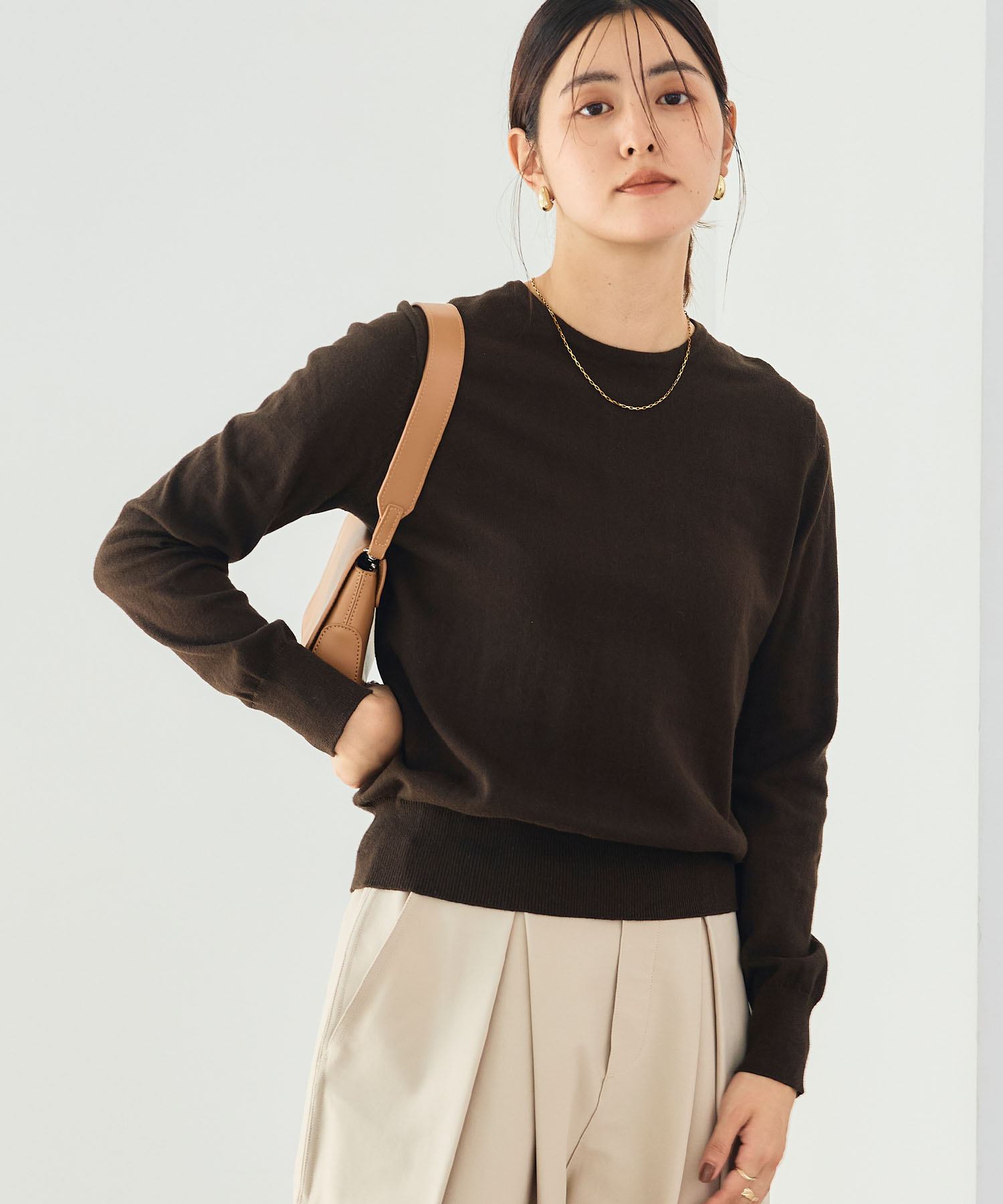 旬のブラウンはこの秋冬のワードローブのおすすめカラー。ベージュパンツの同系色コーデで、ベーシックなニットスタイルを大人の着こなしに更新します。