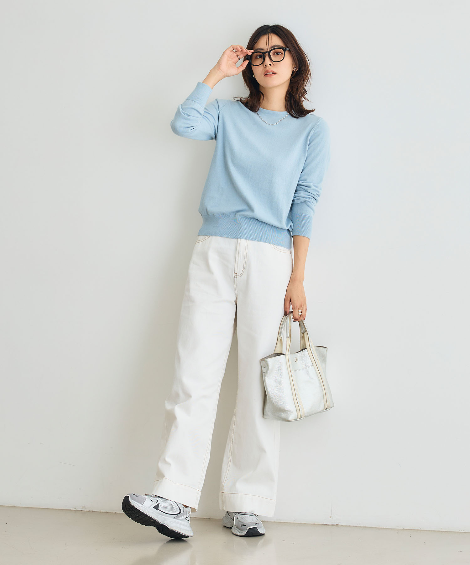清潔感のあるライトブルーニットは、グレーパンツと合わせることで落ち着きと爽やかさを両立。クリーンさもキープでき、オフィスでも好印象を与えるスタイルに。