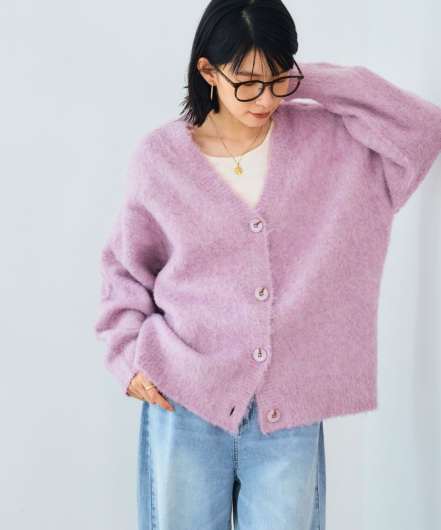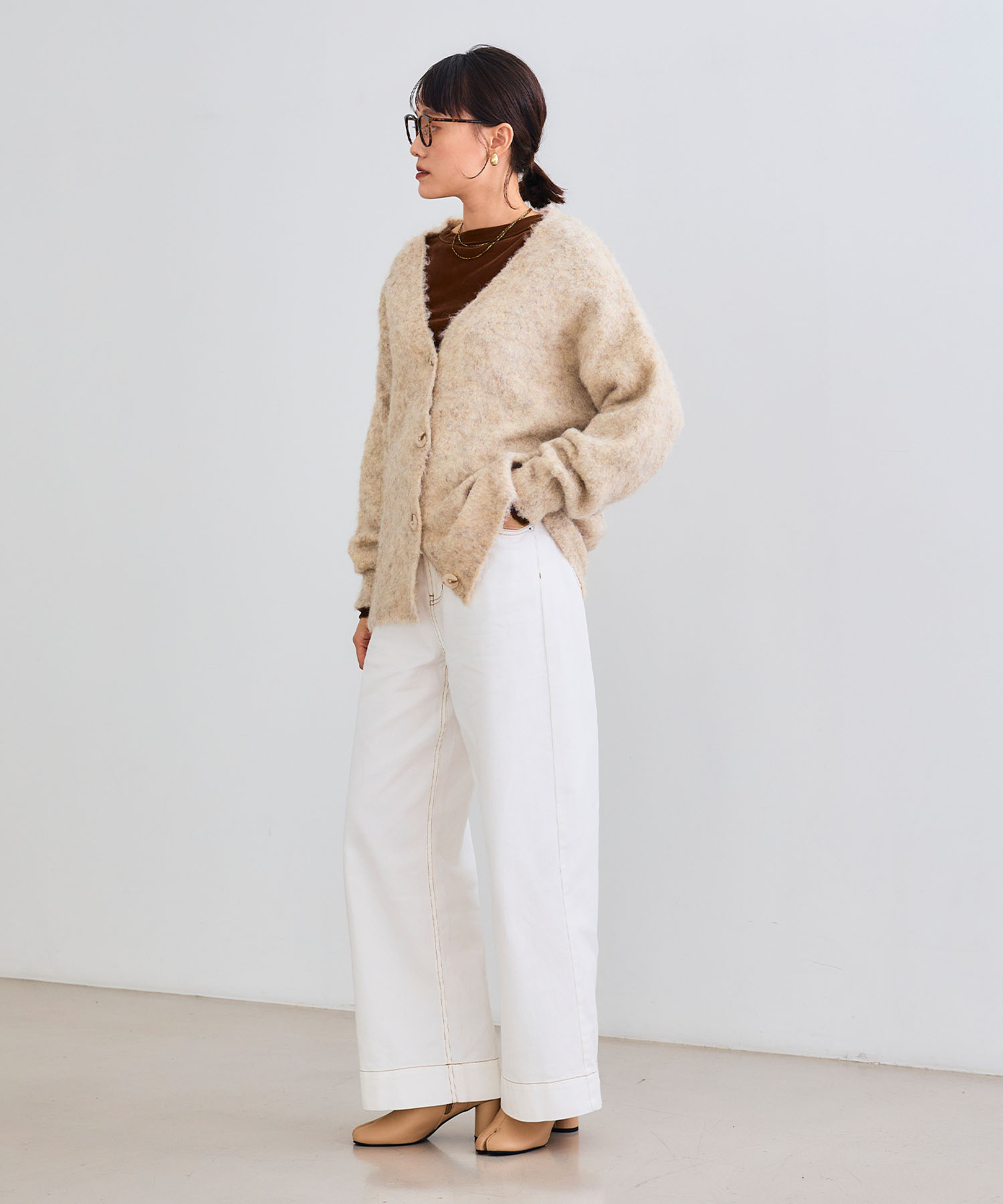 ふわふわシャギーのベージュカーディガンは、ホワイトデニムで爽やかに引き締めるのがおすすめ。大人可愛いバランスで秋の装いを軽やかに格上げします。