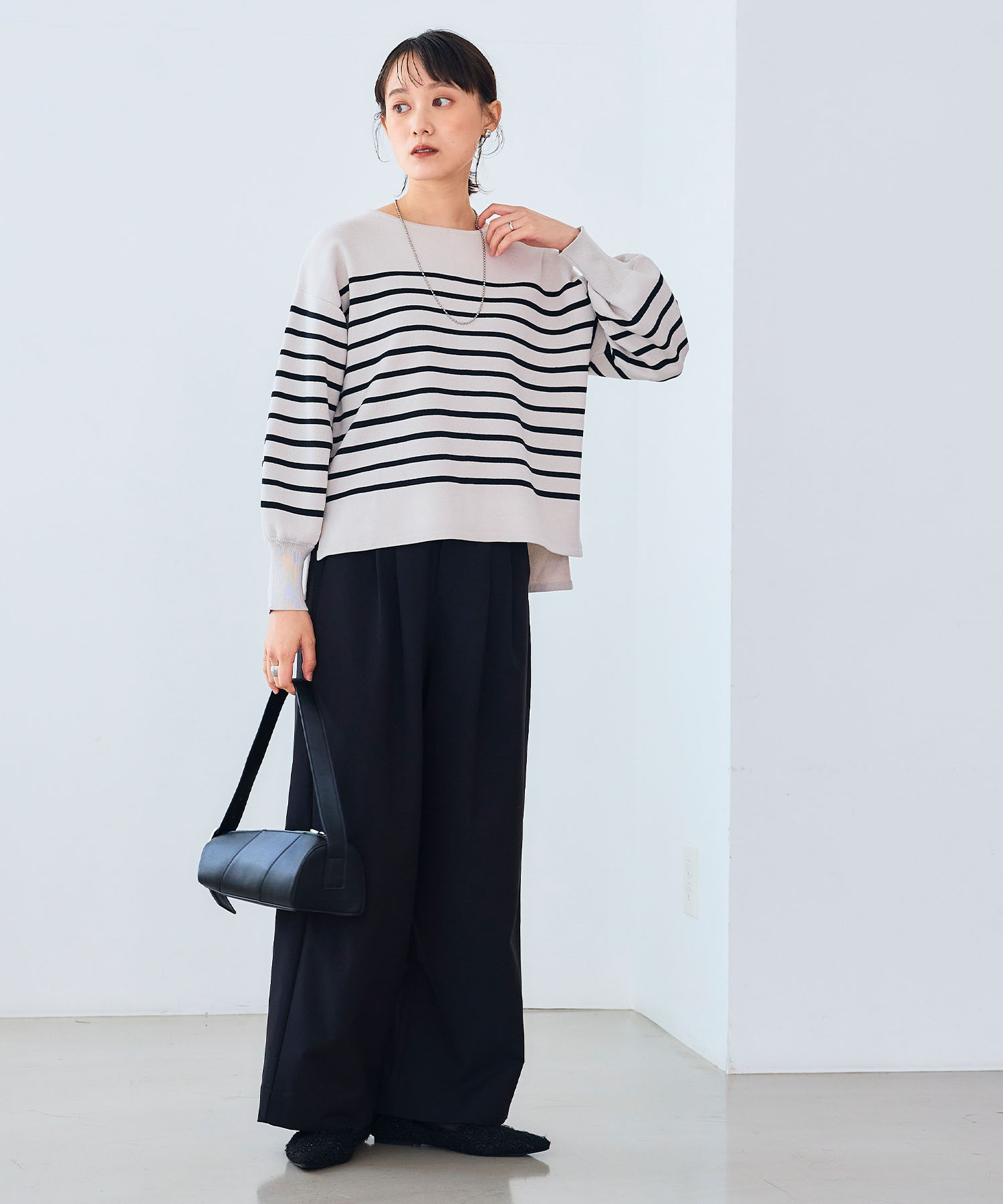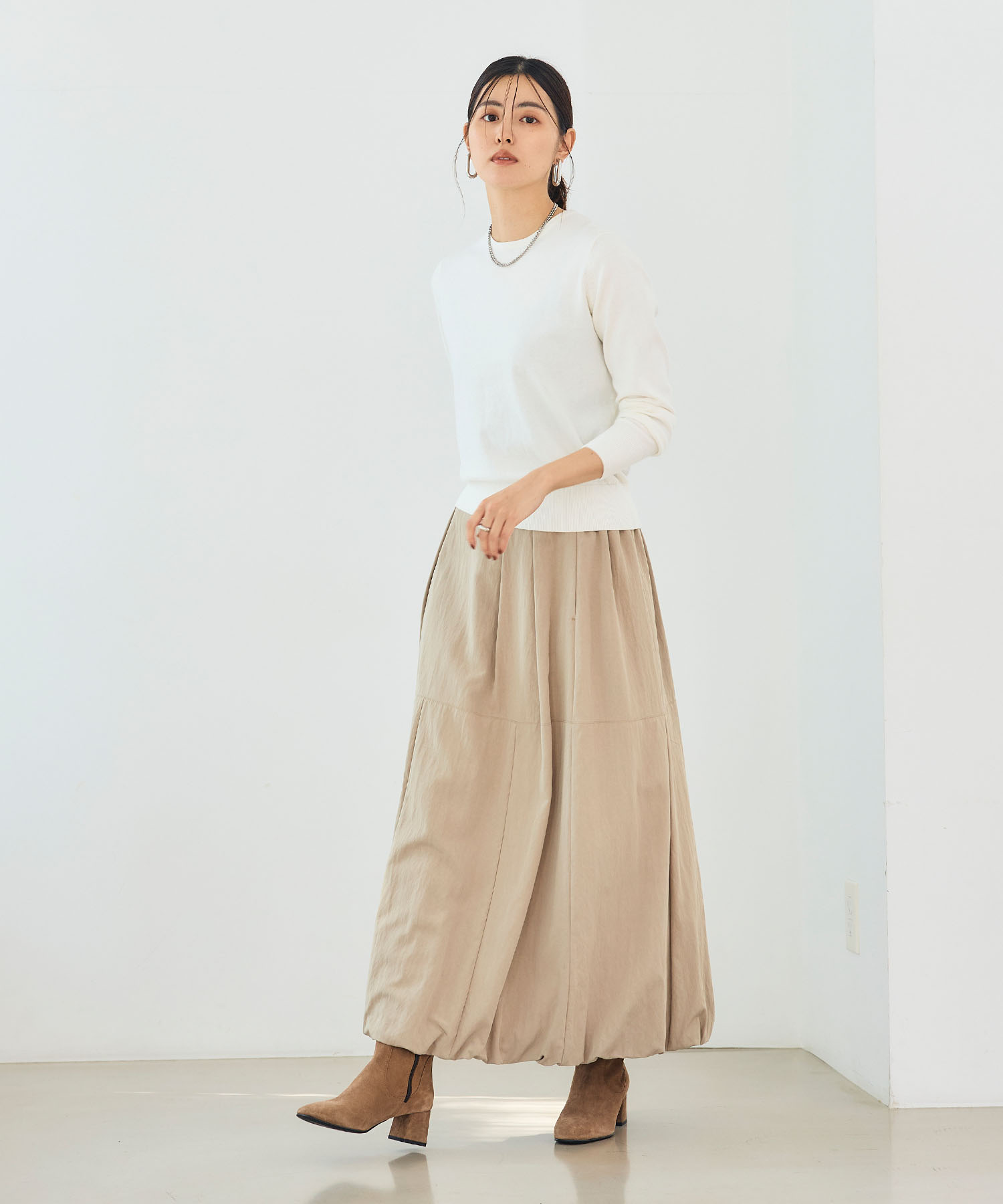 爽やかなホワイトニットを主役に、ベージュのバルーンスカートで全体を上品かつ華やかに。顔まわりを明るくし、秋の街歩き気分も自然と盛り上がります。