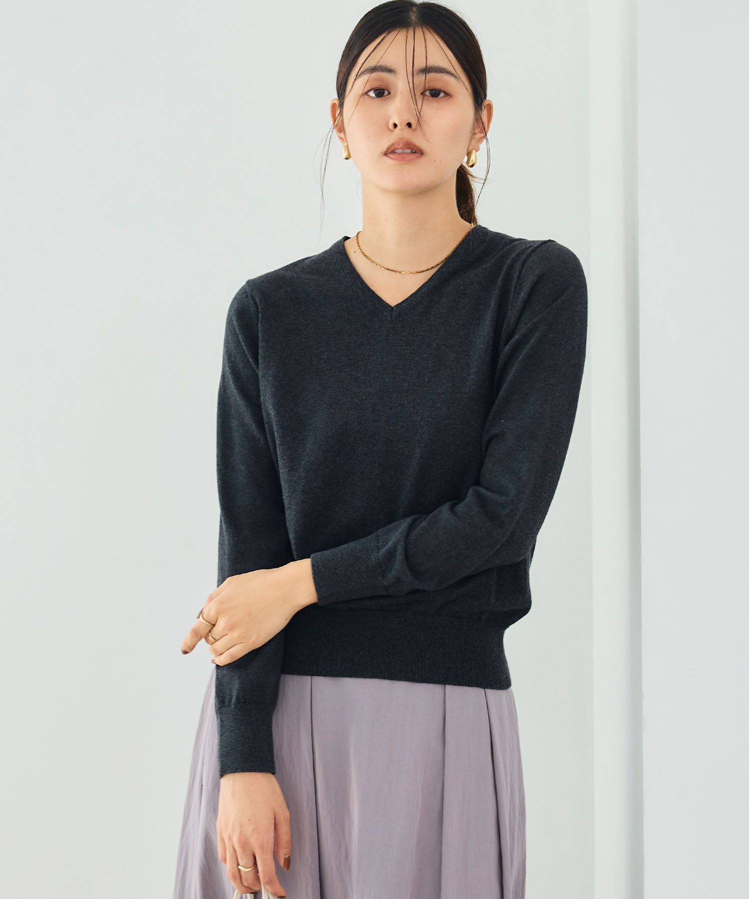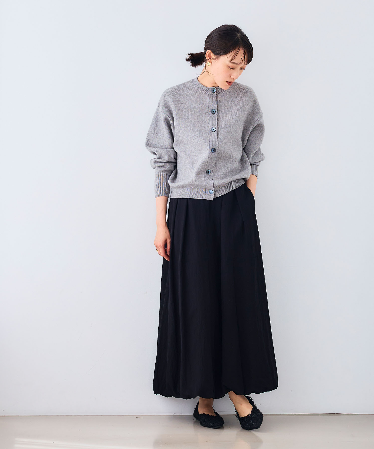 落ち着いたトーンのグレーニットは、黒のロングスカートと合わせると、シンプルながら洗練されたシックな印象に仕上がります。