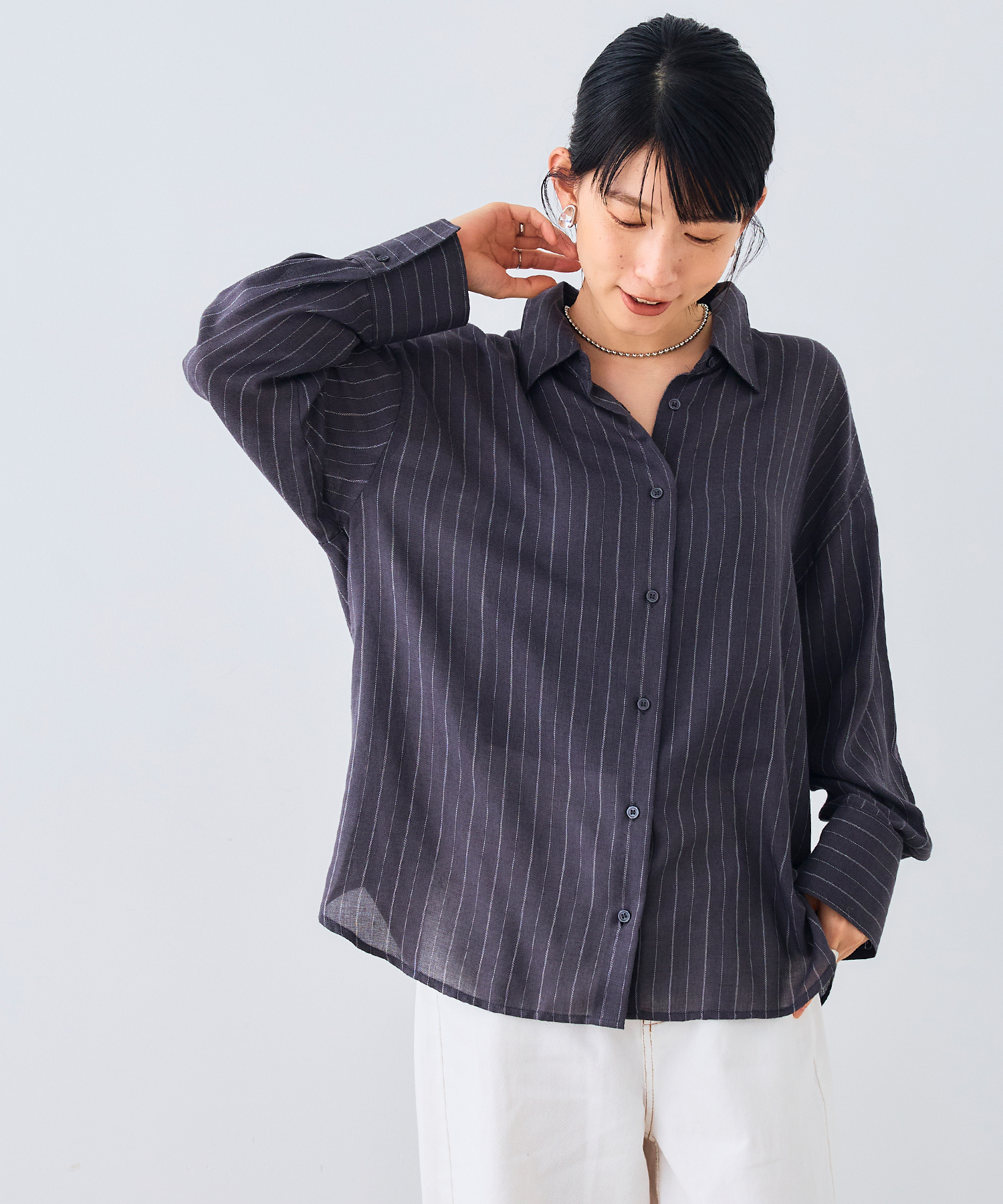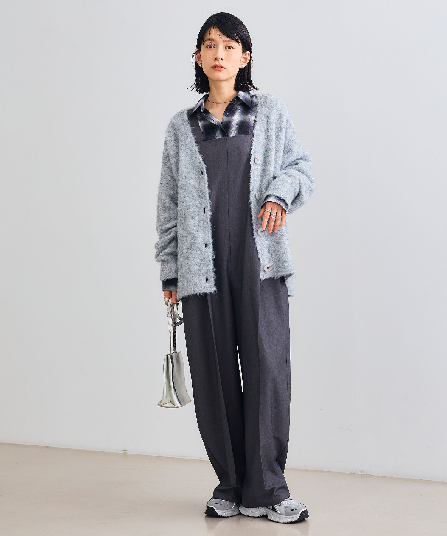 メンズライクなチェックシャツ×オールインワンのスタイルも、アイスグレーのシャギーカーデイガンをサラッと羽織れば、女性らしい優しさが加わります。