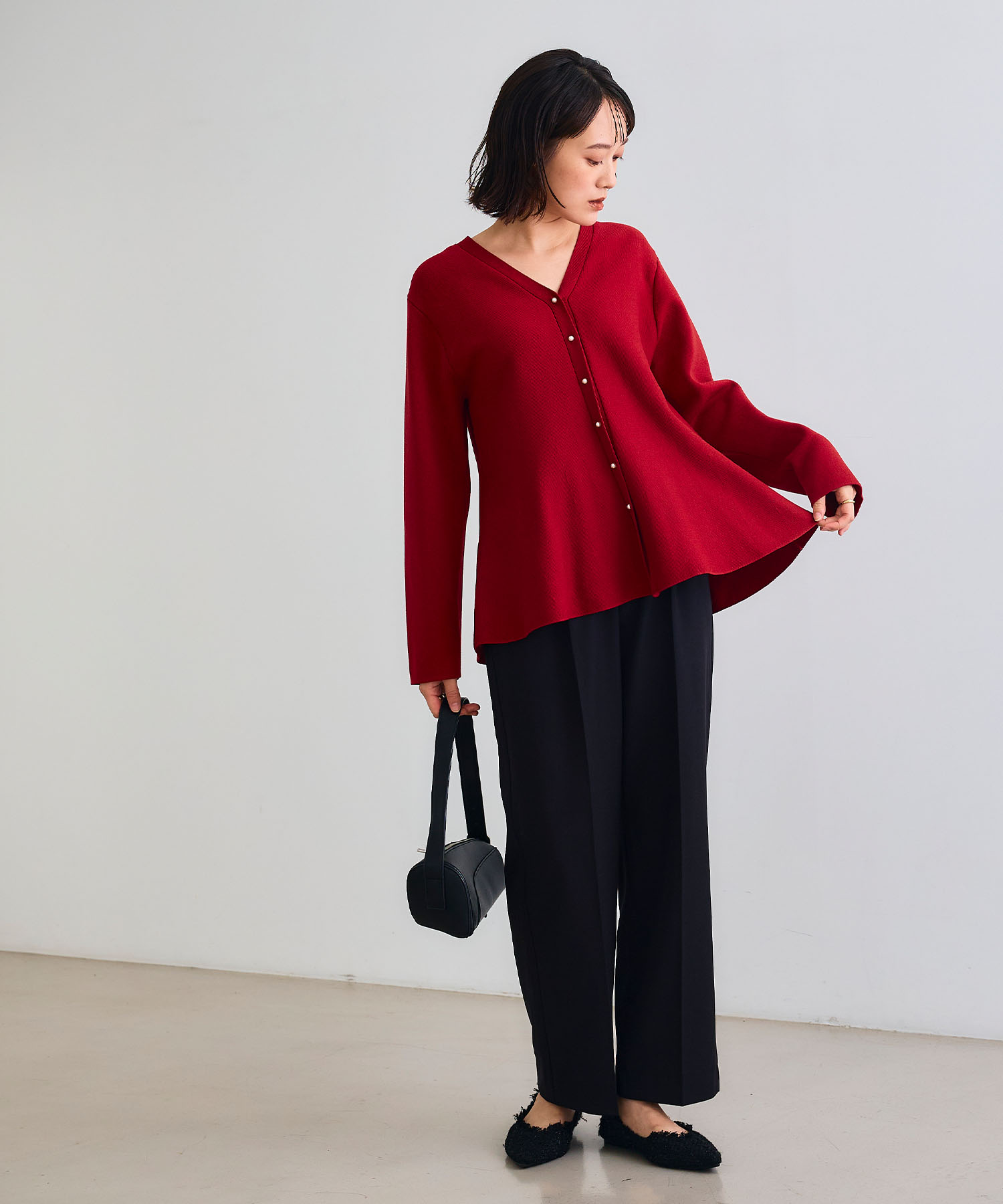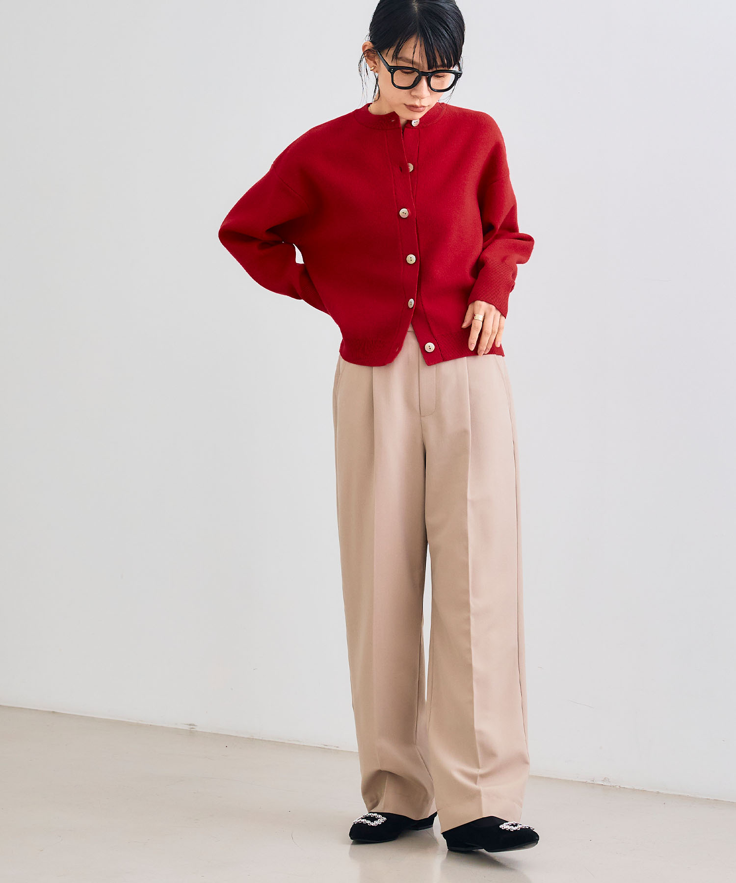 鮮やかな赤ニットは、シンプルなベージュパンツコーデがおすすめ。存在感のある赤を程よく中和し、大人の華やかさと品のある着映えを叶えます。