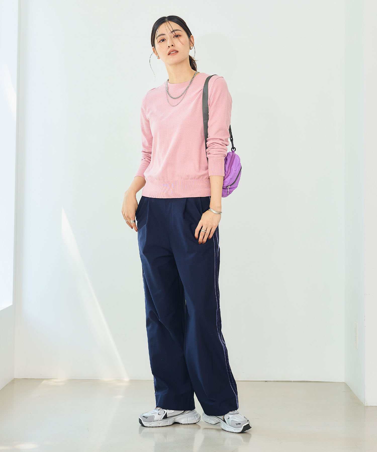 ピンクニットはネイビーのラインパンツのスポーツMIXで甘さを抑えて。甘さ×スポーティーのバランスが絶妙にマッチする、大人カジュアルが完成します。