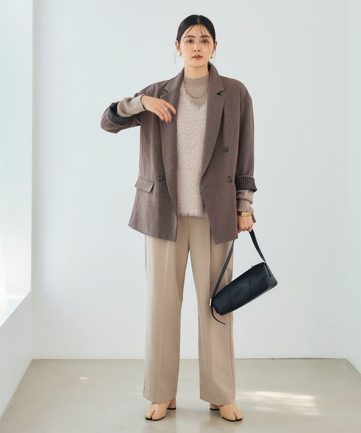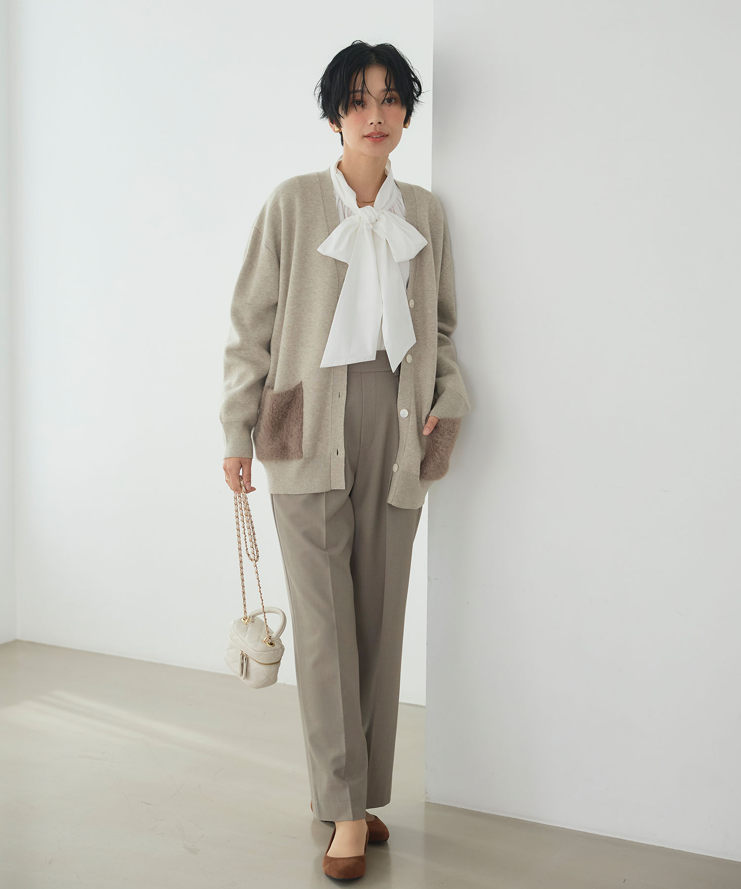 ベージュトーンの落ち着いた印象の中にリボンやファーでほどよい華やぎを添えたオフィスカジュアル。ストレートパンツのすっきりとしたシルエットが全体のバランスを自然と整え、大人らしいまとまりのあるスタイルに仕上がります。